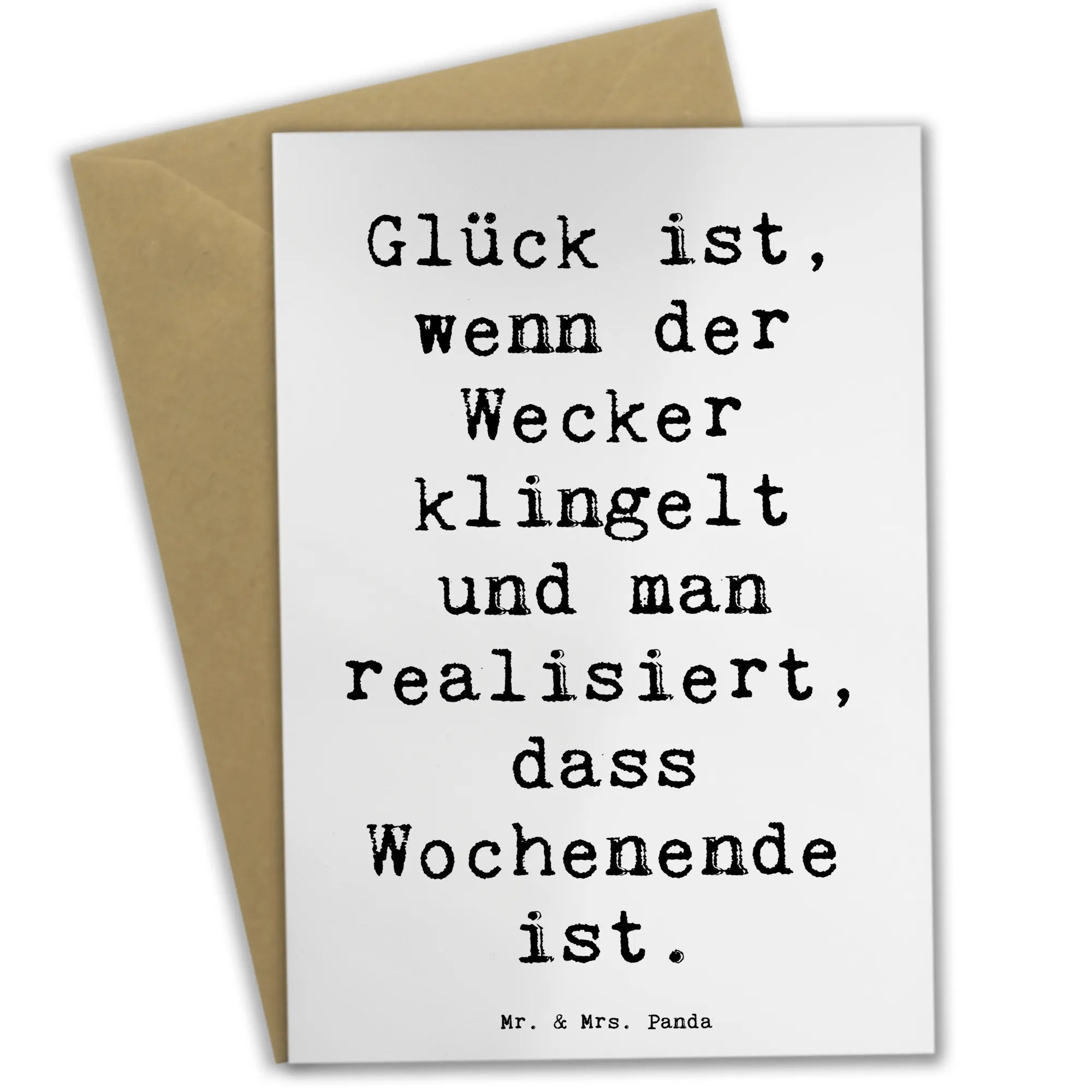 Die Vorderseite der Karte ziert der schöne Spruch: "Glück ist, wenn der Wecker klingelt und man realisiert, dass Wochenende ist.". Dieser liebevolle Spruch bringt ein Lächeln auf jedes Gesicht und vermittelt direkt gute Laune.