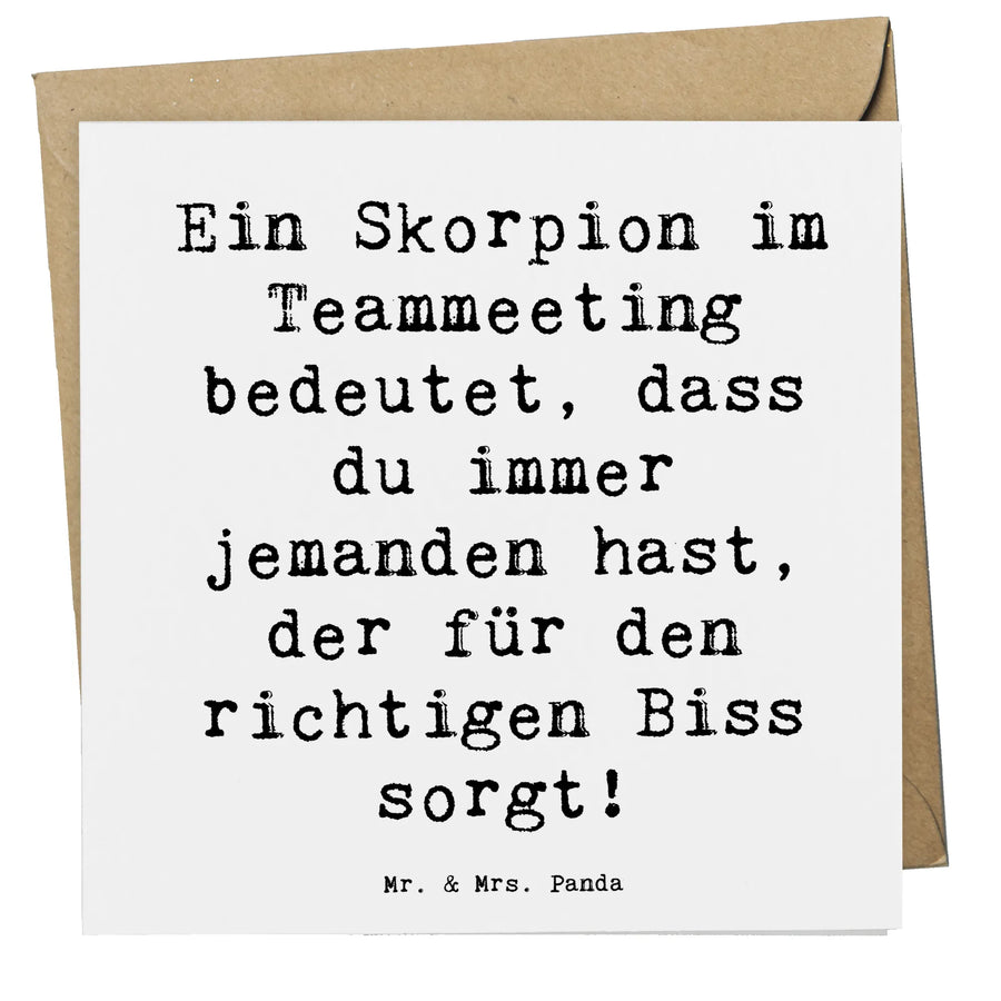 Auf der Vorderseite findet sich der humorvolle Spruch: "Ein Skorpion im Teammeeting bedeutet, dass du immer jemanden hast, der für den richtigen Biss sorgt!" Die matte Innenseite der Karte bietet ausreichend Platz für Deine individuellen Glückwünsche – perfekt für Anlässe wie Geburtstage, Hochzeiten, Jubiliäen oder einfach nur als liebevolle Nachricht für einen besonderen Menschen in Deinem Leben. Sie hat eine Größe von 140 mm x 140 mm und ist aus hochwertigem 300 Gramm Karton gefertigt, was ihr eine edle Anmutung verleiht.