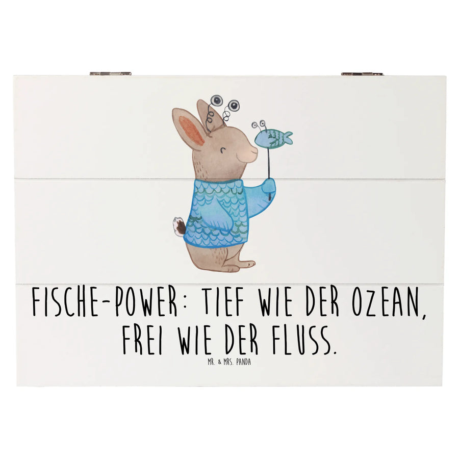 Das süße Motiv mit dem Hasen im Fischkostüm und dem Slogan "Fische-Power: Tief wie der Ozean, frei wie der Fluss." bringt ein Lächeln auf jedes Gesicht. Diese Holzkiste ist eine großartige Geschenkidee, um deinen Liebsten zum Geburtstag Freude zu bereiten oder um einfach mal Danke zu sagen.
