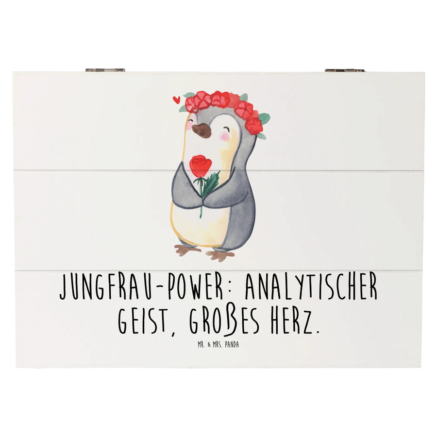 Das einzigartige Design mit dem bezaubernden Jungfrau-Motiv zeigt einen niedlichen Pinguin mit einem Blumenkranz, der eine Blume in der Flosse hält. Jedes Detail wurde von Mrs. Panda handgezeichnet und strahlt die Liebe zur Astrologie aus. Die Jungfrau-Power wird durch den Spruch "Analytischer Geist, großes Herz" perfekt unterstrichen und macht die Kiste zu einem ganz besonderen Geschenk.