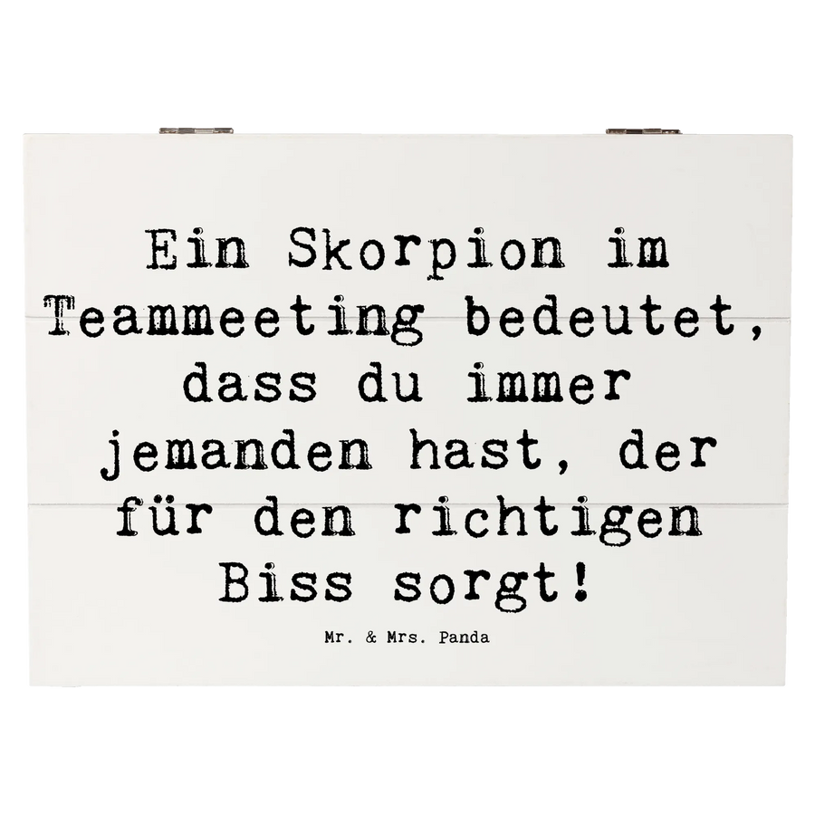 Die Kiste ist aus robuster Holzfaser gefertigt, die sowohl langlebig als auch umweltfreundlich ist. Mit ihrer edlen und stabilen Bauweise wird sie garantiert zum liebevollen Begleiter in jedem Zuhause. Der Slogan "Ein Skorpion im Teammeeting bedeutet, dass du immer jemanden hast, der für den richtigen Biss sorgt!" verleiht der Kiste eine humorvolle Note und sorgt dafür, dass sie nicht nur praktisch ist, sondern auch Freude bereitet.