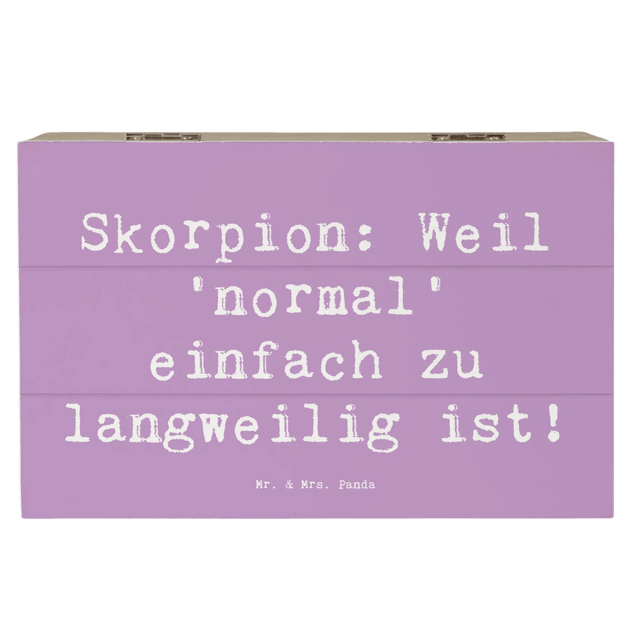 Du suchst nach dem perfekten Geschenk für einen Skorpion? Unsere wunderschöne Holzkiste von Mr. & Mrs. Panda ist genau das, was du brauchst! Mit dem liebevoll handgezeichneten Motiv des Skorpions und dem witzigen Spruch 'Skorpion: Weil "normal" einfach zu langweilig ist!' wird diese Erinnerungskiste zum absoluten Highlight in jedem Raum.