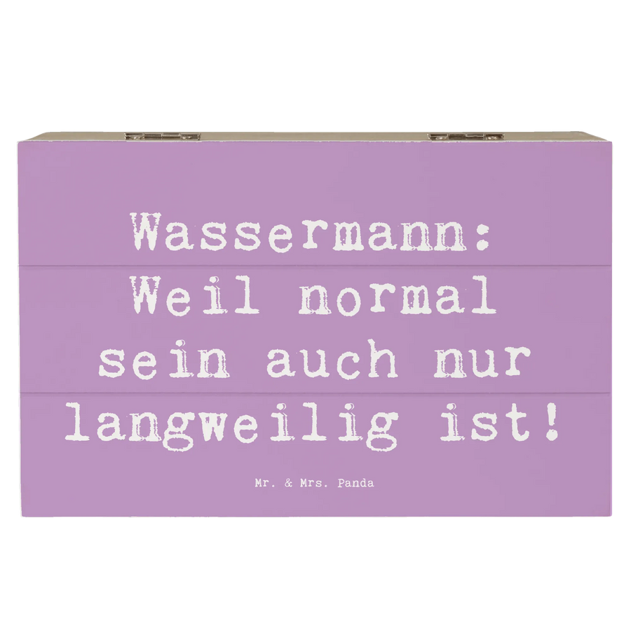 Das Design dieser Kiste ist besonders auffällig: Auf der Vorderseite prangt der Spruch „Wassermann: Weil normal sein auch nur langweilig ist!“, der liebevoll von Mrs. Panda handgezeichnet wurde. Diese Botschaft zaubert jedem ein Lächeln ins Gesicht und zeigt, dass Individualität manchmal einfach genial ist.