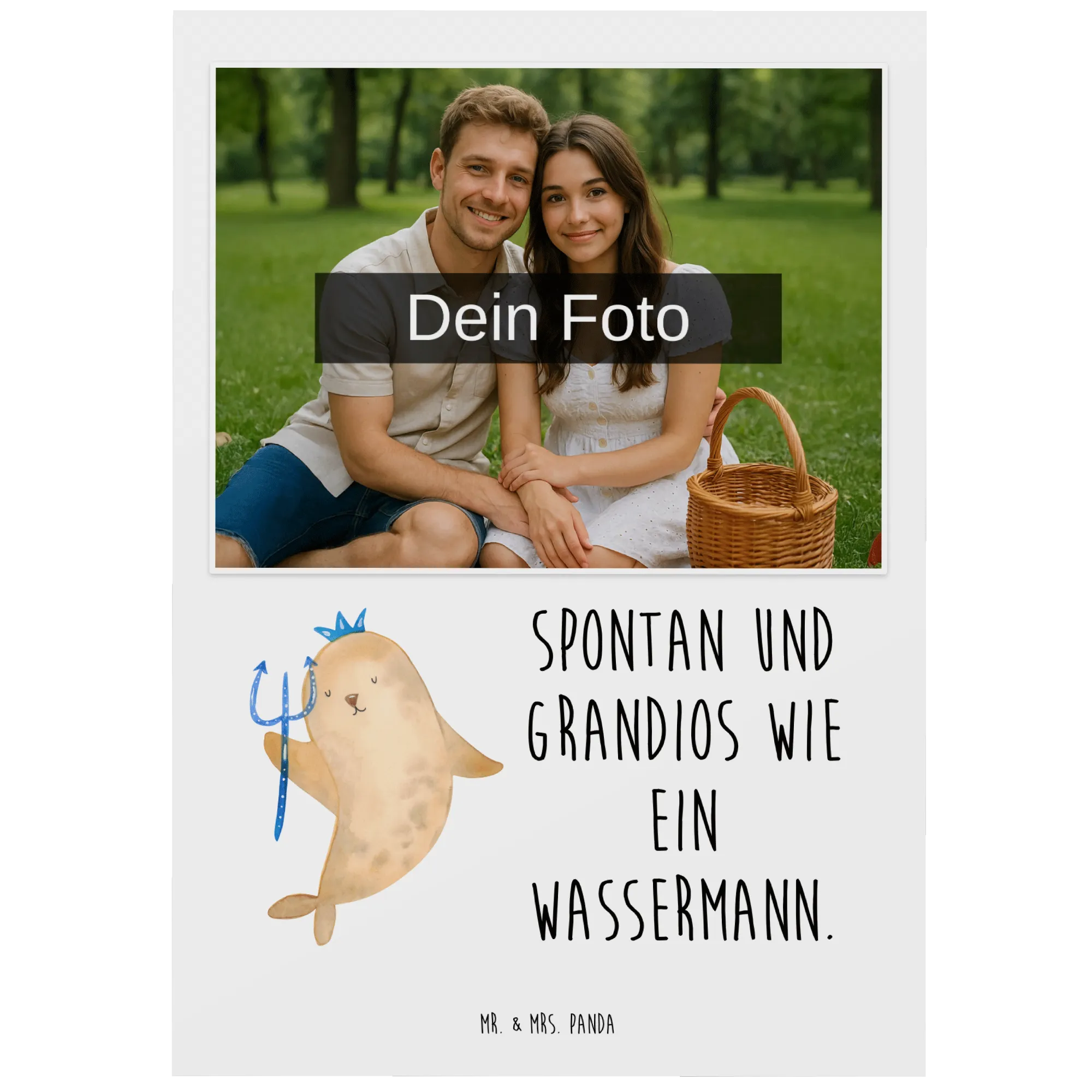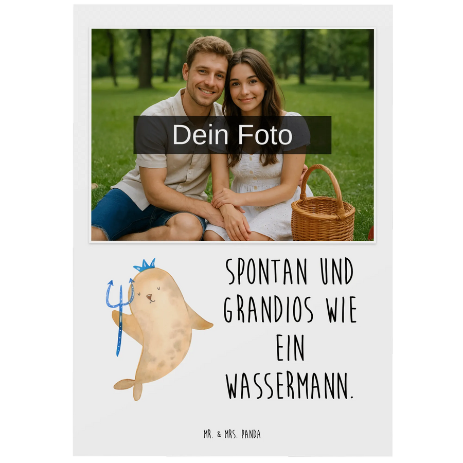 Die personalisierte Foto Postkarte mit dem entzückenden Motiv Sternzeichen Wassermann von Mr. & Mrs. Panda ist das perfekte Geschenk für alle Wassermann-Geborenen! Ob zum Geburtstag im Januar oder Februar, zu besonderen Anlässen oder einfach so, diese Postkarte bringt ein Lächeln ins Gesicht. Mit dem Slogan „Spontan und grandios wie ein Wassermann“ kannst du deine Wertschätzung und Zuneigung auf eine charmante Art ausdrücken!
