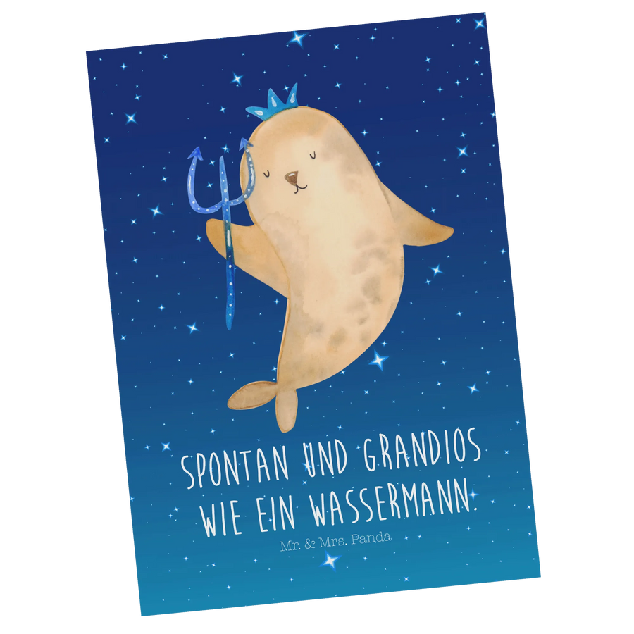 Entdecke die zauberhafte Postkarte mit dem Sternzeichen Wassermann von Mr. & Mrs. Panda! Diese einzigartige Postkarte ist nicht nur wunderschön gestaltet, sondern auch perfekt für alle, die das Sternzeichen Wassermann feiern. Ob als Geburtstagskarte für einen Wassermann-Geburtstag im Januar oder Februar oder einfach nur als liebevolle Geste für Freunde – diese Karte kommt immer gut an. Der Wassermann wird hier ganz charmant in Form einer Robbe mit einer Krone und einem Zepter präsentiert, und der Spruch "Spontan und grandios wie ein Wassermann." beschreibt ihn perfekt!