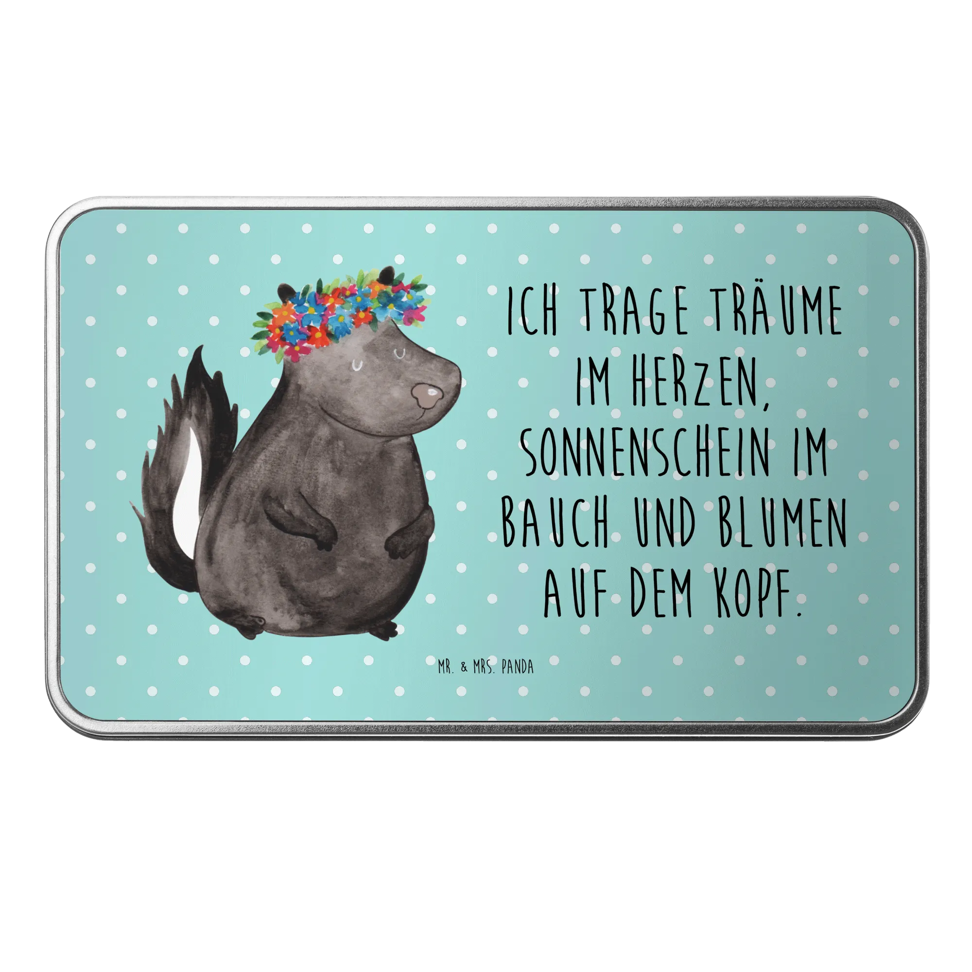 Das süße Stinktier, das mit einem bunten Blumenkranz geschmückt ist, bringt Wärme und Freude in jedes Zuhause. Es symbolisiert die Schönheit der Natur und erfüllt jeden Raum mit positiver Energie. Mit einem Slogan, der sagt: "Ich trage Träume im Herzen, Sonnenschein im Bauch und Blumen auf dem Kopf", ist diese Metalldose nicht nur ein schöner Anblick, sondern auch eine liebevolle Erinnerung an die kleinen Dinge im Leben.