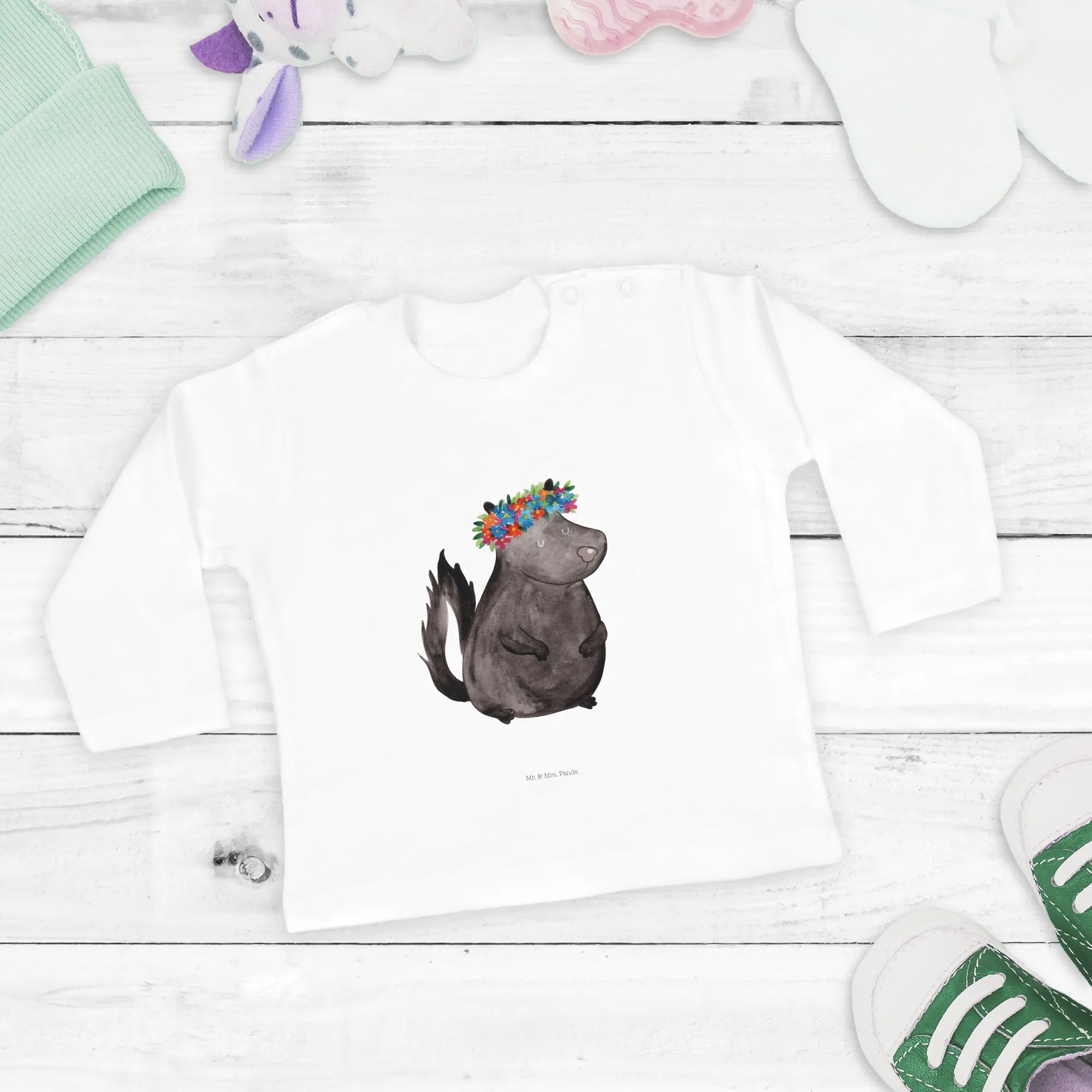 Das 6-12 Monate Baby Longsleeve mit dem zauberhaften Stinktier Blumenmädchen Motiv aus der Stinktier Kollektion von Mr. & Mrs. Panda ist nicht nur ein modisches Highlight, sondern auch ein liebevolles Geschenk für die Kleinsten in Deinem Leben.