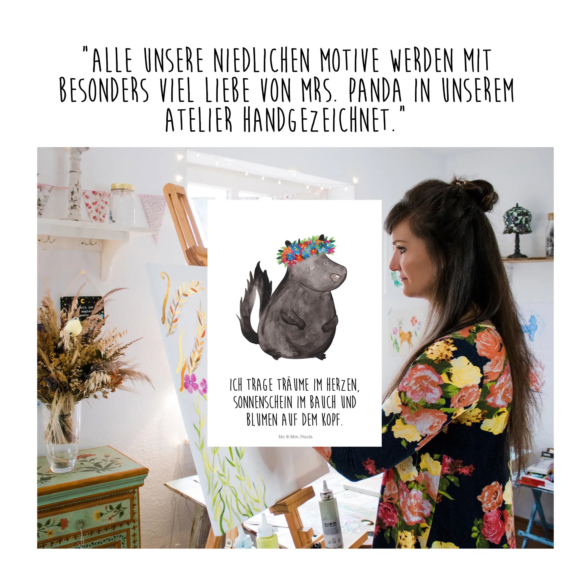 Dieses wunderschöne Stinktier Blumenmädchen ist nicht nur ein niedlicher Anblick, sondern symbolisiert auch die Fröhlichkeit und den Mut, Träume zu verwirklichen. Mit ihrem bunten Blumenkranz strahlt sie Lebensfreude aus und lädt uns ein, das Leben mit einem Lächeln zu genießen. Ihr Motto "Ich trage Träume im Herzen, Sonnenschein im Bauch und Blumen auf dem Kopf" erinnert uns daran, dass wir unsere Träume nie aus den Augen verlieren sollten. Lass dich von diesem charmanten Wildtier inspirieren, deinen eigenen Weg zu gehen und die Welt mit deiner positiven Energie zu bereichern. Perfekt für alle, die die Natur lieben und die Schönheiten des Lebens schätzen. Ob als Deko-Element oder als Geschenk für einen geliebten Menschen – dieses Motiv bringt den Frühling in jedes Zuhause.