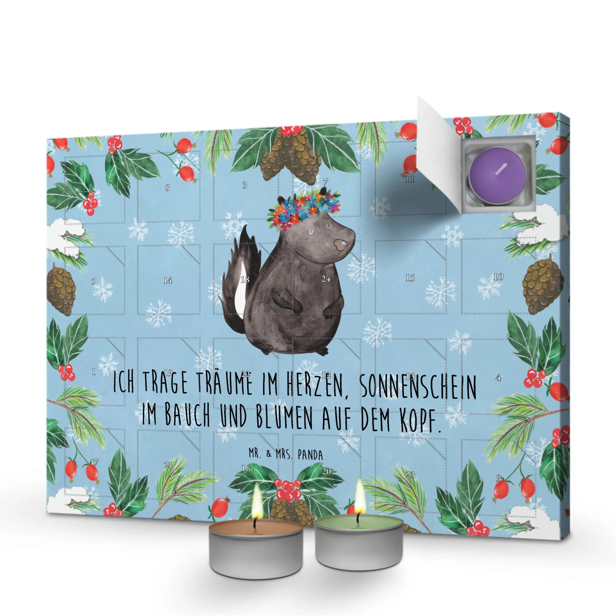 Der Duftkerzen Adventskalender Stinktier Blumenmädchen von Mr. & Mrs. Panda ist das perfekte Geschenk für alle, die die besinnliche Zeit des Advents lieben. Er ist nicht nur ein wunderschöner Adventskalender, sondern auch ein kleines Stückchen Glück, das jeden Tag einen neuen Duft enthüllt. Du wirst sehen, wie sich die Wohnung mit dem einzigartigen Aroma von Vanille, Lavendel, grünem Tee, Apfel-Zimt, Granatapfel und Oud Wood erfüllt.