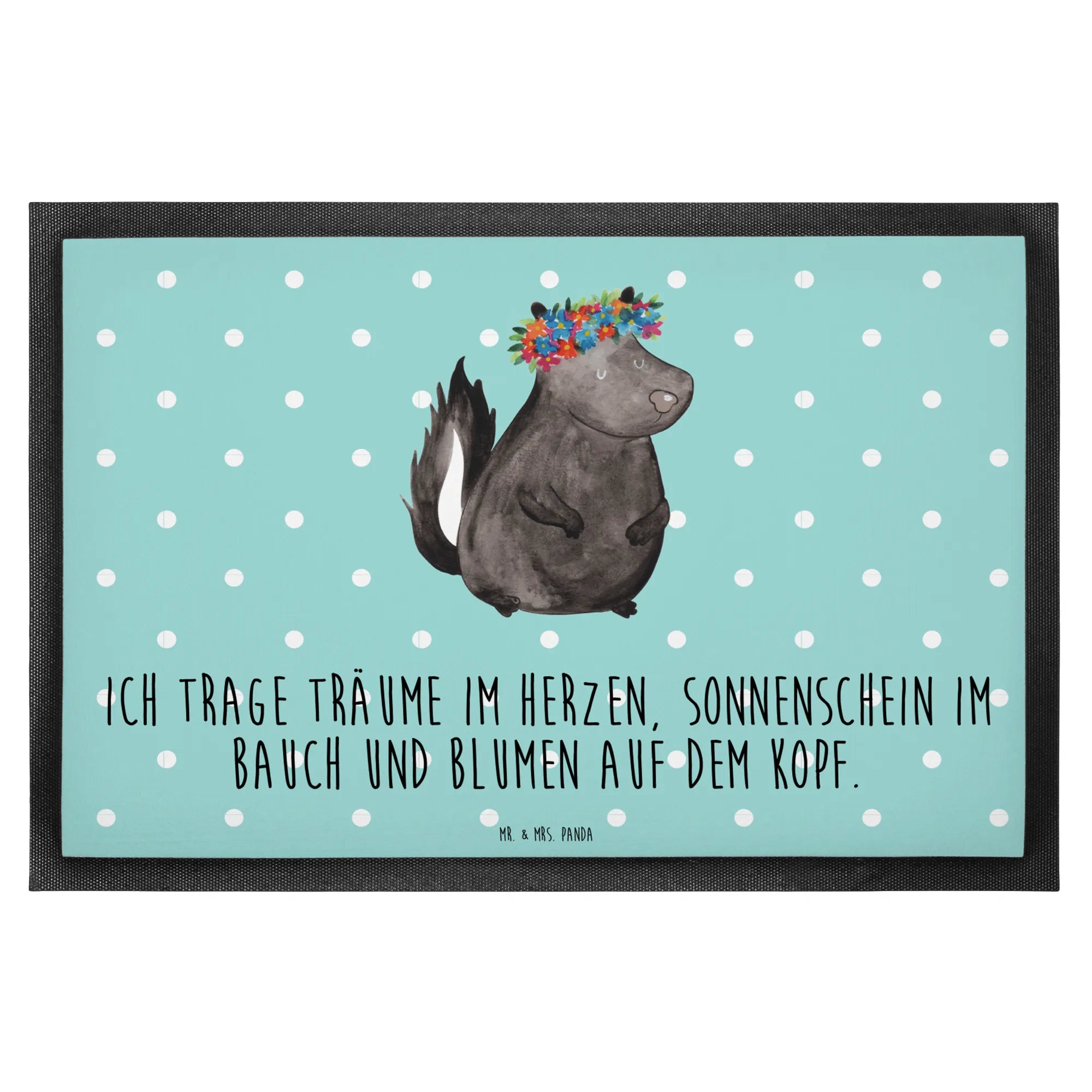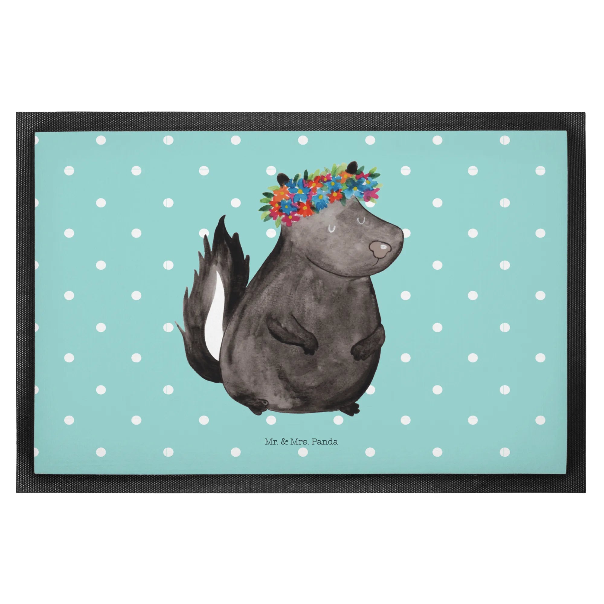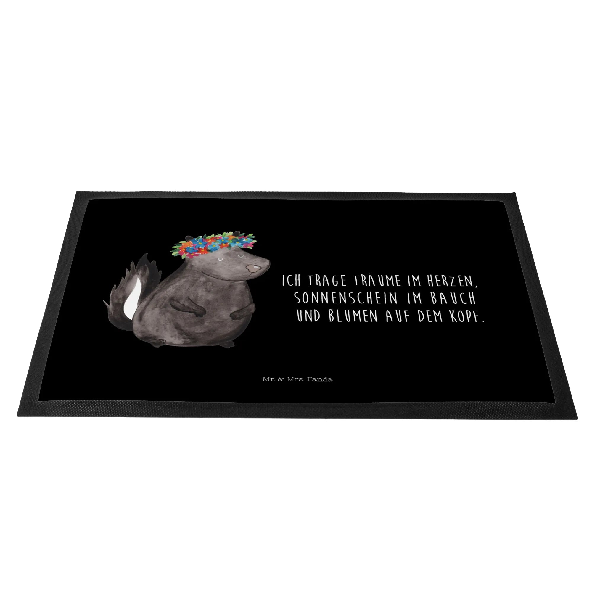 Suchst du nach einem ganz besonderen Geschenk für Freunde oder Familie? Unsere Fußmatte "Stinktier Blumenmädchen" aus der Stinktier-Kollektion von Mr. & Mrs. Panda ist nicht nur ein praktischer Schmutzfänger, sondern auch ein echtes Kunstwerk! Das süße Stinktier, das fröhlich mit einem bunten Blumenkranz auf dem Kopf lächelt, bringt ganz viel Freude in jeden Eingangsbereich. Unten das robuste Gummi sorgt dafür, dass die Matte rutschfest und stabil bleibt – ideal für deinen Eingangsbereich oder die Terrasse.
