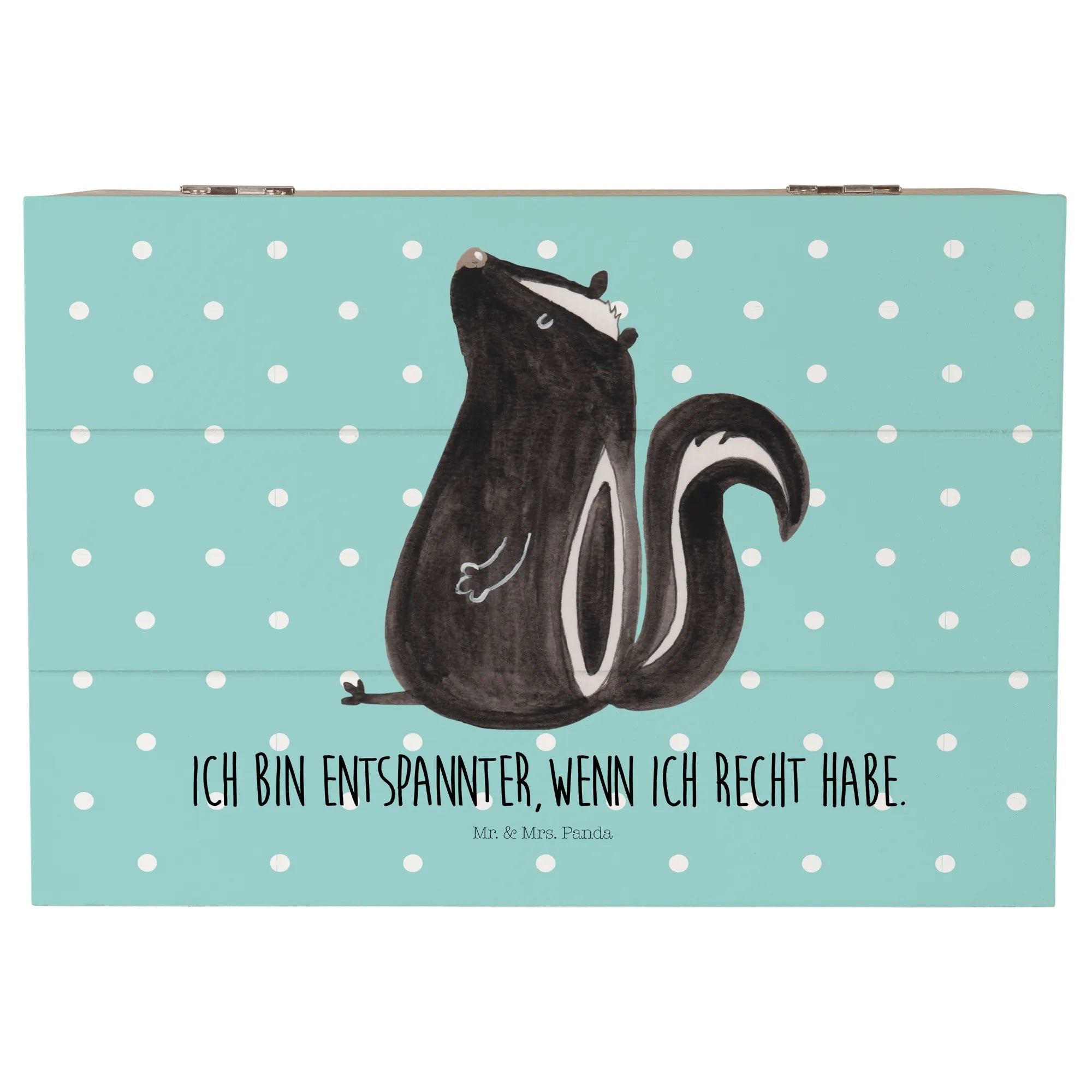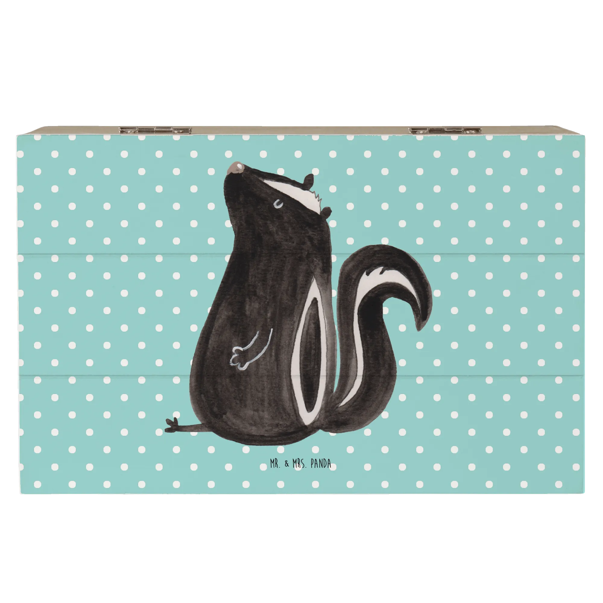 Ob für einen besonderen Menschen oder einfach für dich selbst, diese Kiste wird garantiert Freude bereiten! Der sanfte, türkise Hintergrund verstärkt das fröhliche Design und lässt das Stinktier wunderbar zur Geltung kommen. Verwöhne deine Liebsten mit einem Geschenk, das nicht nur praktisch, sondern auch voller Herz ist. Pflege die Kiste einfach mit einem feuchten Tuch. Diese Holzkiste ist ein kleines Kunstwerk für jeden, der das Besondere liebt und eine Schwäche für gute Sprüche hat.