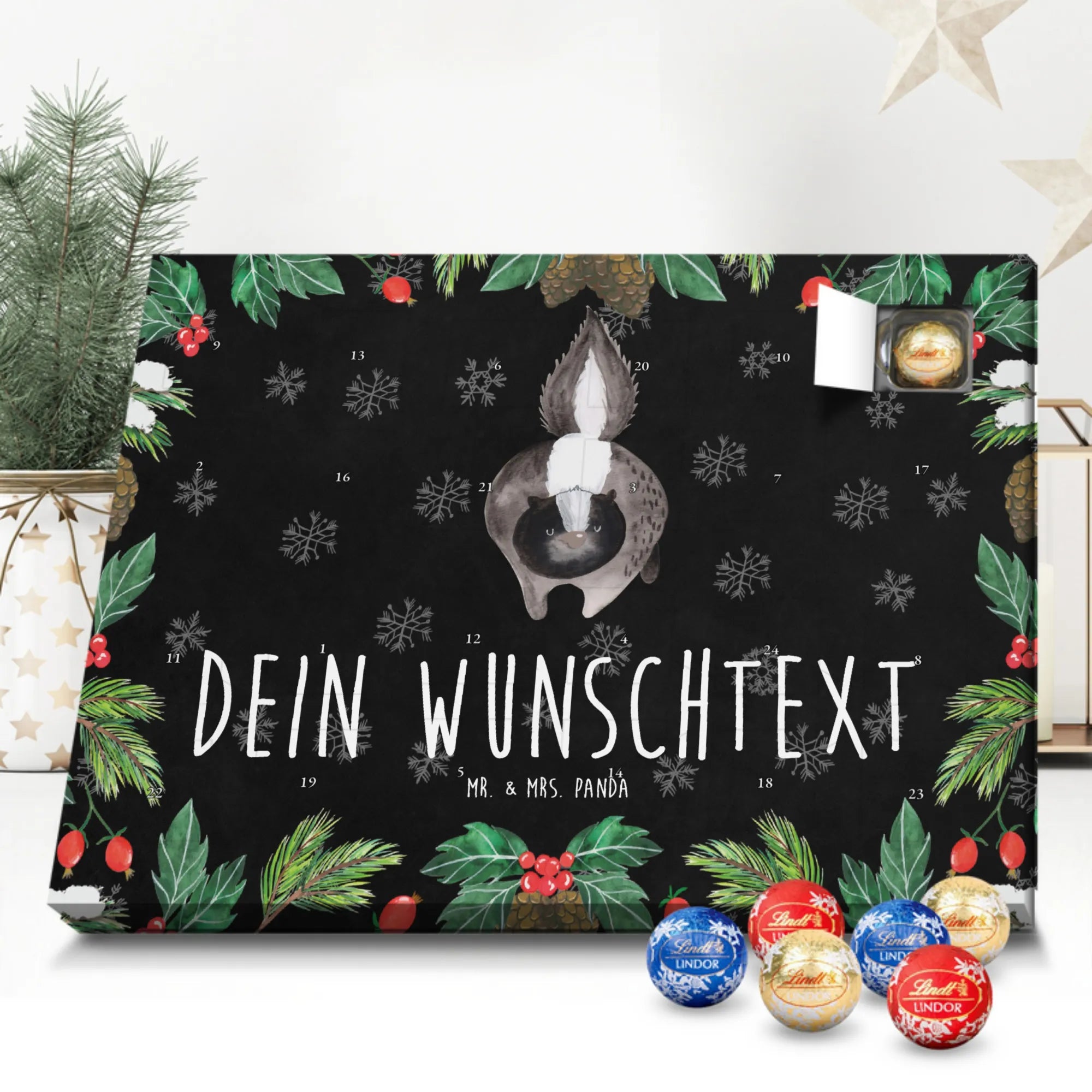 Personalisierter Adventskalender mit Schokolade von Mr. & Mrs. Panda – ein fröhlicher Blickfang in der Adventszeit! Der Kalender ist liebevoll gestaltet und bedruckt mit zauberhaften Motiven und positiven Sprüchen aus der Mr. & Mrs. Panda Kollektion. Du kannst ihn mit deinem Wunschnamen oder einem kurzen Wunschtext personalisieren, sodass jedes Türchen eine persönliche Botschaft trägt. Die brillante Druckqualität und die seidenmatte Oberflächenveredelung machen das Design besonders hochwertig, und die bedruckten Seitenflächen runden das Gesamtbild ab. Maße: 233 mm x 178 mm x 24 mm. Flexibel einsetzbar: entweder aufgehängt oder einfach aufgestellt – so wie es dir gefällt. Gefüllt mit Lindt Lindor Schokolade: 24 einzeln verpackte Markenschokoladen Kugeln in drei beliebten Sorten. Geschmacksrichtungen: Vollmilch, Feinherb und Weiße Schokolade. Zutaten: Zucker, pflanzliches Fett (Kokosnuss, Palmkern), Kakaobutter, Vollmilchpulver, Kakaomasse, Milchzucker, Magermilchpulver, Butterreinfett, Emulgator (Sojalecithin), Gerstenmalzextrakt, Aromen. Besondere Hinweise: Kann Haselnüsse und Mandeln enthalten. Verschenke Vorfreude und kleine Genussmomente – individuell, liebevoll und köstlich.