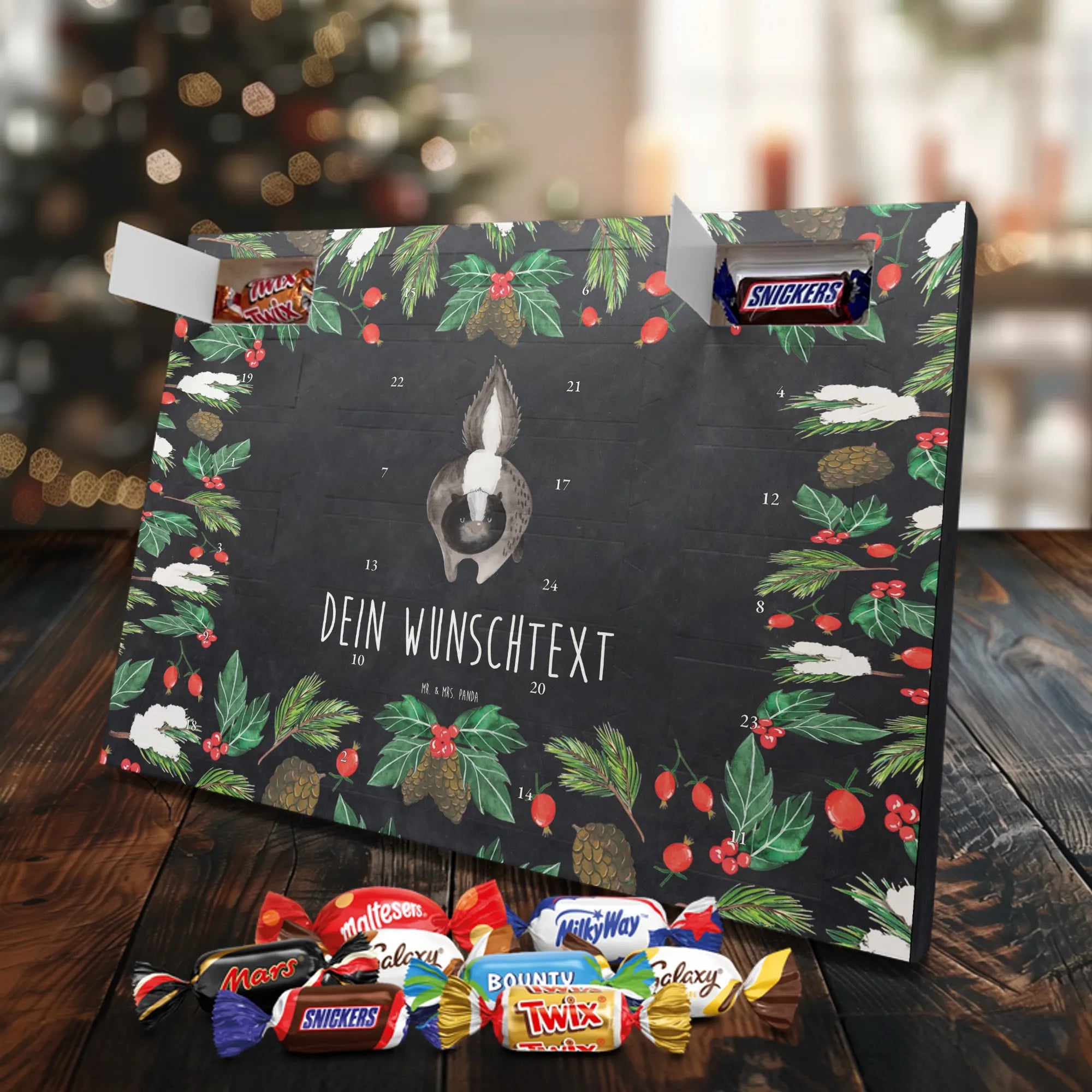Schoko Adventskalender personalisiert von Mr. & Mrs. Panda – eine besonders liebevolle Geschenkidee für die Adventszeit. Unser Design vereint niedliche Illustrationen und herzliche Sprüche, die wir selbstverständlich mit deinem Wunschtext oder Namen personalisieren. Die brillante Druckqualität wird durch eine seidenmatte Oberflächenveredelung unterstrichen, die Farben und Details wunderschön zur Geltung bringt. Zusätzlich sind die Seitenflächen bedruckt, sodass das Motiv rundum stimmig ist. Du kannst den Kalender entweder aufhängen oder aufstellen – je nachdem, wo die Vorfreude am besten zur Geltung kommt. Gefüllt ist der Kalender mit Celebrations: 24 hochwertige Füllungen in 8 leckeren Sorten wie Maltesers, Mars, Snickers, Twix, Milky Way, Bounty, Galaxy und Galaxy Caramel sorgen für abwechslungsreiche Genussmomente. Maße: 325 mm x 225 mm x 27 mm – ein handliches Format, das trotzdem viel Platz für süße Überraschungen bietet. Ob als Geschenk für Freunde, Familie oder als kleine Verwöhnung für dich selbst: Dieser personalisierte Schoko Adventskalender bringt täglich Freude und ist mit ganz viel Herz gestaltet.