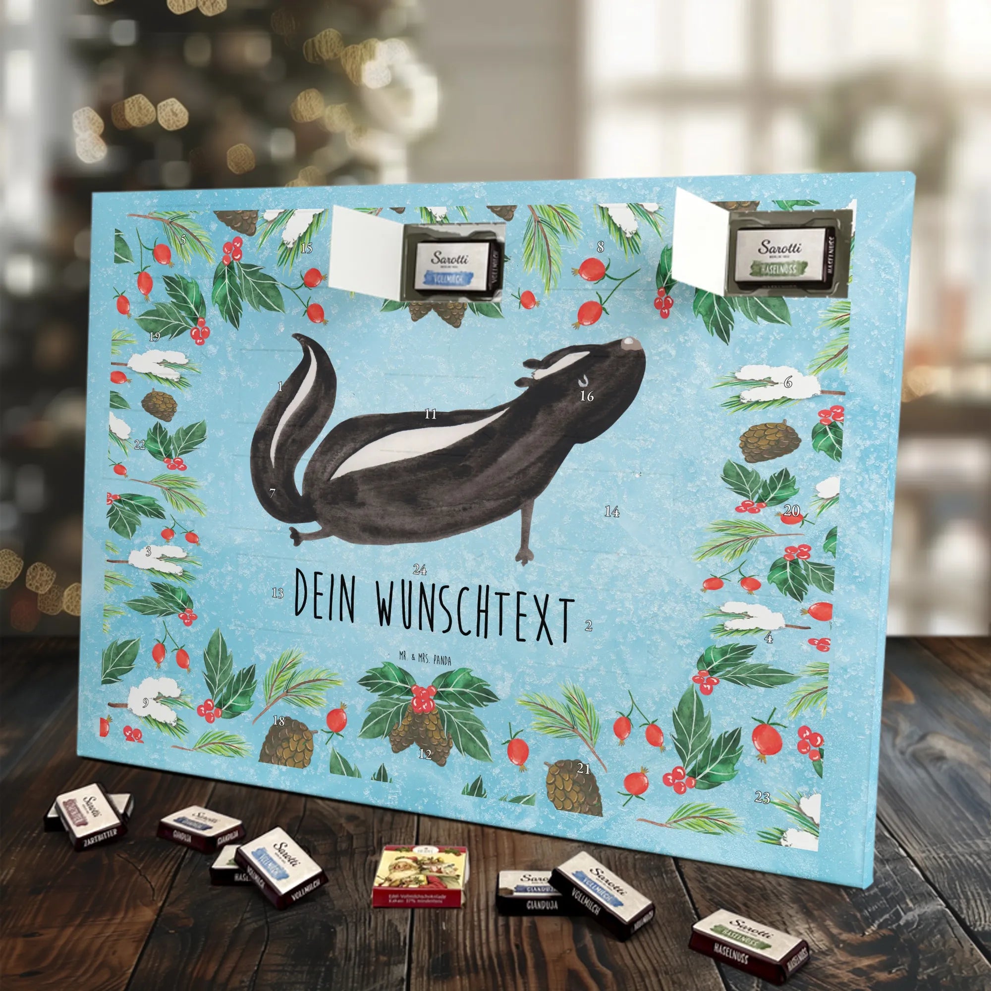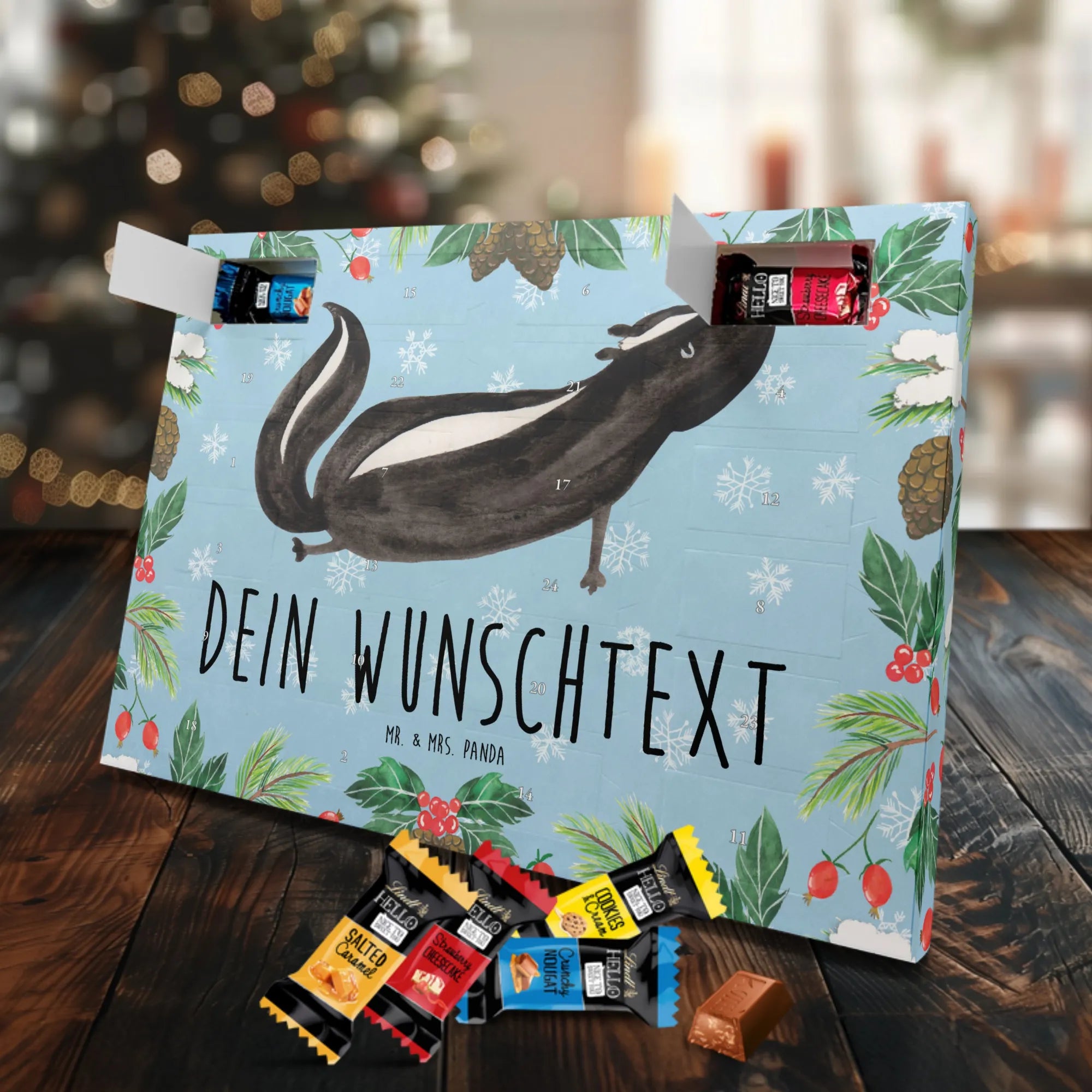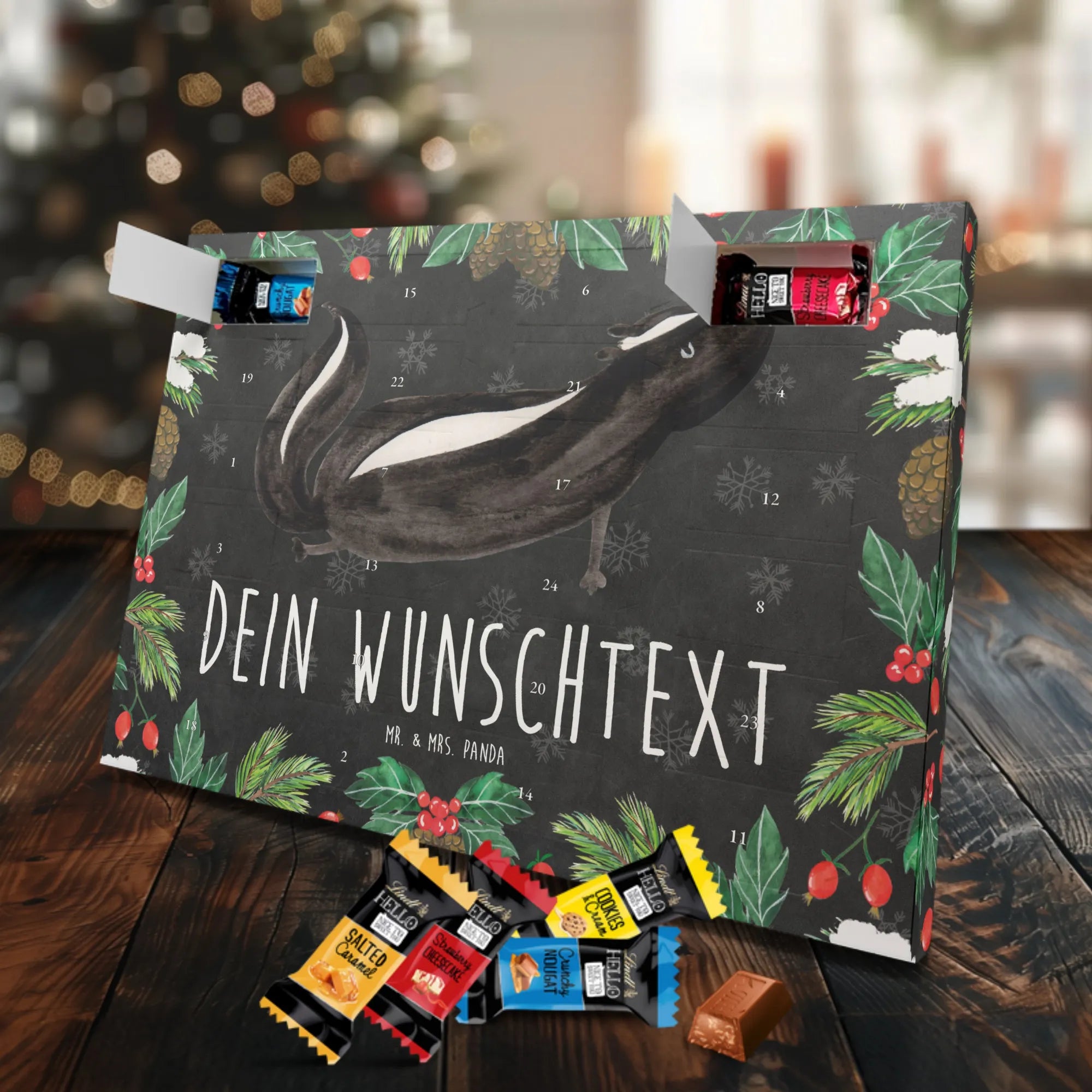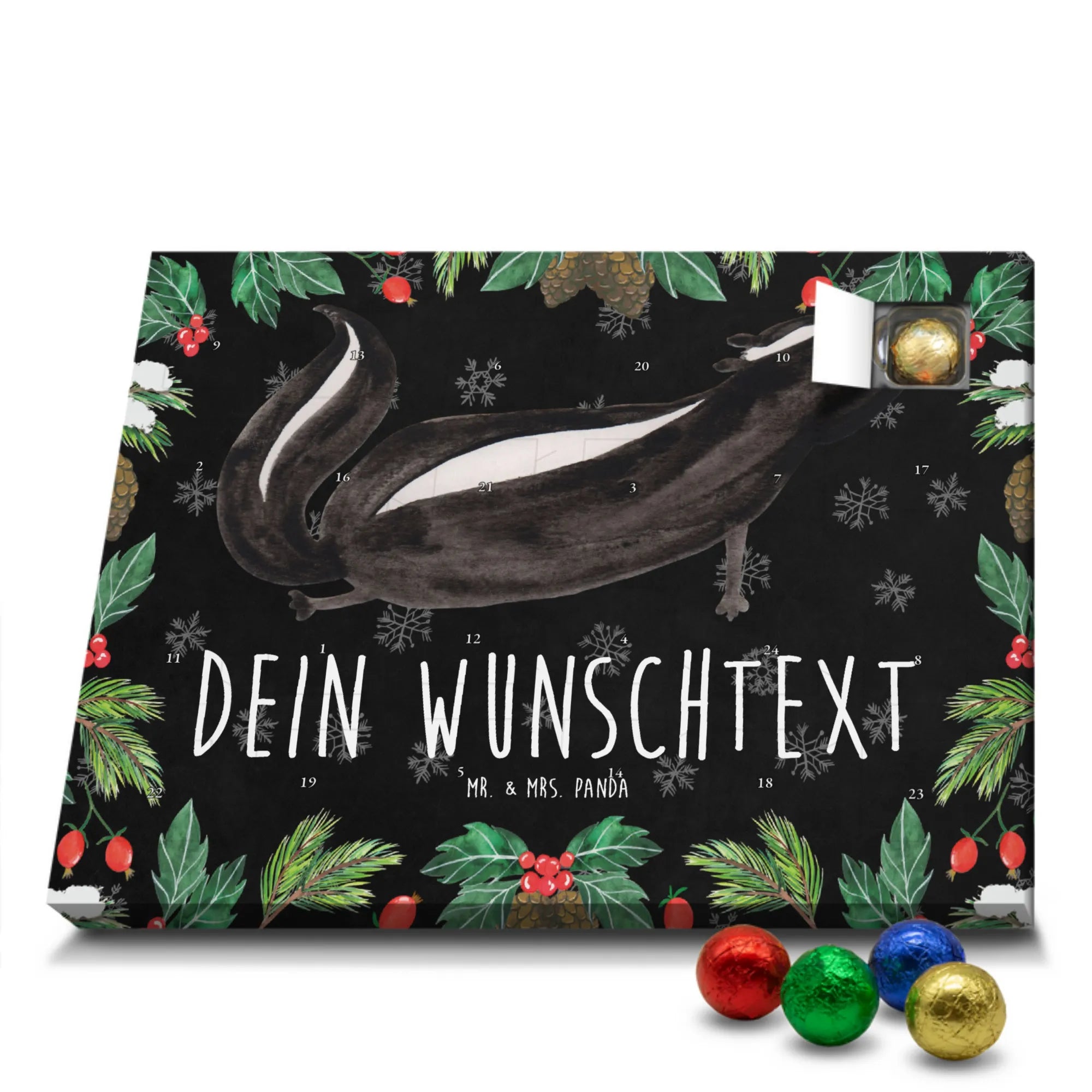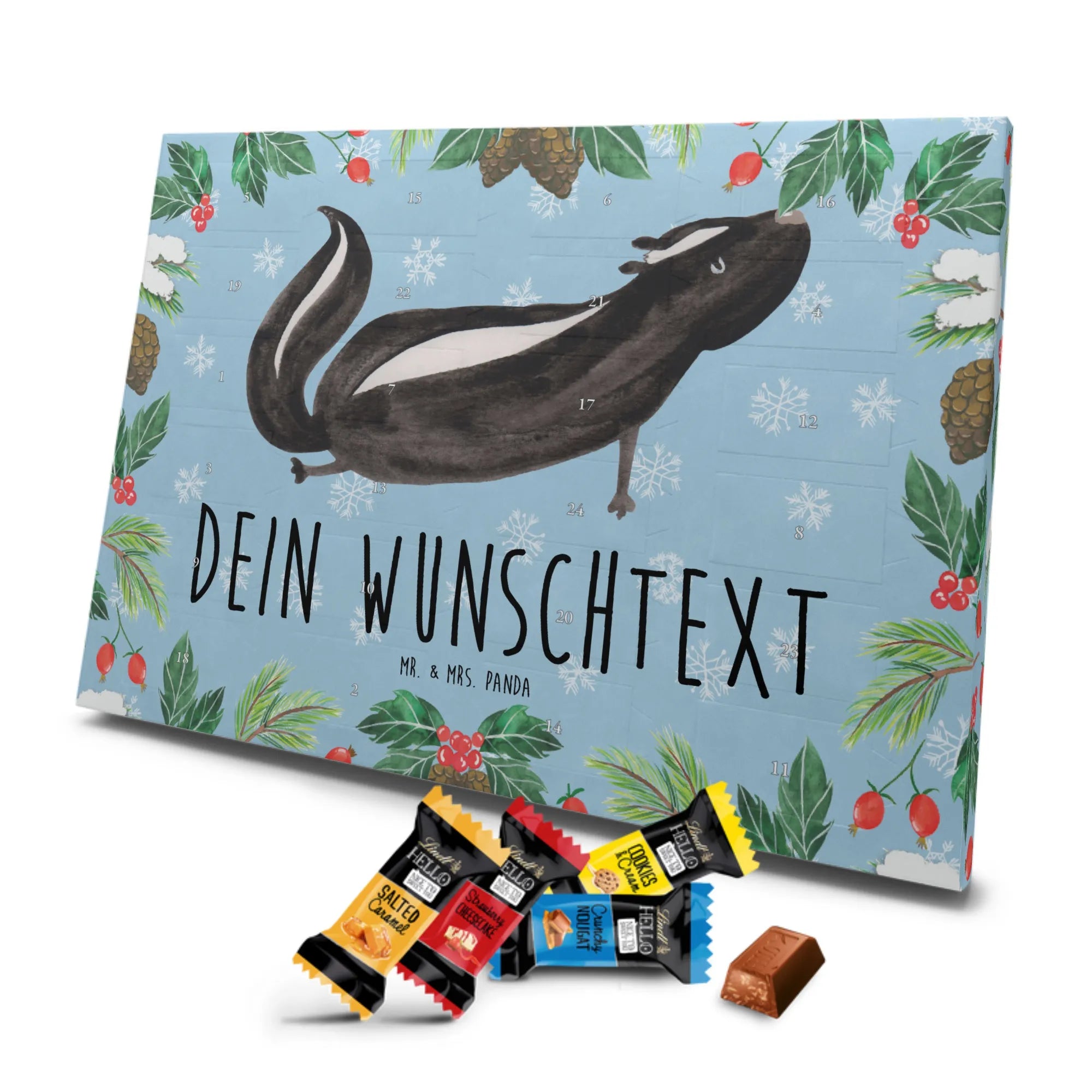 Die Stinktier-Kollektion ist eine Herzensangelegenheit und wurde dem treuen Begleiter Herrn Blume gewidmet. Wenn du einen individuellen Schoko-Adventskalender suchst, der Humor und Genuss vereint, ist dieser Kalender die perfekte Wahl für die Adventszeit! 🦨