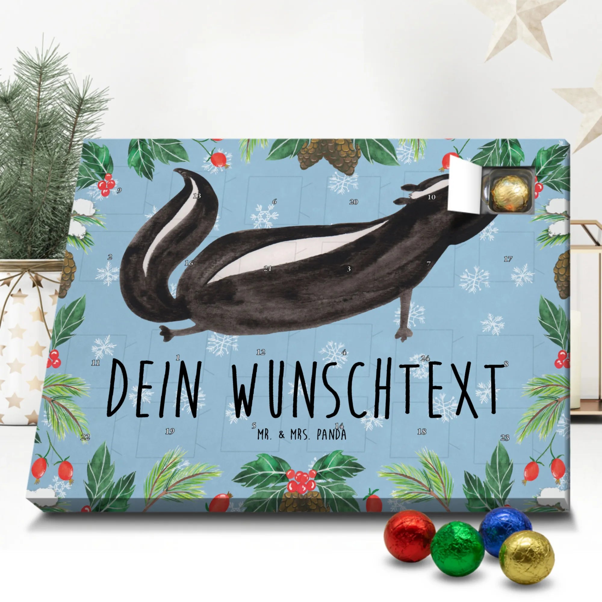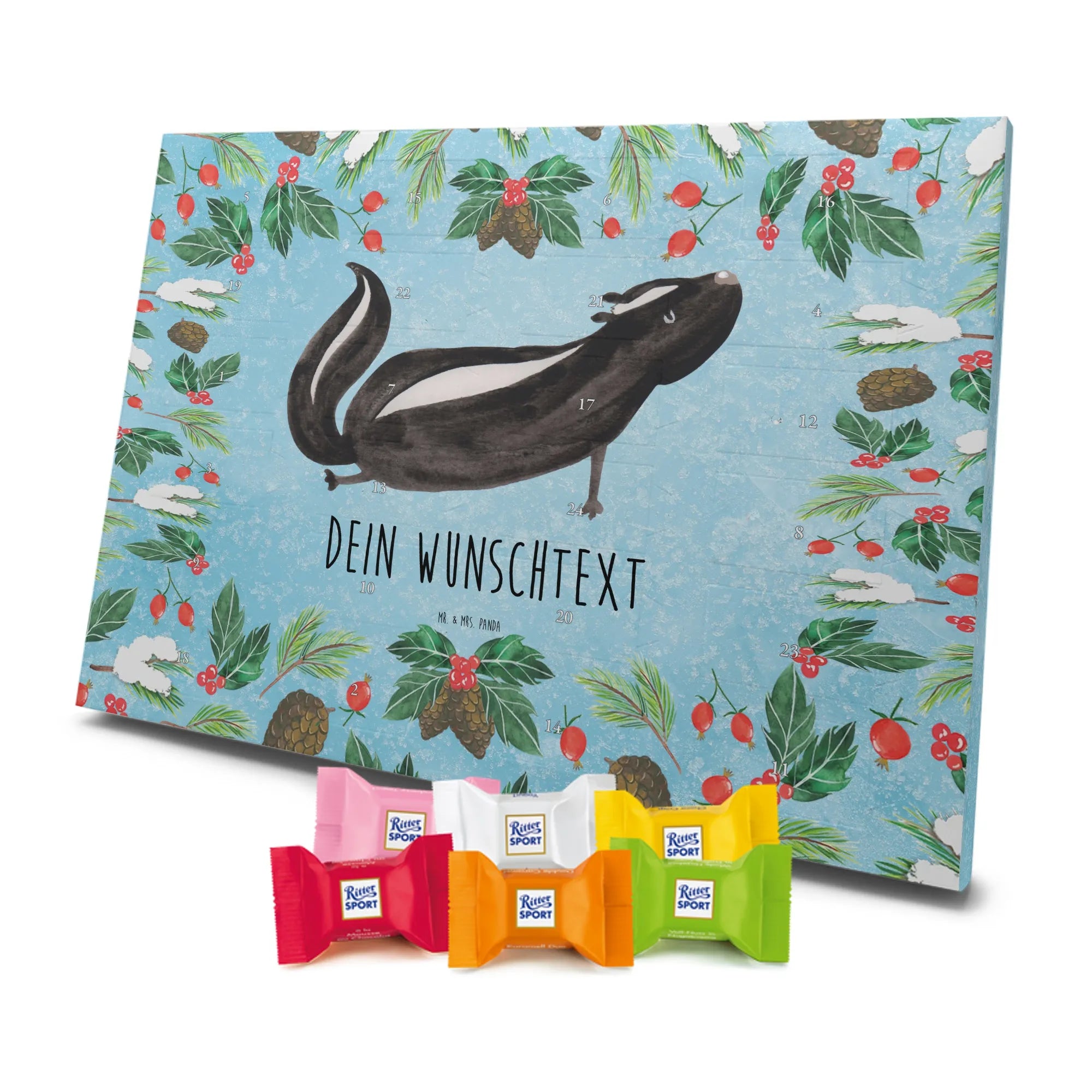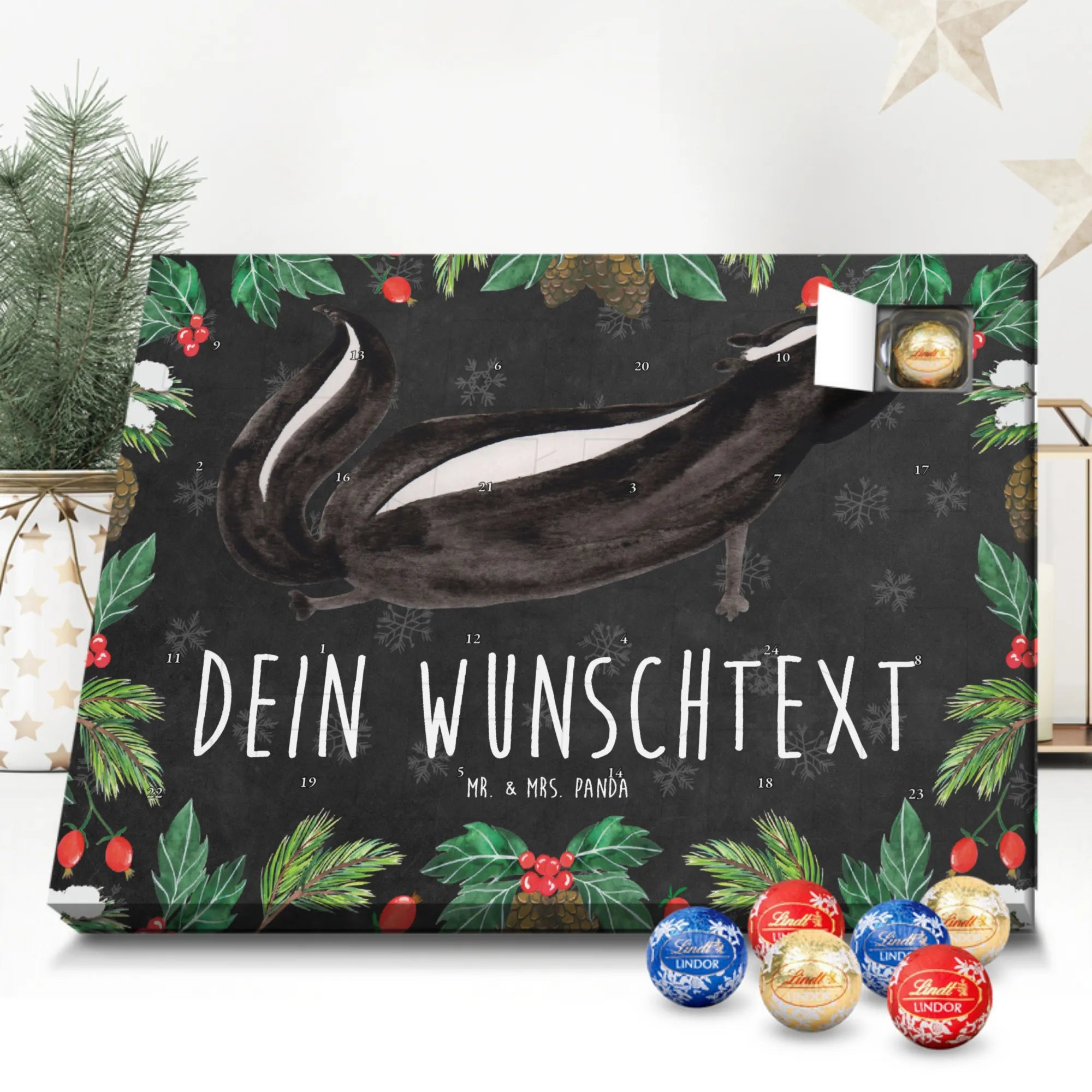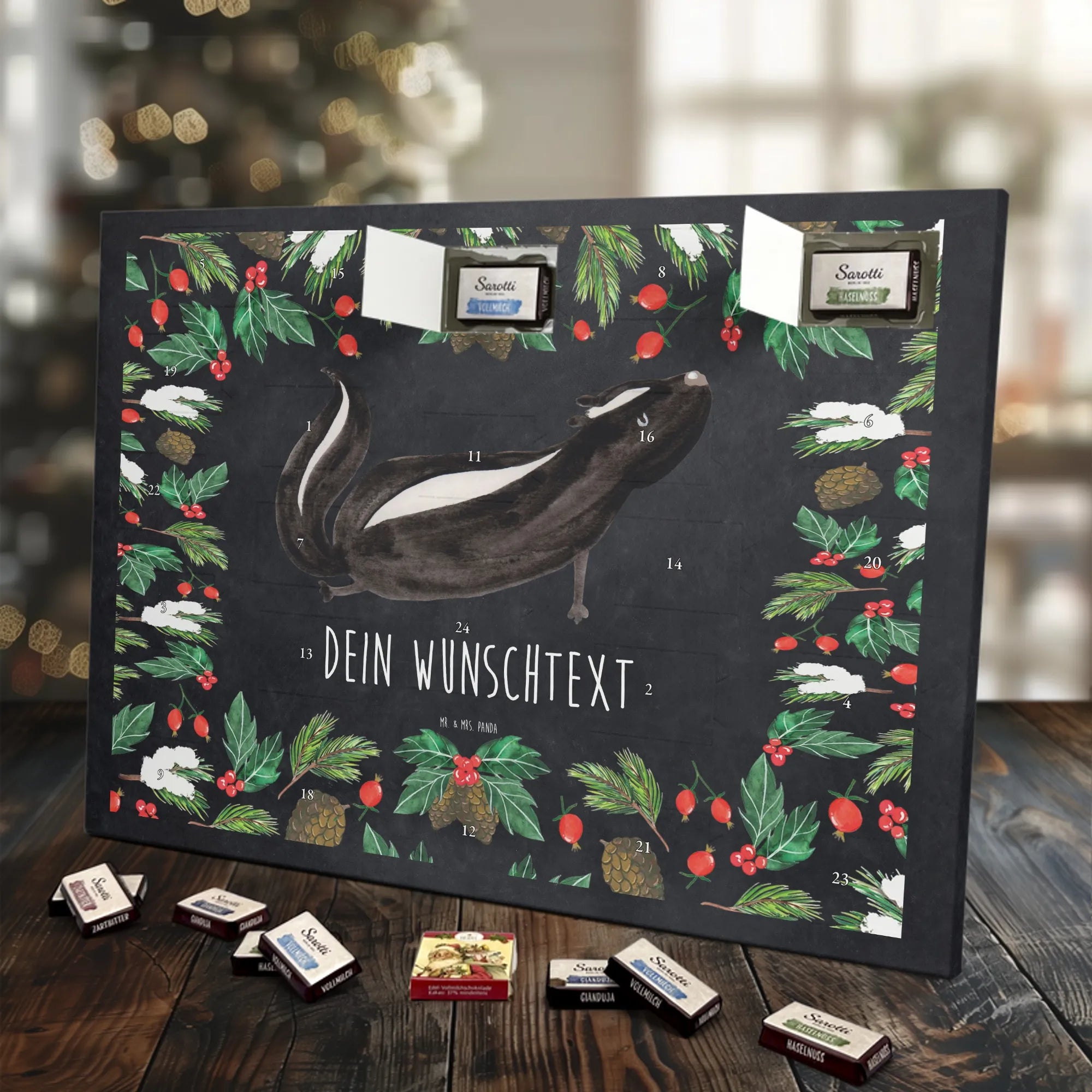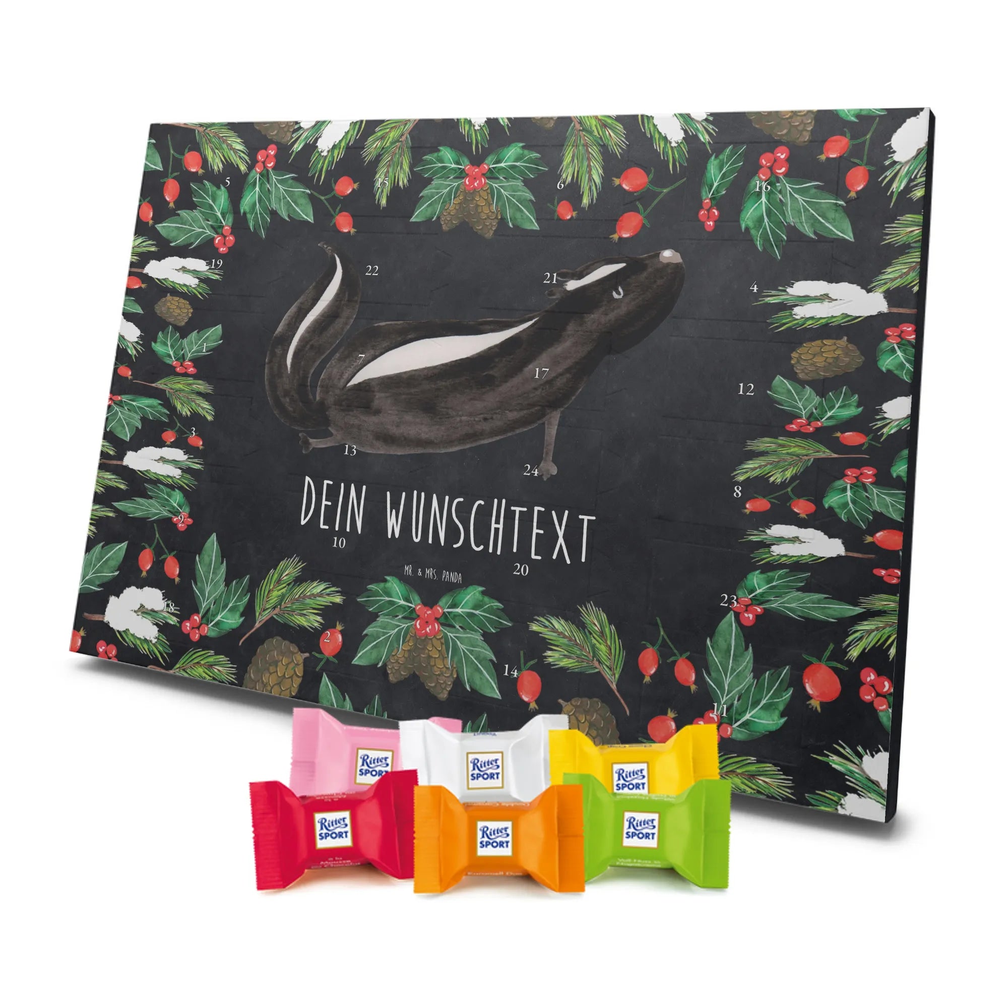 Die Stinktier-Kollektion ist eine Herzensangelegenheit und wurde dem treuen Begleiter Herrn Blume gewidmet. Wenn du einen individuellen Schoko-Adventskalender suchst, der Humor und Genuss vereint, ist dieser Kalender die perfekte Wahl für die Adventszeit! 🦨