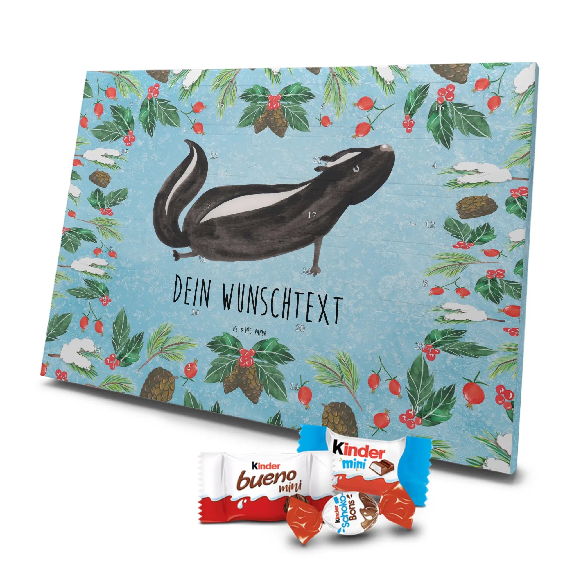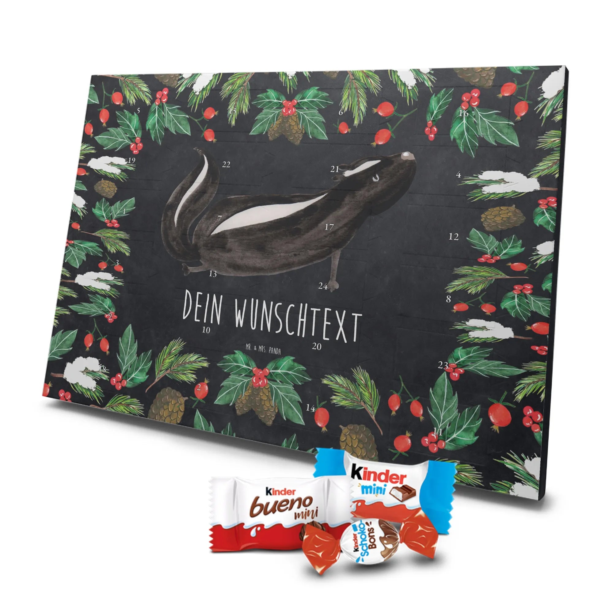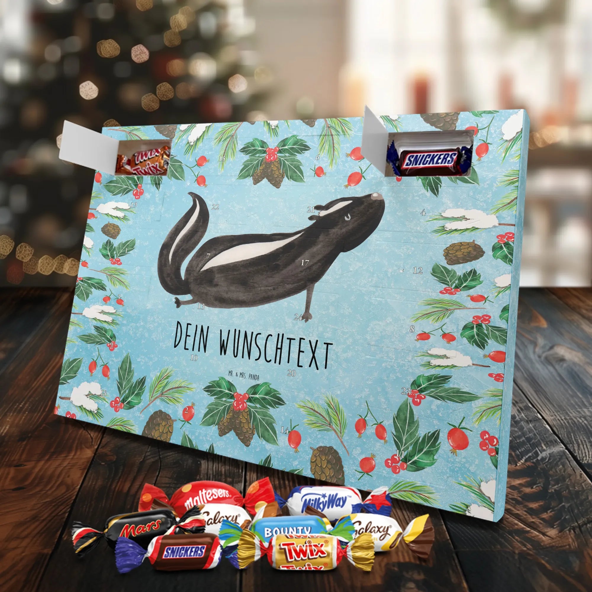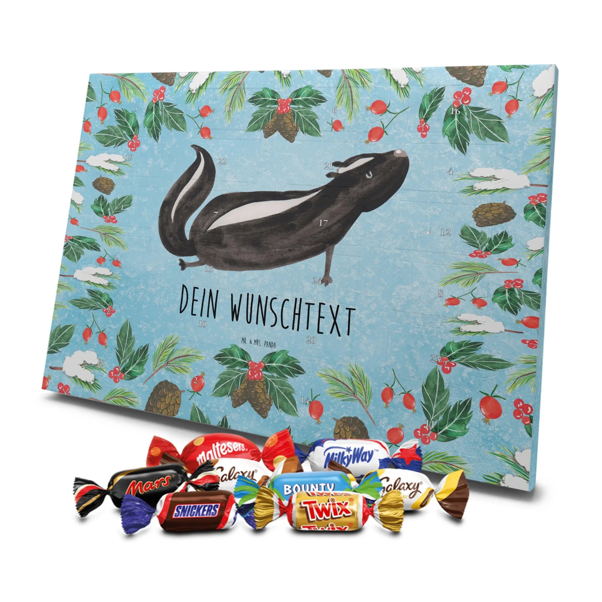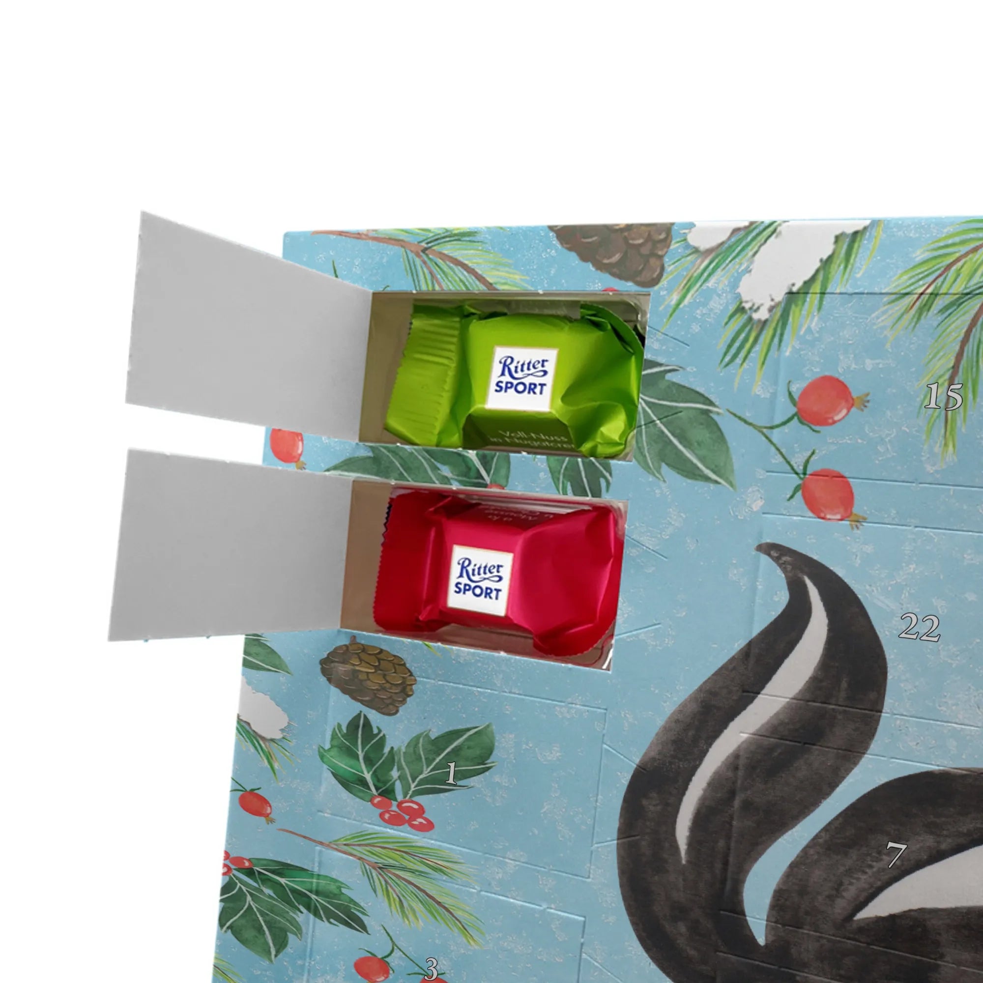 Die Stinktier-Kollektion ist eine Herzensangelegenheit und wurde dem treuen Begleiter Herrn Blume gewidmet. Wenn du einen individuellen Schoko-Adventskalender suchst, der Humor und Genuss vereint, ist dieser Kalender die perfekte Wahl für die Adventszeit! 🦨