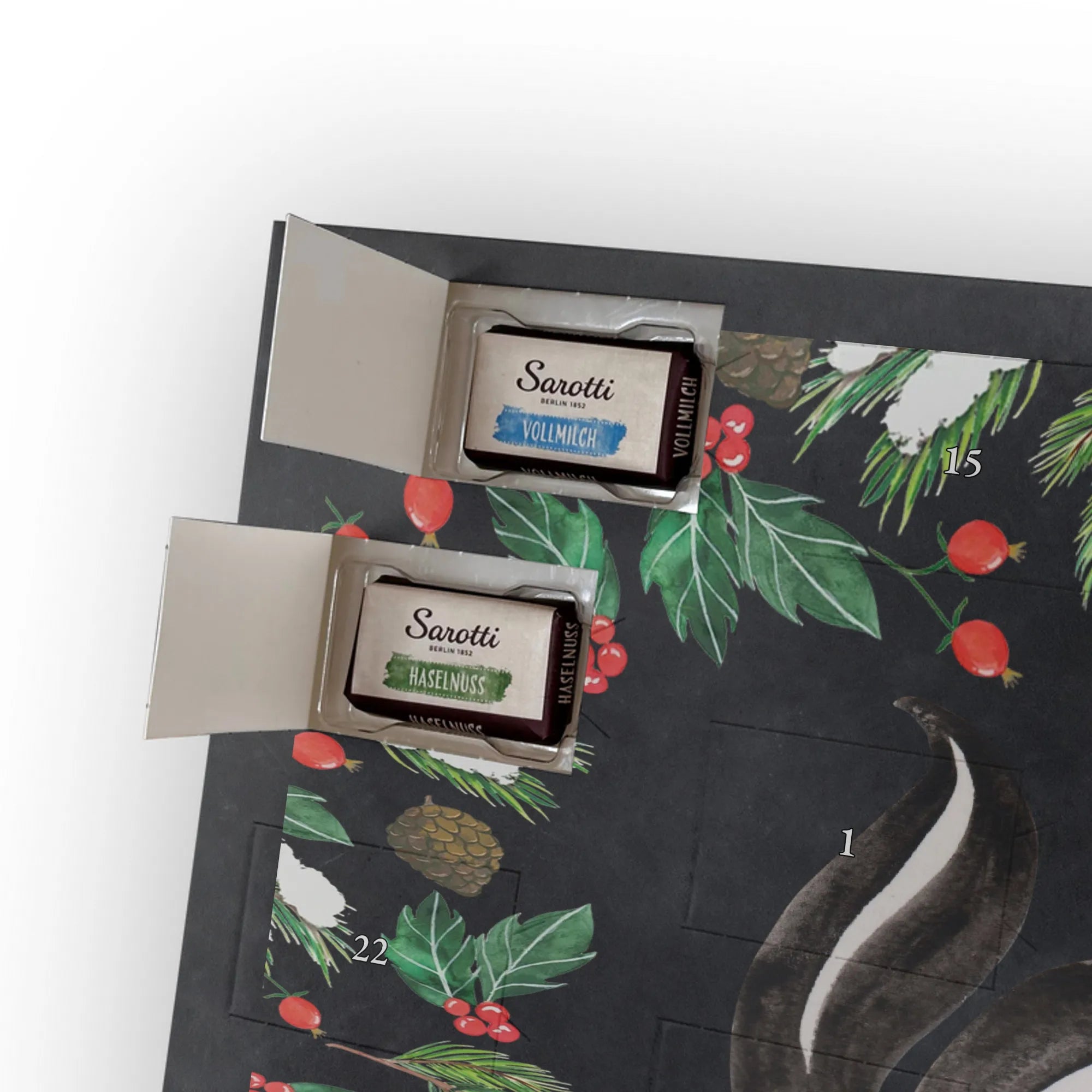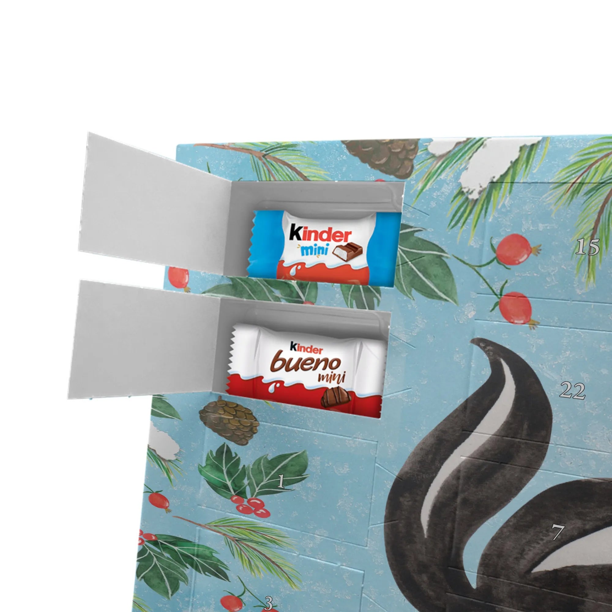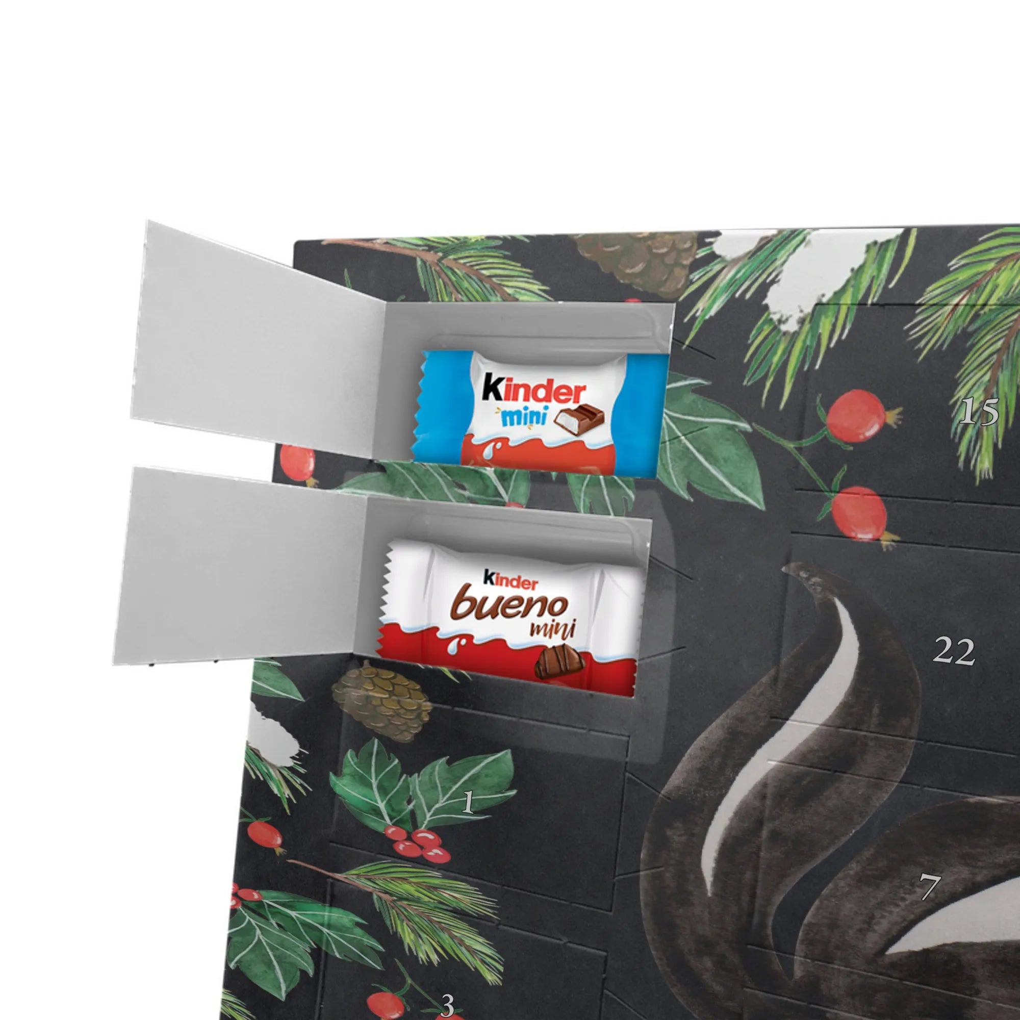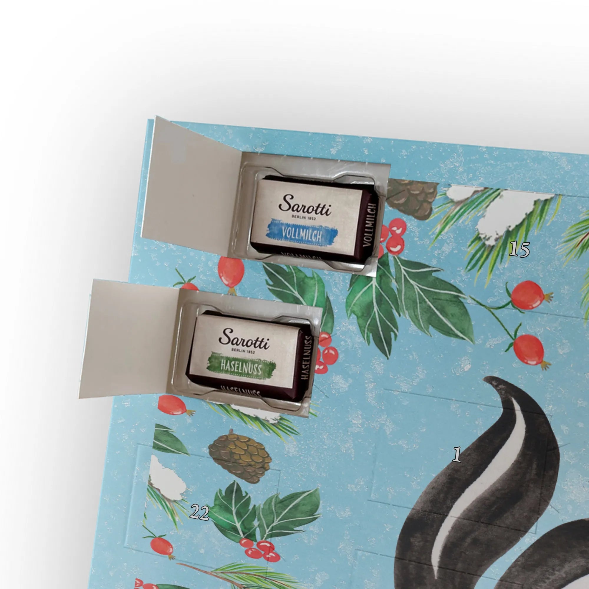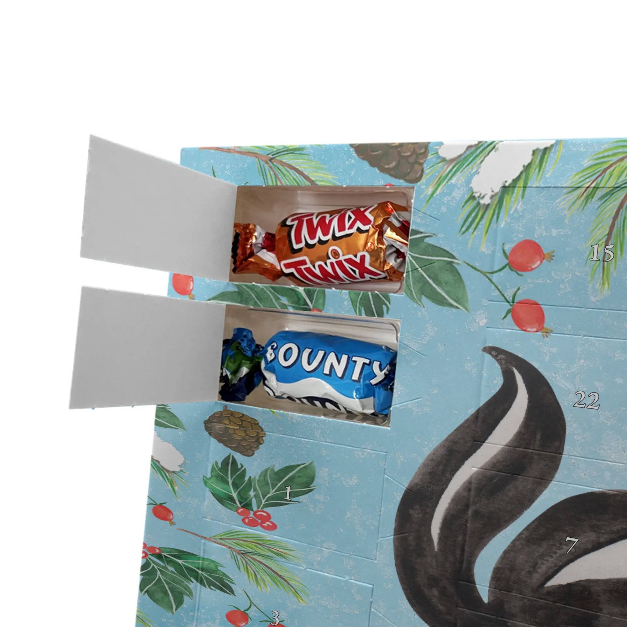 Die Stinktier-Kollektion ist eine Herzensangelegenheit und wurde dem treuen Begleiter Herrn Blume gewidmet. Wenn du einen individuellen Schoko-Adventskalender suchst, der Humor und Genuss vereint, ist dieser Kalender die perfekte Wahl für die Adventszeit! 🦨