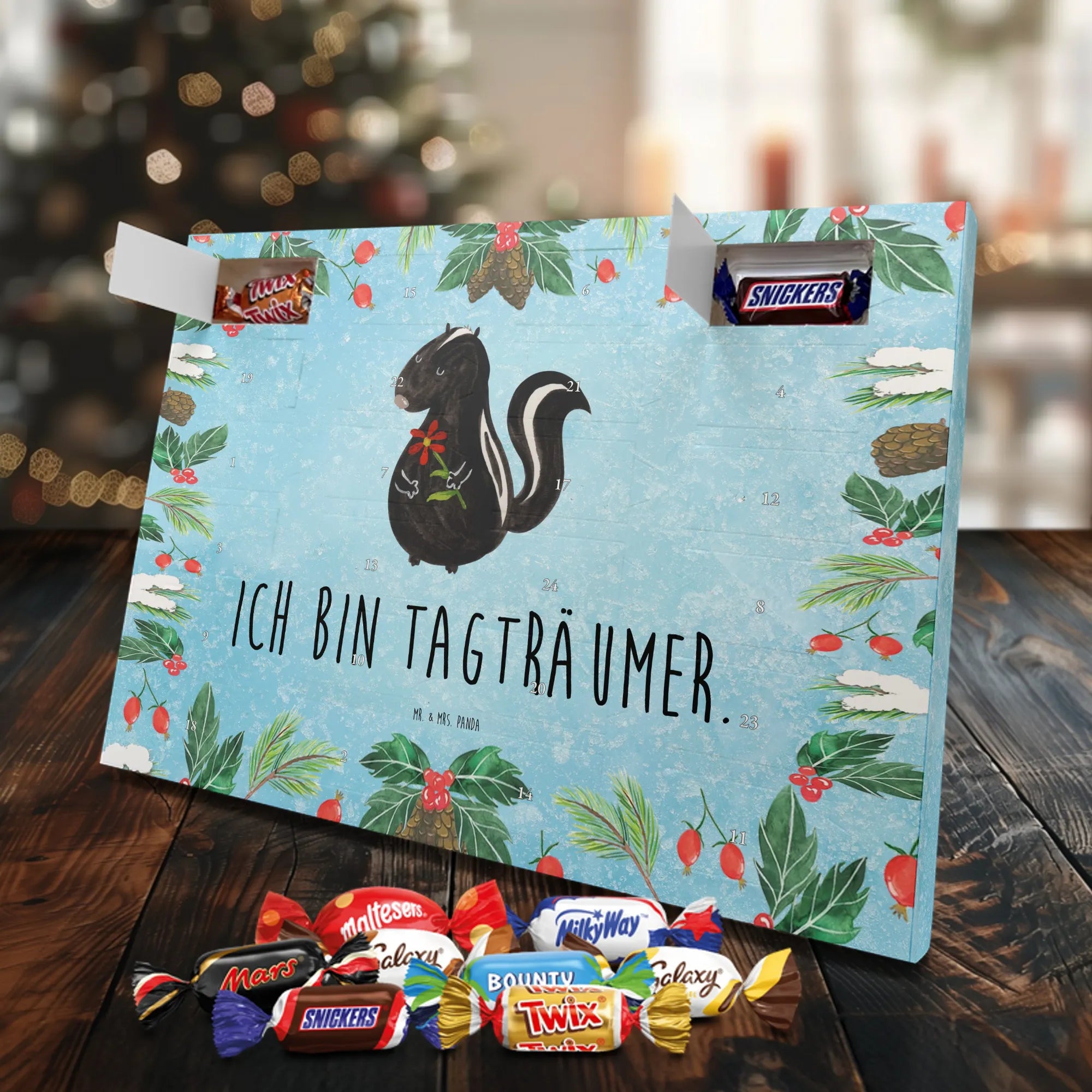 Unser Schoko Adventskalender von Mr. & Mrs. Panda bringt dir und deinen Lieben jede Menge Vorfreude und zauberhafte Momente in die Adventszeit. Der Kalender ist liebevoll bedruckt mit wunderschönen Motiven und frechen Sprüchen im typischen Mr. & Mrs. Panda Stil – ein echter Blickfang auf dem Tisch oder an der Wand. Die brillante Druckqualität kombiniert mit einer seidenmatten Oberflächenveredelung sorgt für edle Farben und ein angenehmes Gefühl beim Anfassen. Auch die Seitenflächen sind bedruckt, sodass der Kalender von allen Seiten hübsch aussieht. Er ist nicht personalisierbar, dafür aber in seiner Gestaltung rundum stimmig. Gefüllt ist der Adventskalender mit 24 hochwertigen Celebrations-Füllungen in acht verschiedenen Sorten: Maltesers, Mars, Snickers, Twix, Milky Way, Bounty, Galaxy und Galaxy Caramel — so ist für jede Naschkatze etwas dabei. Die Besonderheit: Du kannst den Kalender entweder aufstellen oder dank rückseitiger Aufhängung an die Wand hängen. Maße: 325 mm x 225 mm x 27 mm. Ein liebevolles Geschenk für Familie, Freunde oder einfach für dich selbst, das kleine tägliche Glücksmomente schenkt und die Adventszeit versüßt.