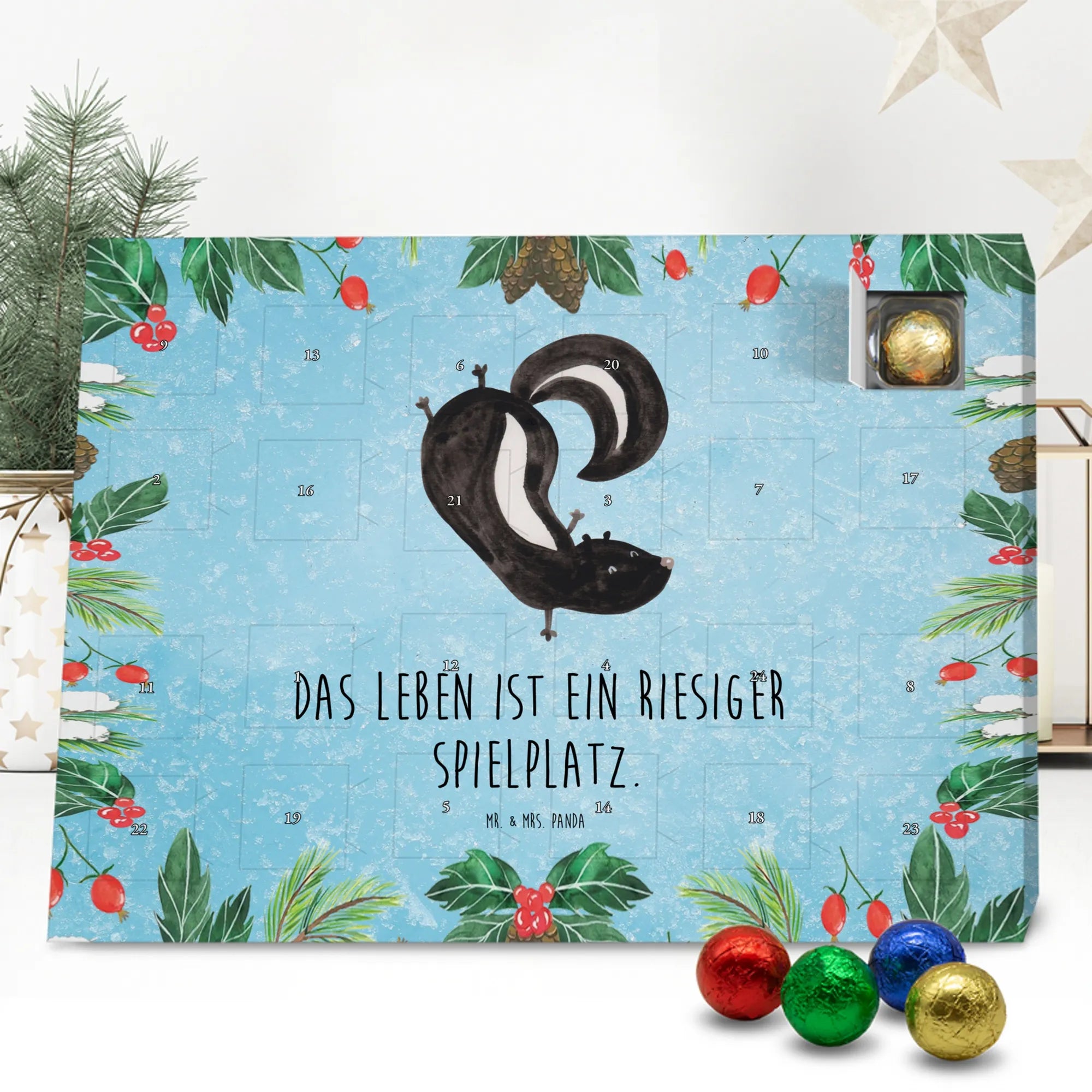 Wunderschöner Adventskalender mit Schokolade von Mr. & Mrs. Panda – für alle, die Advent und Design lieben. Dieser Adventskalender mit Schokolade ist liebevoll bedruckt mit wunderschönen Motiven & Sprüchen von Mr. & Mrs. Panda und ist nicht personalisierbar, aber mit viel Liebe zum Detail gefertigt. Brillante Druckqualität mit seidenmatter Oberflächenveredelung sorgt für einen edlen Look, und die bedruckten Seitenflächen geben dem Kalender eine besondere Optik. Maße: 233 mm x 178 mm x 24 mm. Dank seiner stabilen Verarbeitung kannst du ihn aufstellen oder ganz einfach aufhängen – Besonderheit: kann aufgehängt oder aufgestellt werden. Gefüllt mit MARKENNAMEN Schokolade und leckeren Schokoladenkugeln, bringt er jeden Tag ein kleines Glückserlebnis. Wichtige Hinweise: (Kann Spuren von Haselnüssen, Mandeln, Gluten und Soja enthalten!), bitte kühl und trocken lagern. Ob als Geschenk, Mitbringsel oder Adventsdeko – dieser Kalender zaubert ein Lächeln und sorgt für gemütliche Vorfreude. Viel Freude beim Entdecken der süßen Überraschungen wünscht dir Mr. & Mrs. Panda!
