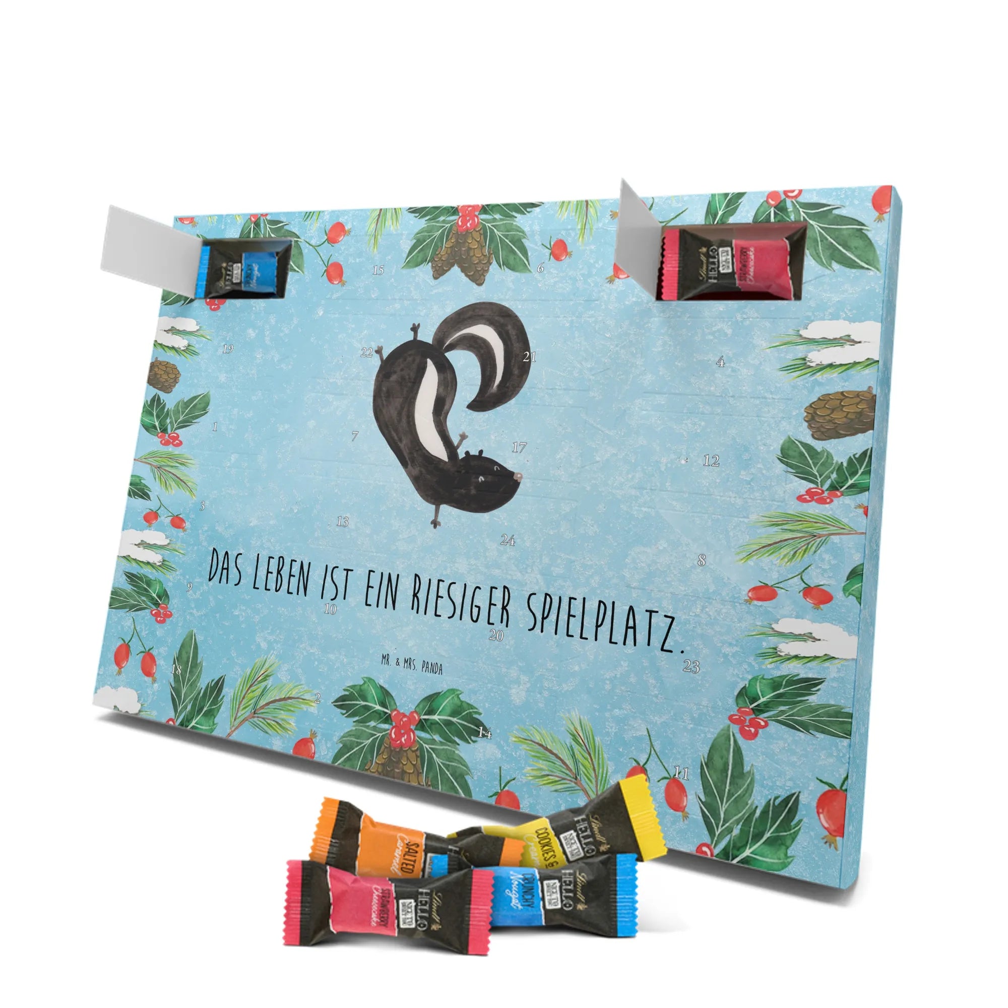 Wunderschöner Schoko Adventskalender von Mr. & Mrs. Panda – perfekt, wenn du dir oder deinen Liebsten die Adventszeit mit süßen Überraschungen versüßen willst. Unser liebevoll gestalteter Schokoladen Adventskalender ist bedruckt mit bezaubernden Motiven und frechen Sprüchen von Mr. & Mrs. Panda und sorgt jeden Tag für ein Lächeln. Der Kalender ist nicht personalisierbar, dafür aber in brillanter Druckqualität mit seidenmatter Oberflächenveredelung gefertigt. Auch die Seitenflächen sind vollständig bedruckt, was dem Design noch mehr Tiefe verleiht. Maße: 325 mm x 225 mm x 27 mm. Besonders praktisch: Der Kalender kann aufgehängt oder aufgestellt werden – so findest du immer den idealen Platz bei dir zu Hause. Gefüllt mit Lindt Hello Schokolade: 24 einzeln verpackte Schokoladen Mini Sticks in vier verschiedenen Sorten – Karamell-Schokoladenkuchen, Kekse, Knuspriger Nougat und Erdbeer-Cheesecake. Zutaten und Allergene findest du auf der Verpackung; wichtige Hinweise: enthält Milcheiweiß, Milchzucker, Soja, Weizen und Haselnüsse, kann Mandeln und andere Schalenfrüchte enthalten. Dieser Adventskalender ist eine liebevolle Geschenkidee für Freunde, Familie und alle Schoko-Fans, die jeden Tag bis Weihnachten mit feinem Schoko-Genuss feiern möchten.