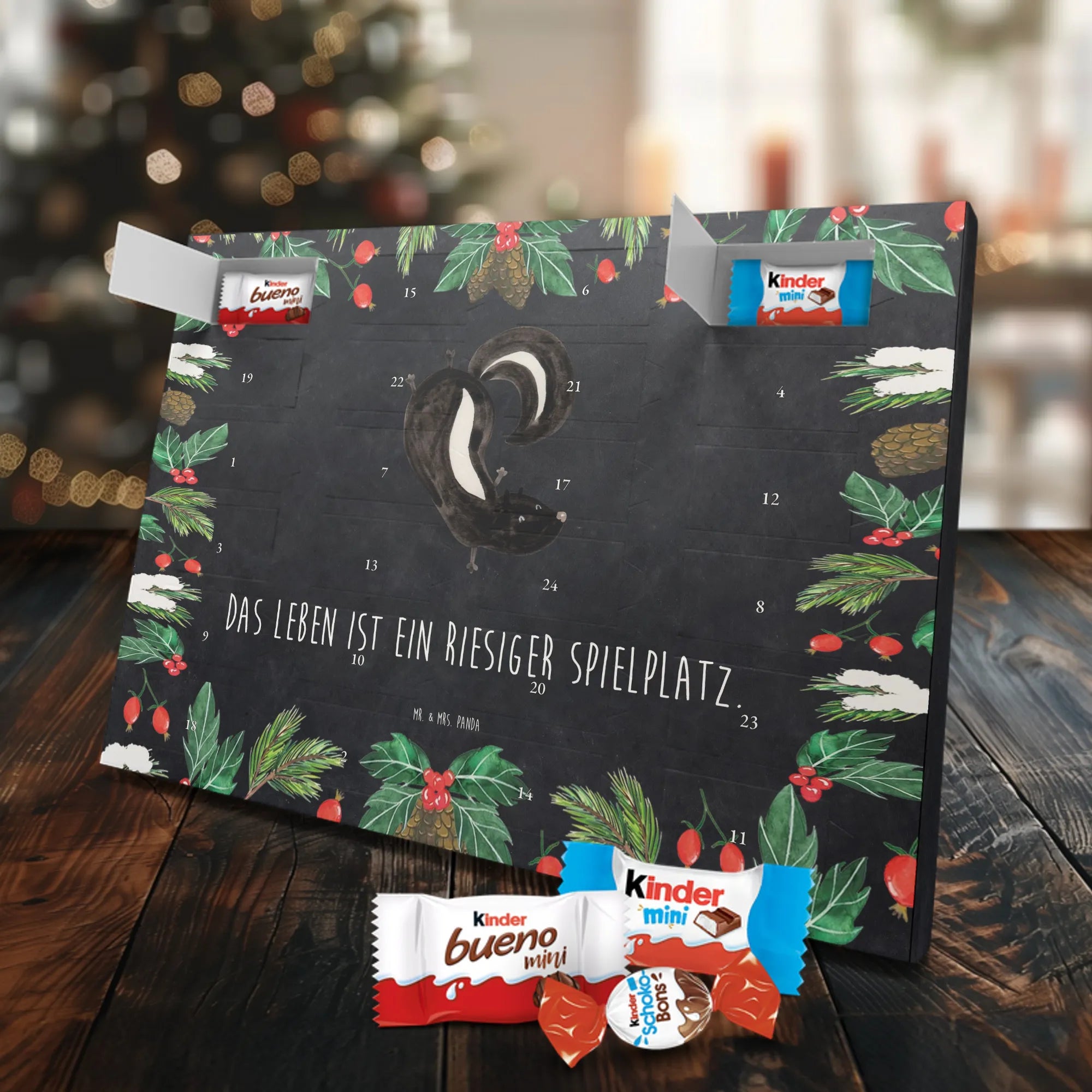 Wunderschöner Schoko Adventskalender von Mr. & Mrs. Panda – perfekt, wenn du die Vorweihnachtszeit mit einem liebevoll gestalteten Kalender versüßen möchtest. Unser Kalender ist bedruckt mit wunderschönen Motiven & Sprüchen von Mr. & Mrs. Panda und eignet sich hervorragend als Geschenk für Freunde, Familie oder einfach für dich selbst. Er ist nicht personalisierbar, dafür aber mit viel Liebe zum Detail gestaltet. Die brillante Druckqualität mit seidenmatter Oberflächenveredelung sorgt für edles Aussehen, und die bedruckten Seitenflächen geben dem Kalender einen wertigen Gesamteindruck. Maße: 355 mm x 245 mm x 11 mm. Besonderheit: kann aufgehängt oder aufgestellt werden – so findest du immer den perfekten Platz bei dir zuhause. Gefüllt mit Markenname Schokolade: Adventskalender gefüllt mit kinder® Schokolade. Inhalt: kinder® Schoko-Bons, kinder® Bueno mini und kinder® Schokolade mini. Der Kalender bietet 24 Türchen mit kleinen Überraschungen, die Kinderherzen höherschlagen lassen und Erwachsene schmunzeln. Er ist robust verarbeitet und ideal für den täglichen Genuss in der Adventszeit. Ob dekorativ auf der Kommode oder an der Wand aufgehängt – er bringt Freude und süße Momente in die Vorweihnachtszeit. Bestelle jetzt und mach dir oder deinen Lieben die Adventszeit ein bisschen süßer!