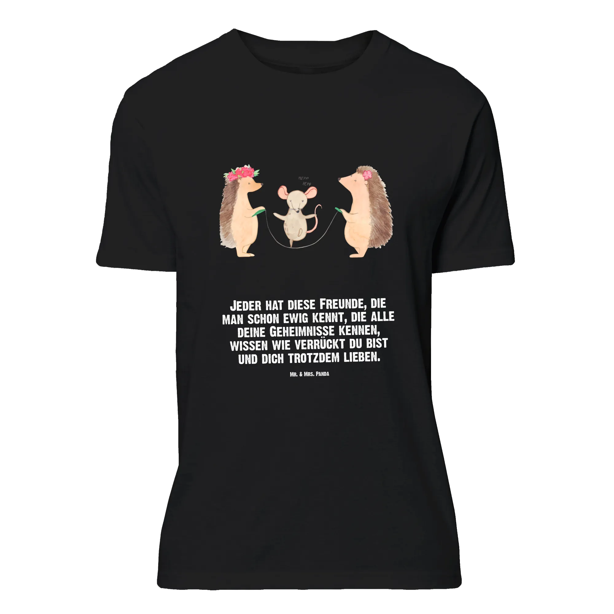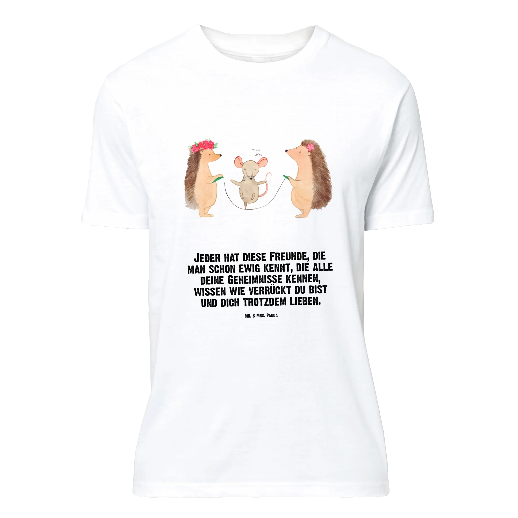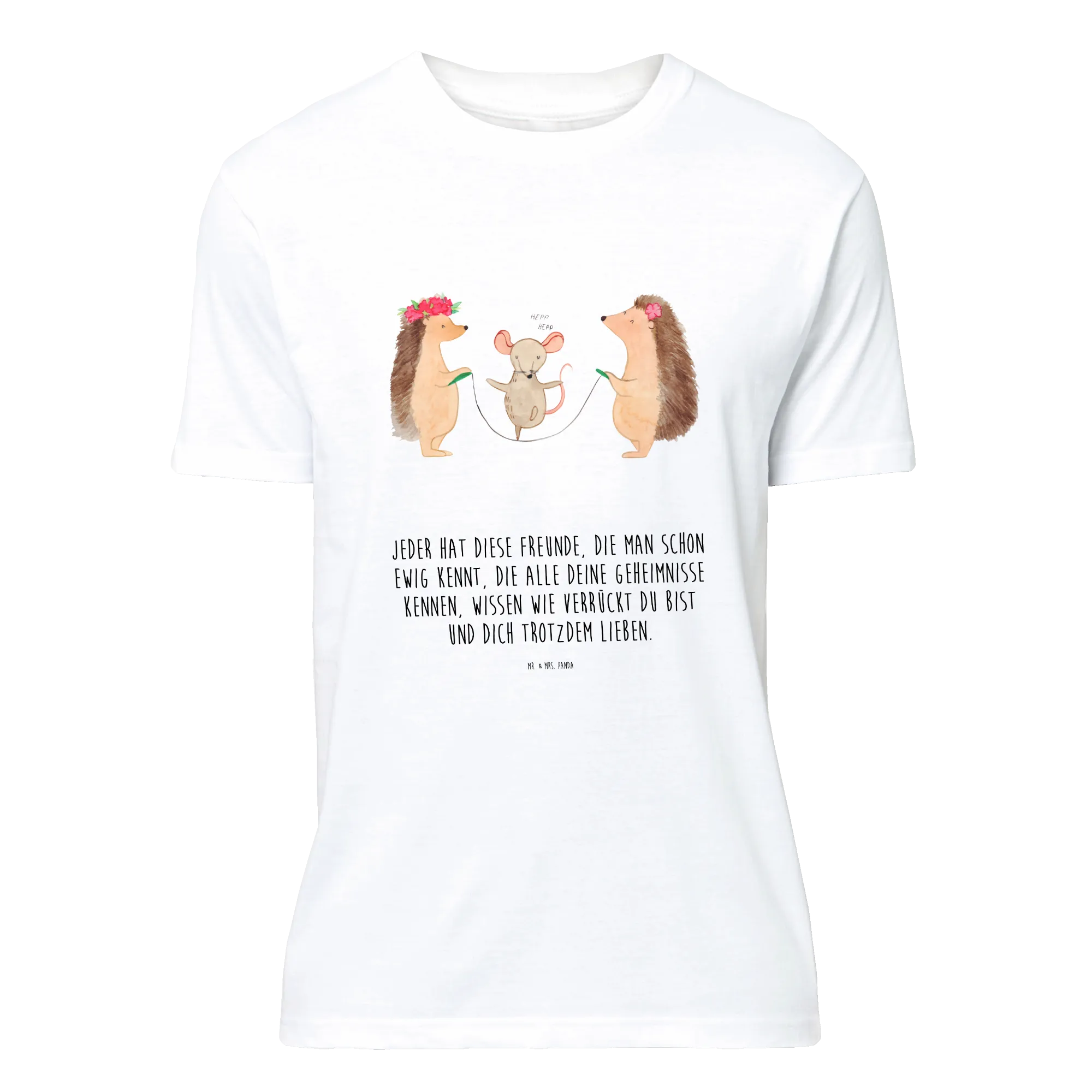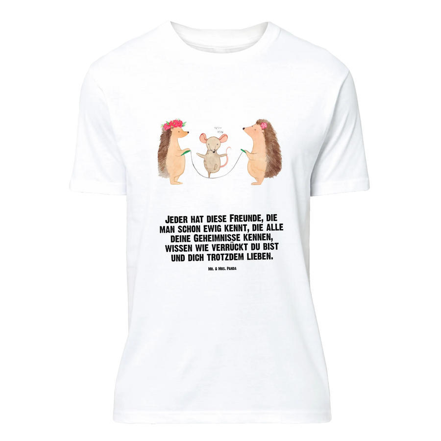 Die putzigen Igel, die zusammen mit einer kleinen Maus Seilspringen, strahlen eine wunderbare Botschaft von Freundschaft und Leichtigkeit aus. Das Shirt eignet sich hervorragend für besondere Anlässe wie Junggesellenabschiede, Jubiläen oder Geburtstage. Mit dem Slogan „Jeder hat diese Freunde, die man schon ewig kennt, die alle deine Geheimnisse kennen, wissen wie verrückt du bist und dich trotzdem lieben“, wird ein süßer und lustiger Touch hinzugefügt, der die Träger und ihre Freunde zum Lachen bringt.