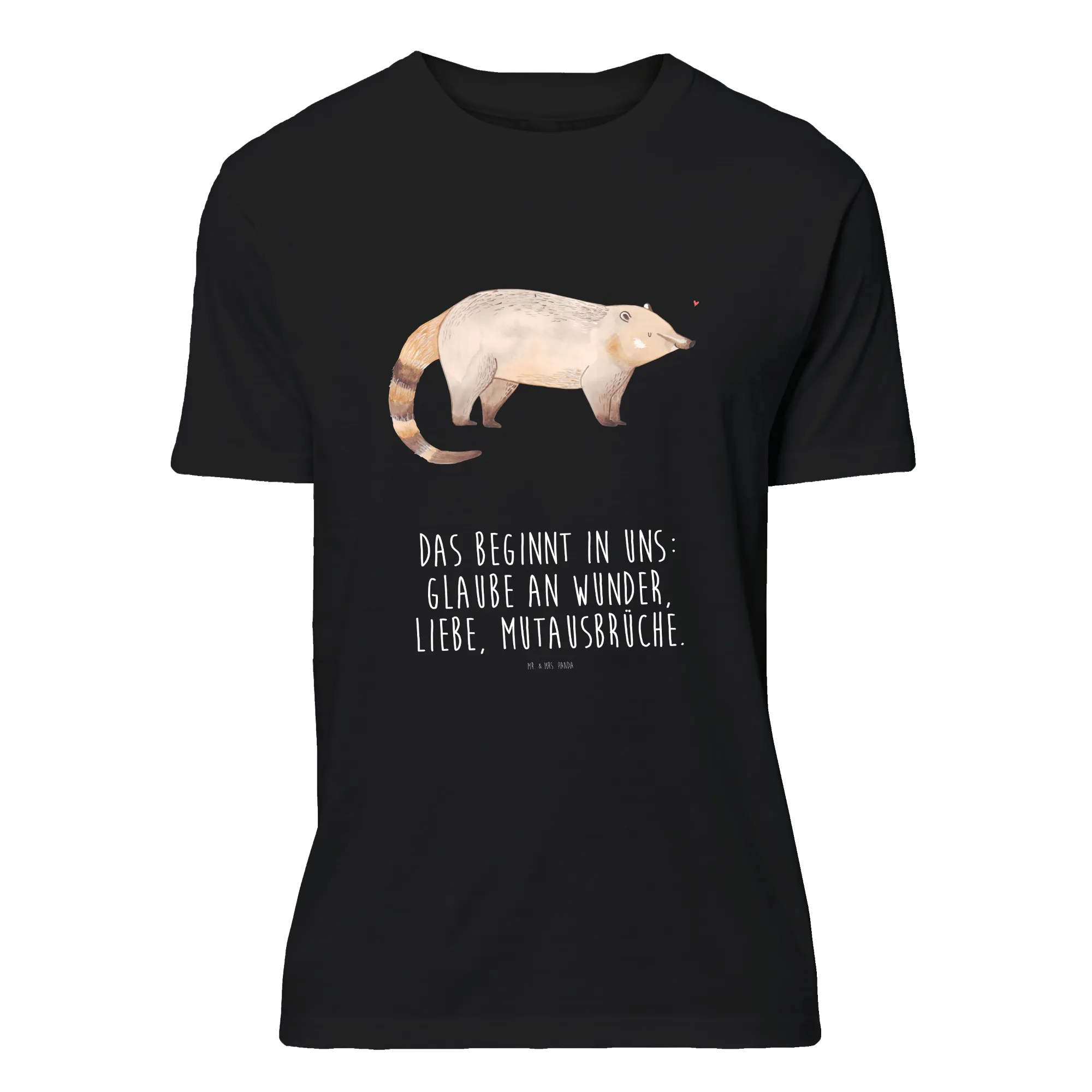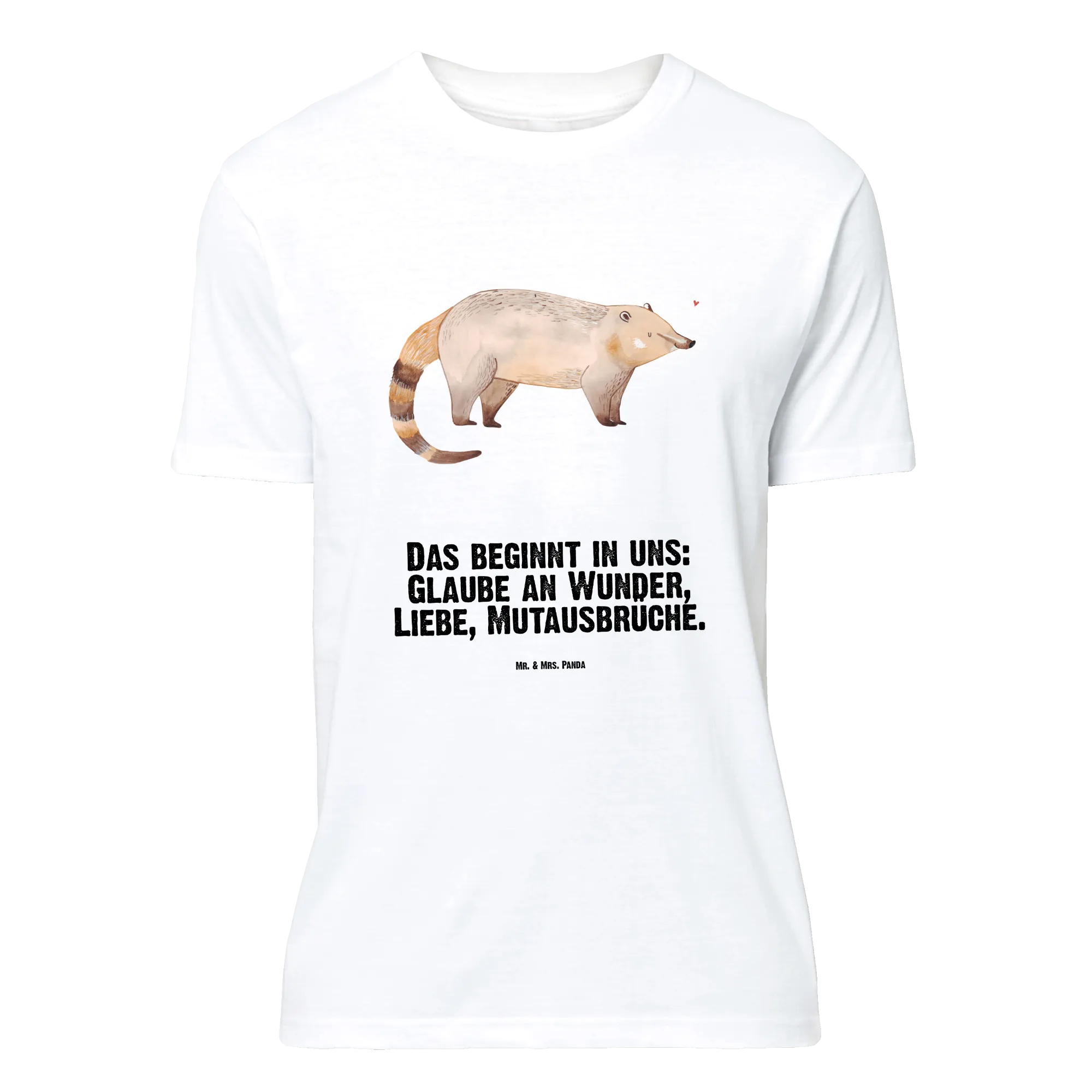 Dieses süße Größe S T-Shirt aus der Small World Kollektion von Mr. & Mrs. Panda bringt sofort ein Lächeln auf dein Gesicht. Das liebevoll aquarellierte Motiv zeigt einen niedlichen Nasenbär in warmen Brauntönen, mit geringeltem Schwanz und einem kleinen roten Herz über dem Kopf. Der aufgedruckte Spruch „Das beginnt in uns: Glaube an Wunder, Liebe, Mutausbrüche.“ macht das Design besonders herzlich und inspirierend.