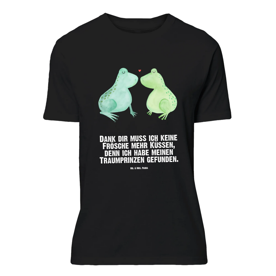 Dieses liebevoll gestaltete T-Shirt aus der Liebe-Kollektion von Mr. & Mrs. Panda ist die perfekte Geschenkidee für Verliebte. Auf schwarzem Grund tummeln sich zwei zuckersüße Frösche, die sich gegenüberstehen. Ein kleines rotes Herz schwebt zwischen ihnen – ein klares Zeichen: Die wahre Liebe wurde gefunden. Ideal für die Freundin, den Freund, Ehefrau oder Ehemann.