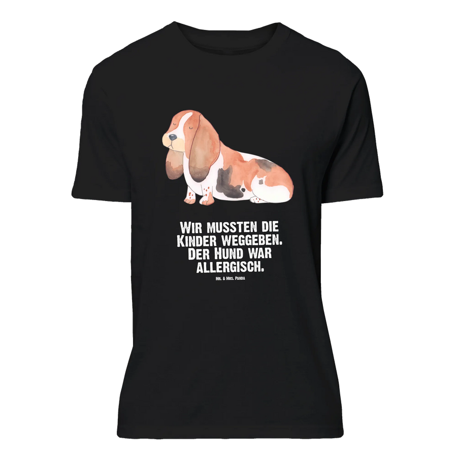 Du liebst Hunde und Humor? Dann triffst du mit diesem Mr. & Mrs. Panda T-Shirt genau ins Schwarze. Unser Größe L T-Shirt kombiniert ein süßes Basset Hound Motiv mit dem frechen Spruch „Wir mussten die Kinder weggeben. Der Hund war allergisch.“ – eine wundervolle Mischung aus Herz und Humor.