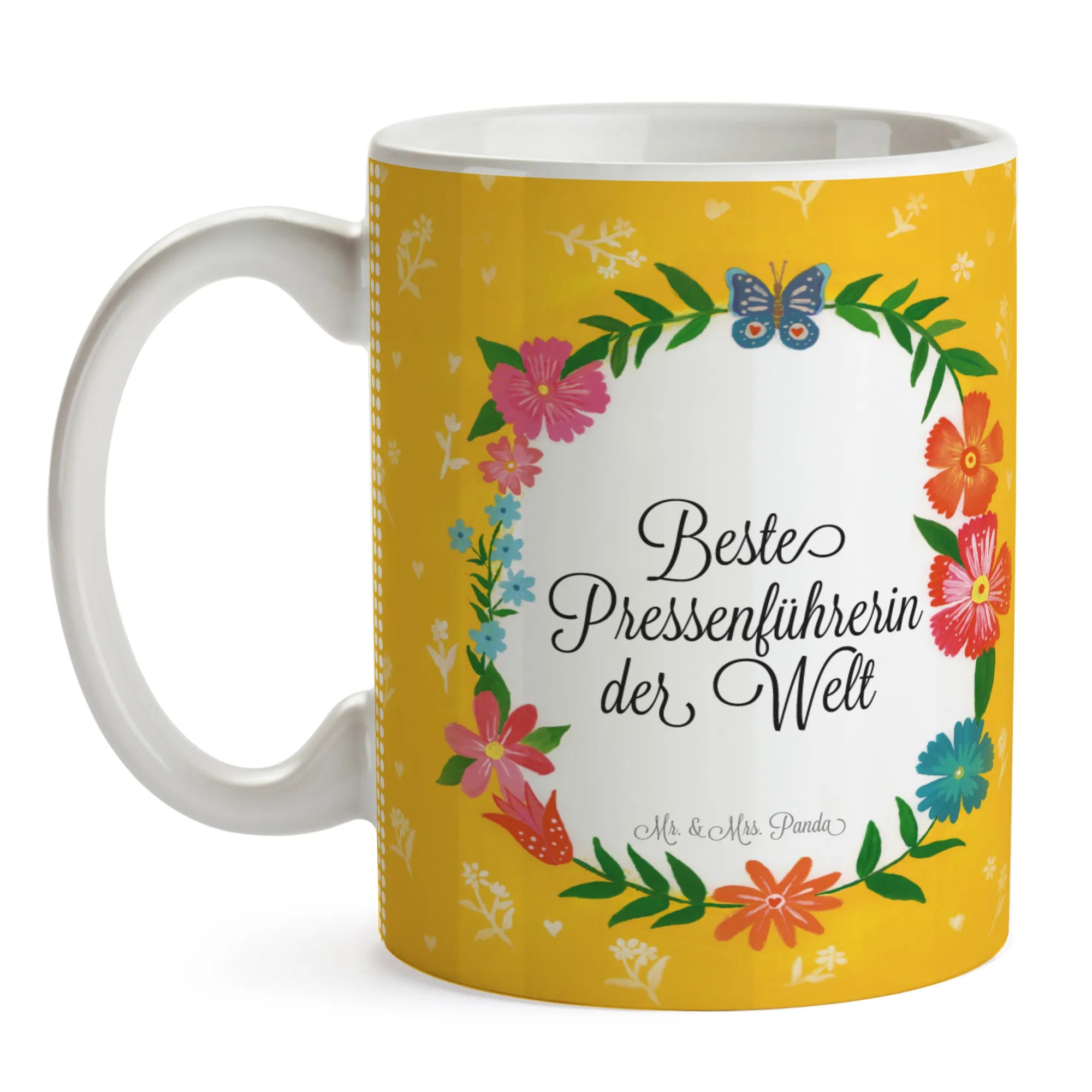 Die wunderschöne Kaffeetasse "Pressenführerin" von Mr. & Mrs. Panda ist das perfekte Geschenk für all jene Damen, die im Bereich Druck und Medienunwesen arbeiten. Mit ihrer hochwertigen Keramik und dem brillanten Druck dieser originellen Tasse bringst Du Freude in den Alltag jeder Pressenführerin. Egal ob für den ersten Arbeitstag, zum Abschluss der Ausbildung oder einfach als kleine Aufmerksamkeit zwischendurch – diese Tasse wird mit Sicherheit ein Lächeln auf jedes Gesicht zaubern!