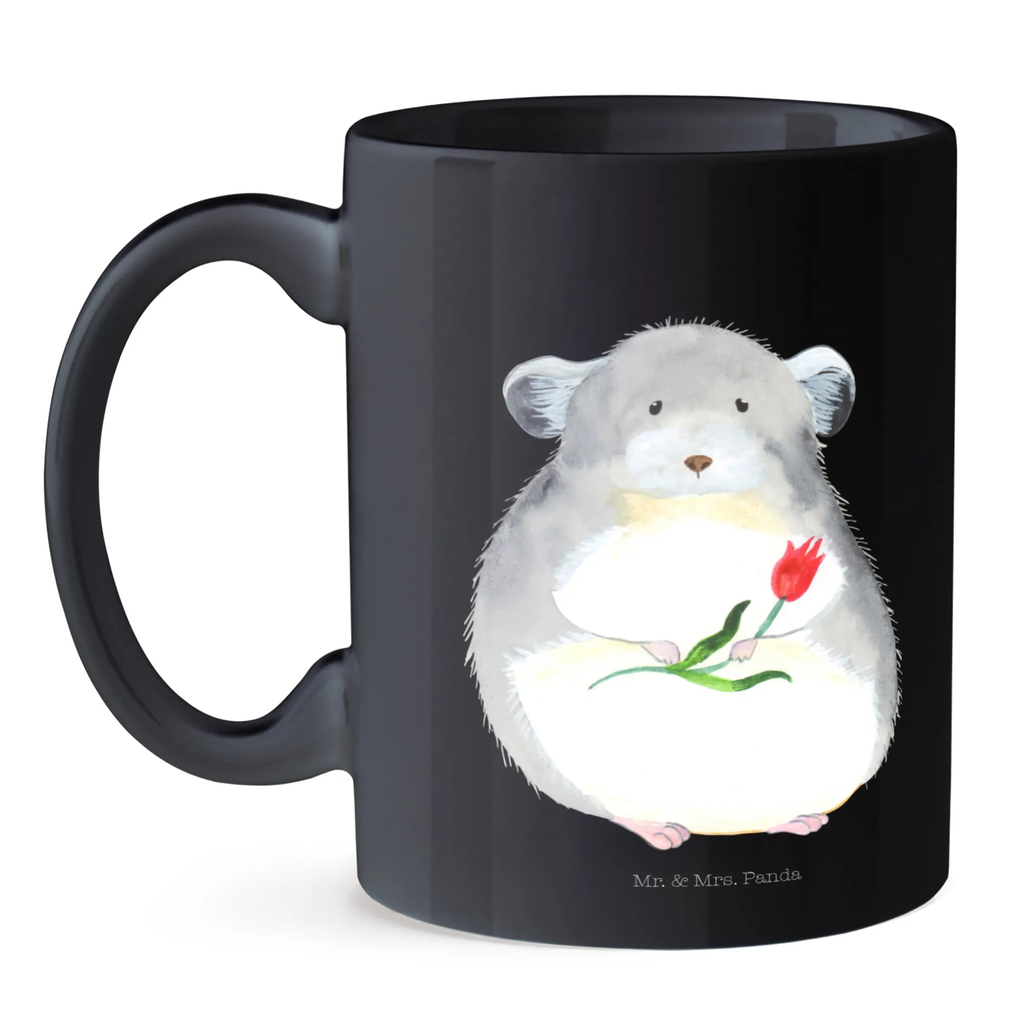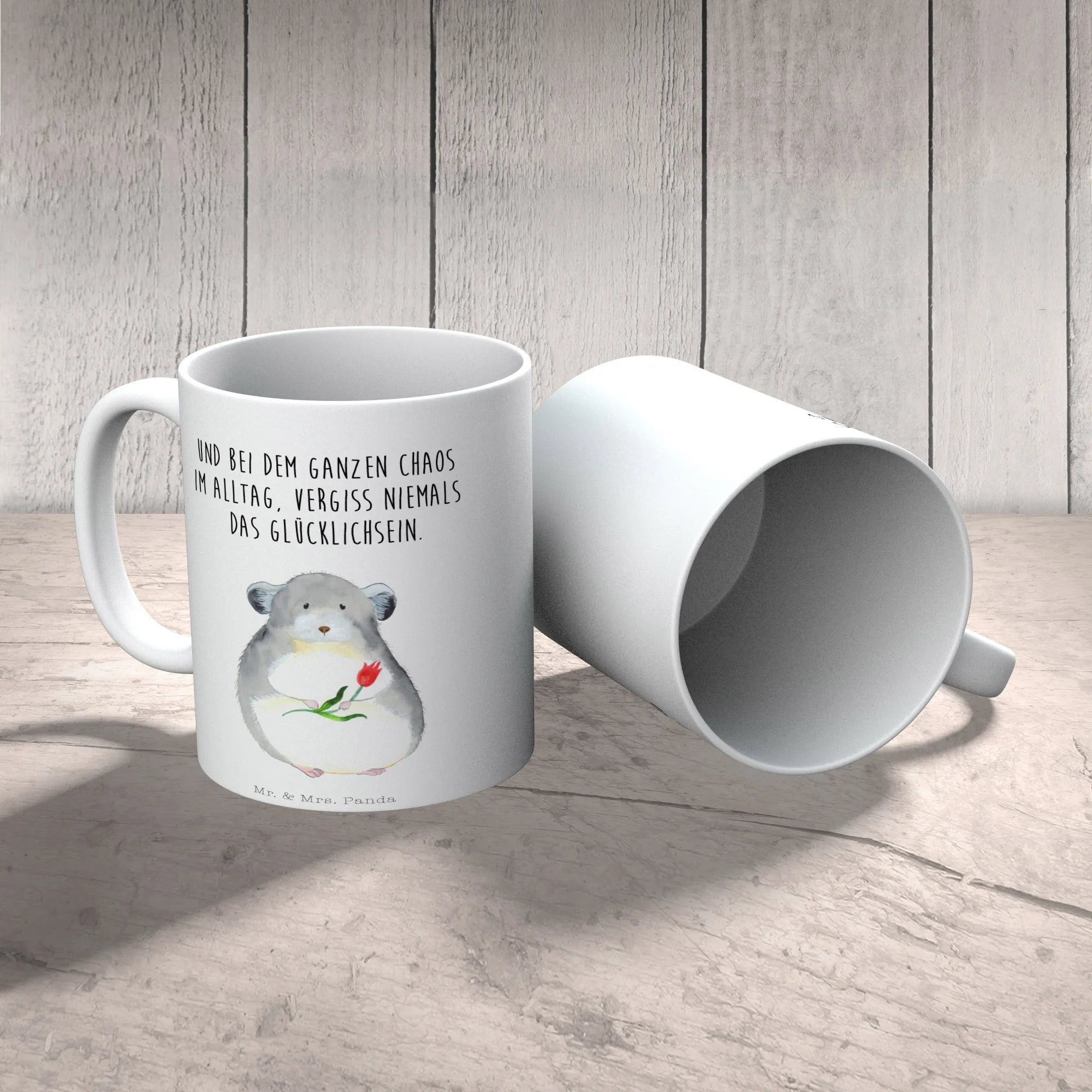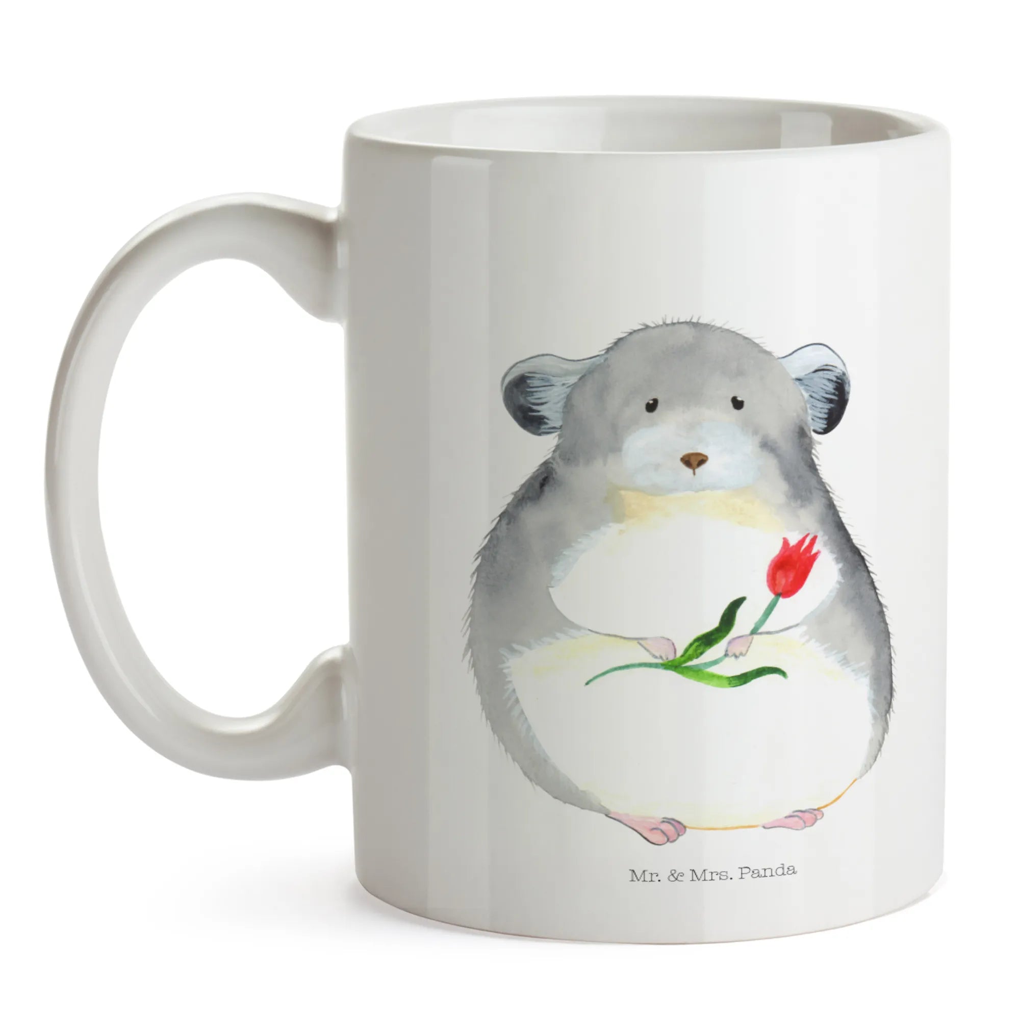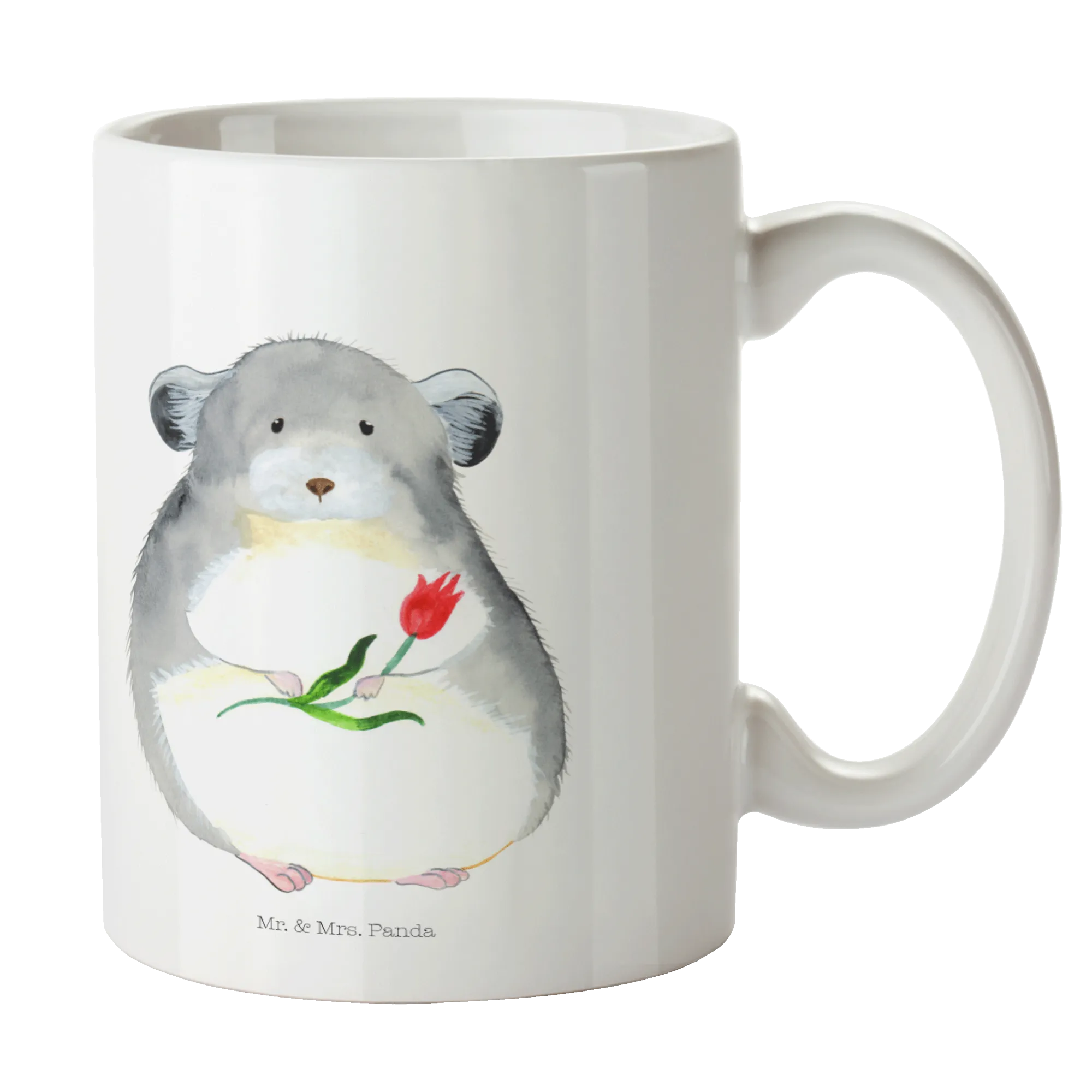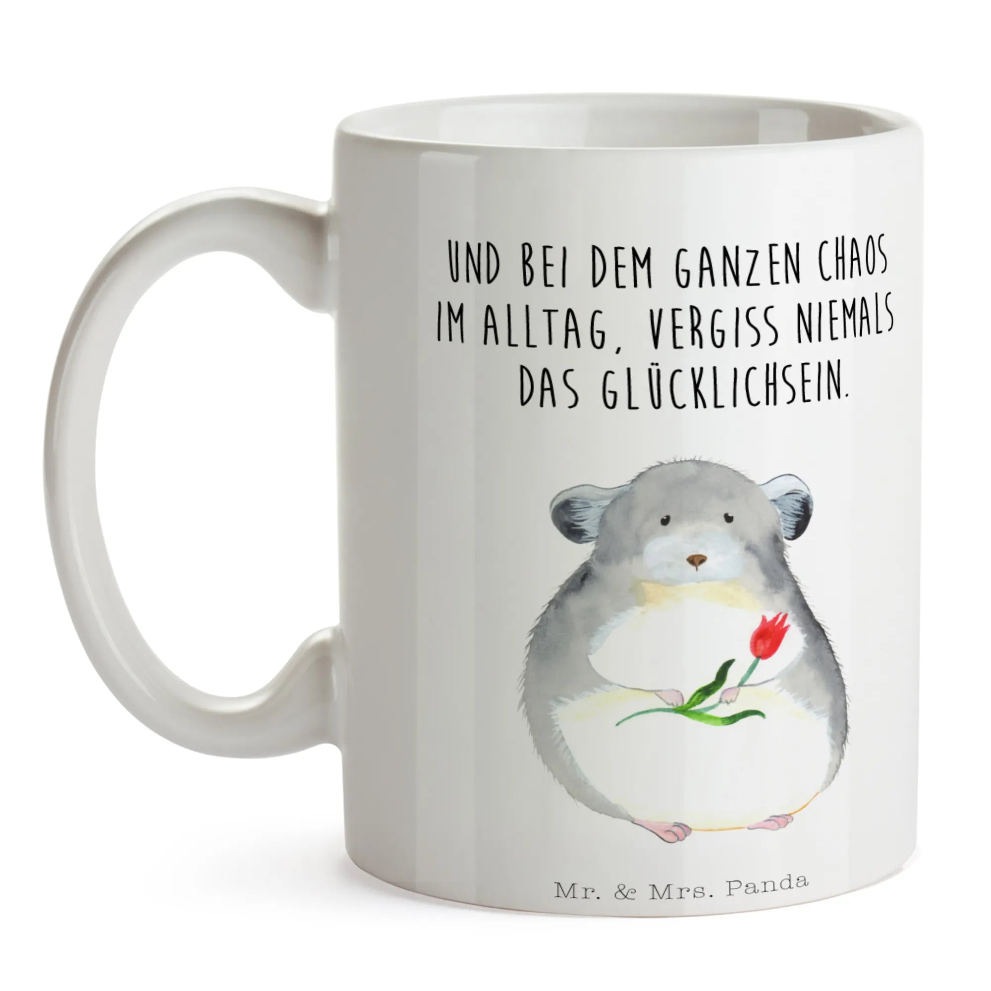 Das niedliche Chinchilla, das mit großen Augen eine Blume hält, strahlt pure Herzenswärme aus und erinnert dich daran, trotz des Chaos im Büro oder Alltag nicht das Glücklichsein zu vergessen. Mit einer Füllmenge von 325 ml ist sie ideal für deinen Lieblingskaffee oder -tee und sorgt für gute Laune bei jedem Schluck.