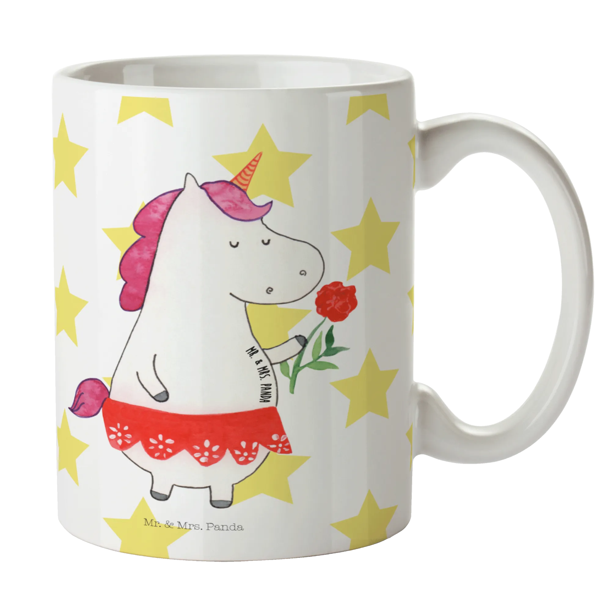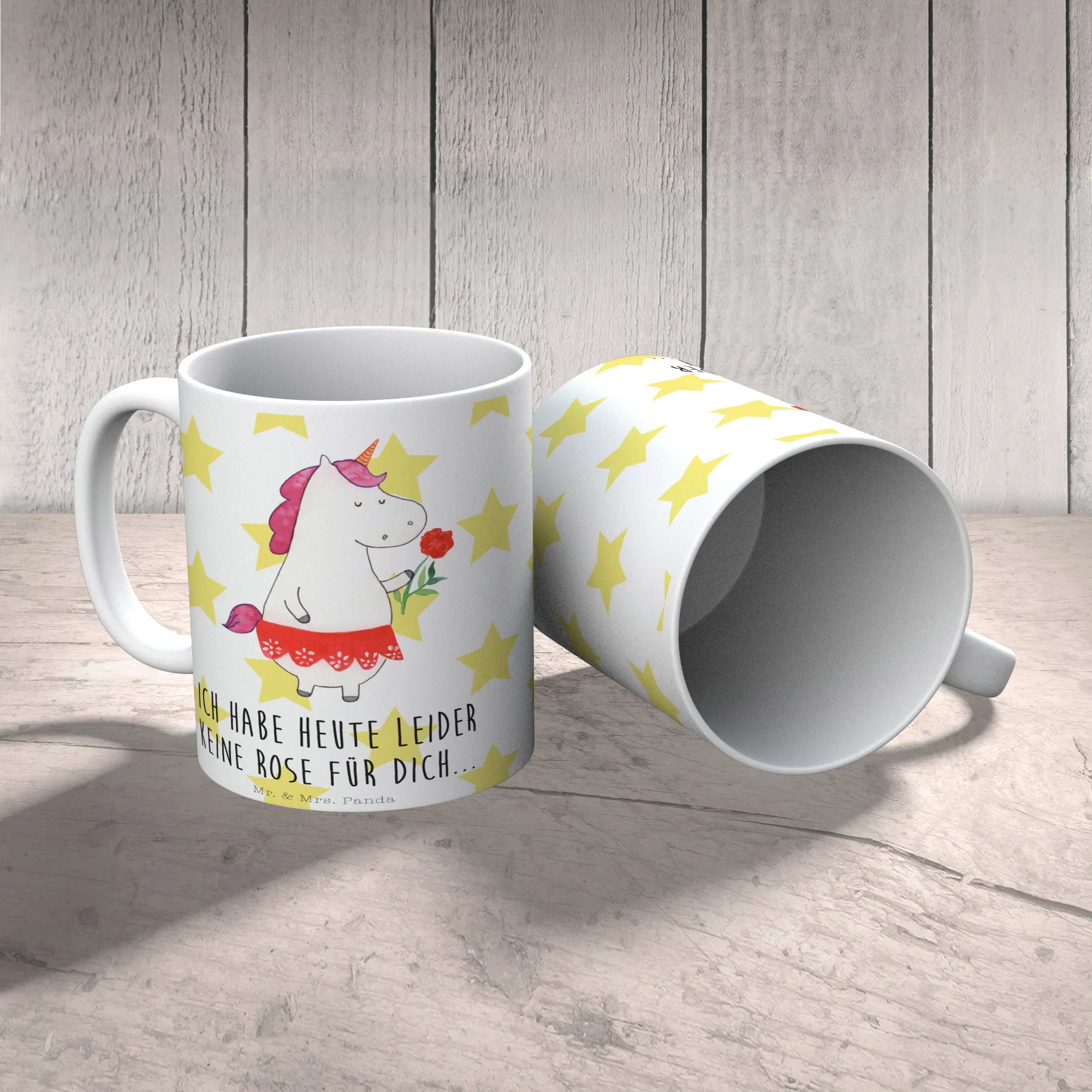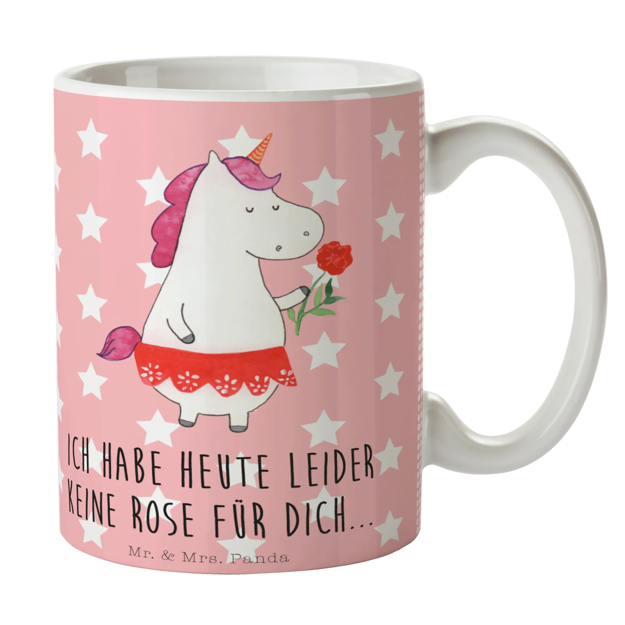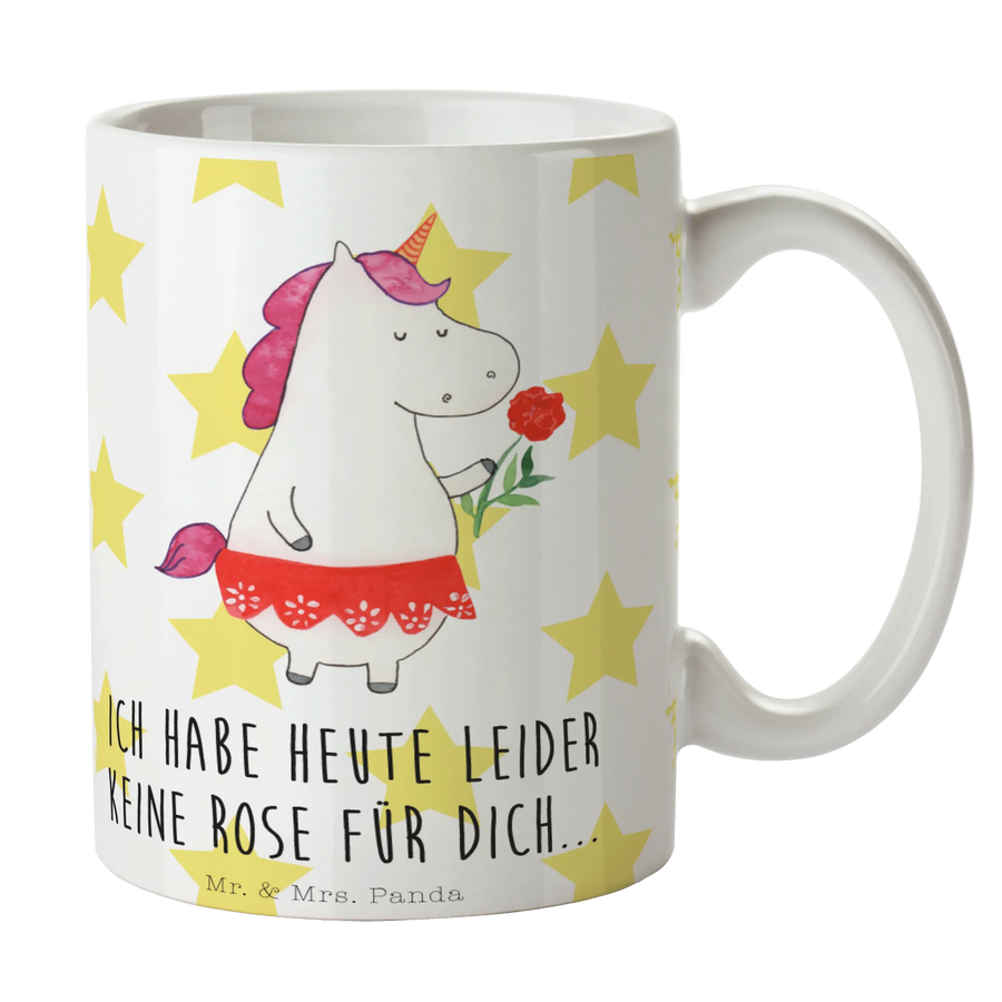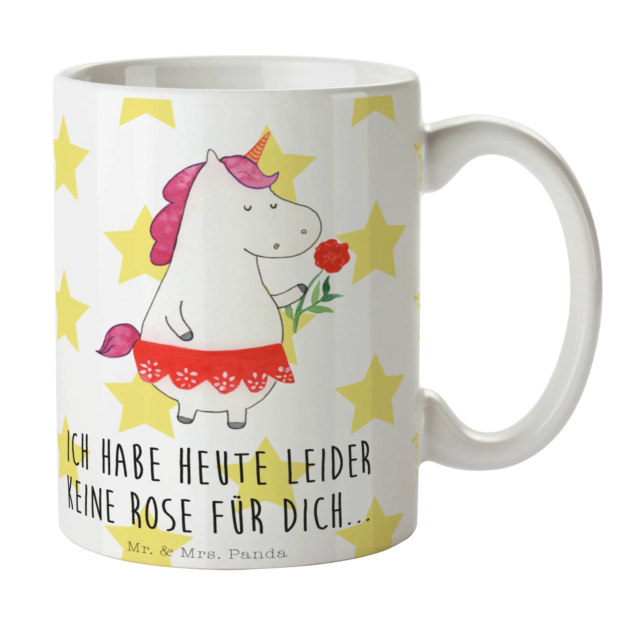 Die bezaubernde Tasse Einhorn Dame aus der Einhorn - Kollektion von Mr. & Mrs. Panda ist das perfekte Geschenk für alle Einhorn-Liebhaber:innen und feine Damen, die das Besondere lieben. Diese Tasse, hergestellt aus hochwertiger Keramik, vereint ein wundervolles Design mit einem charmanten Spruch: 'Ich habe heute leider keine Rose für dich.' Damit wird jeder Kaffee- oder Teegenuss zu einem magischen Erlebnis!