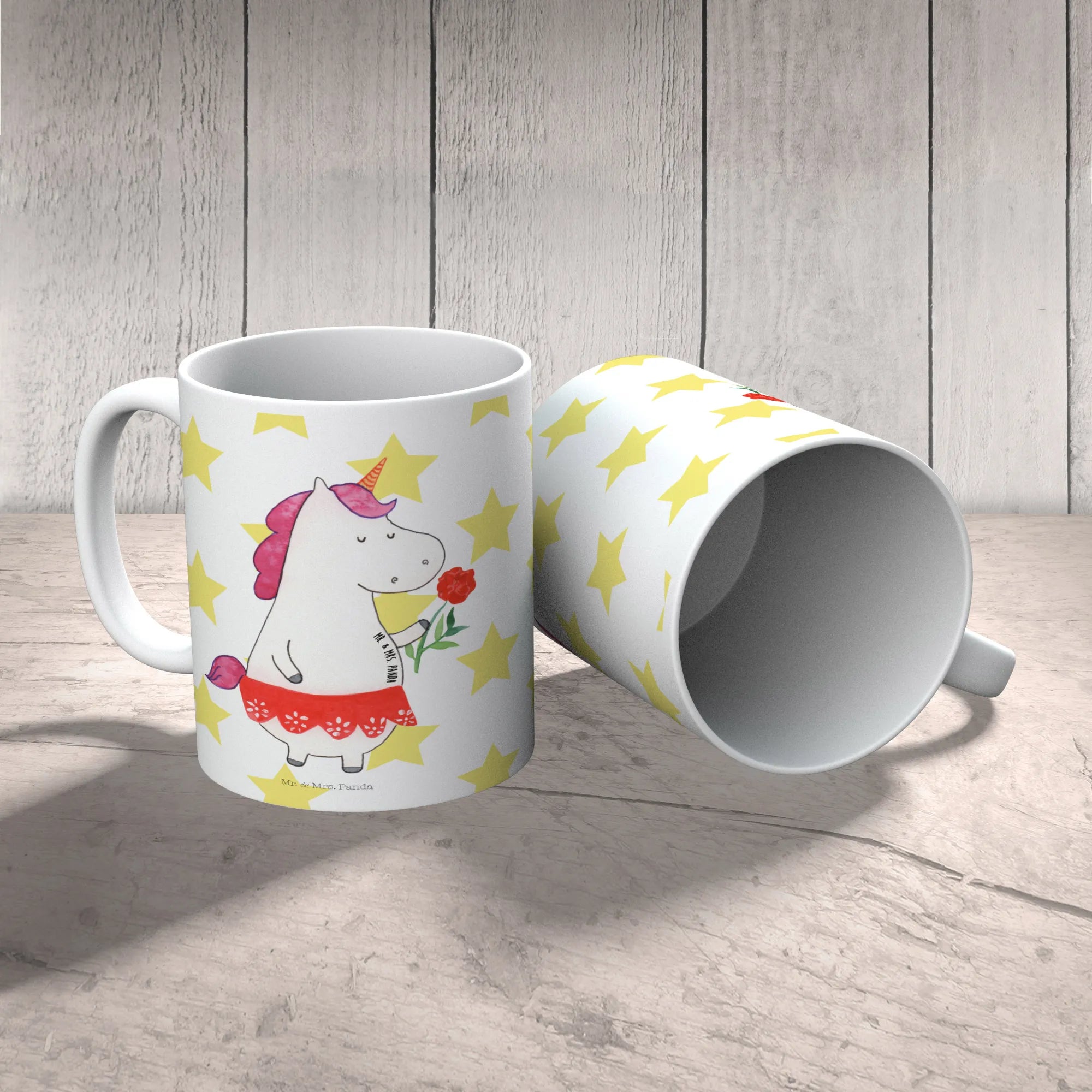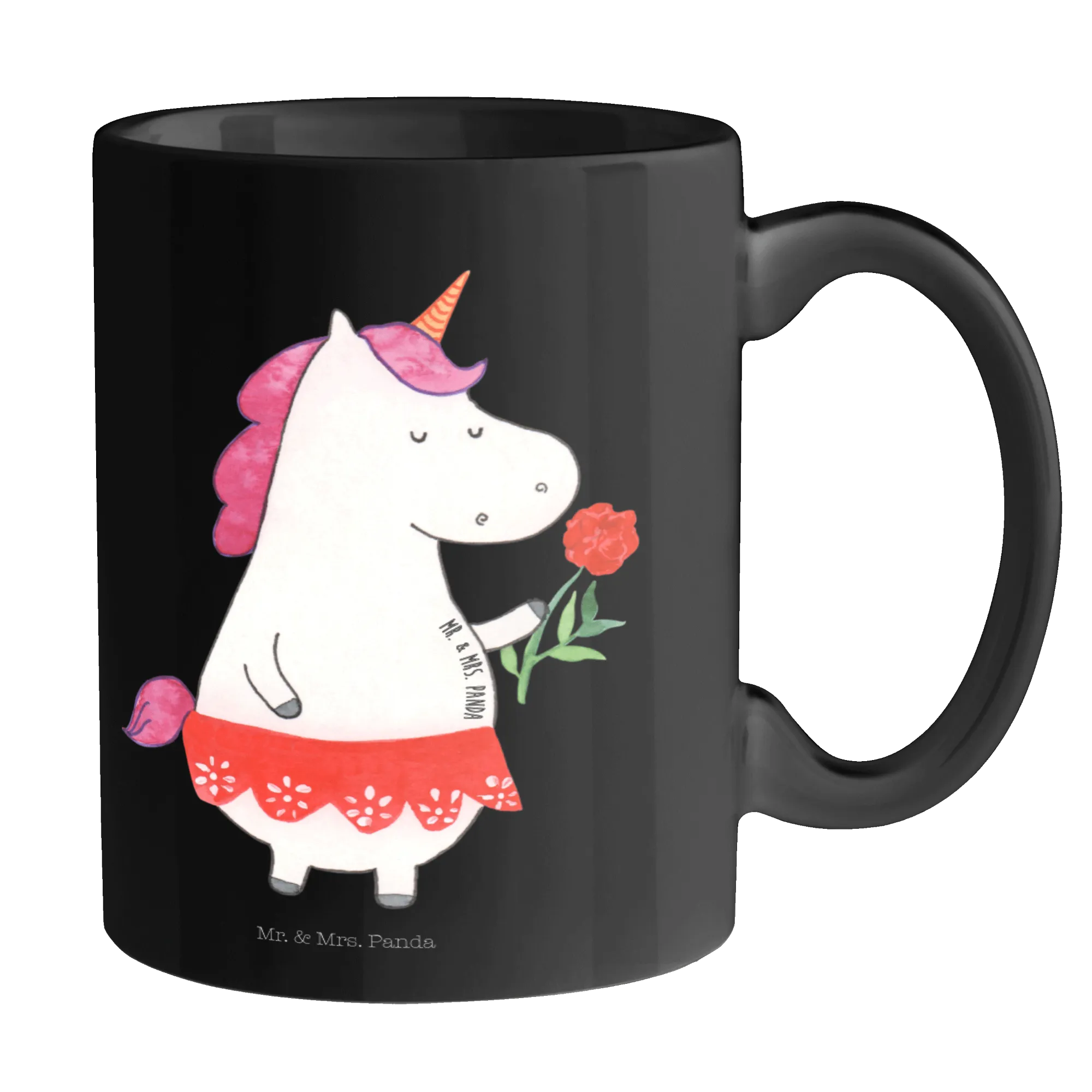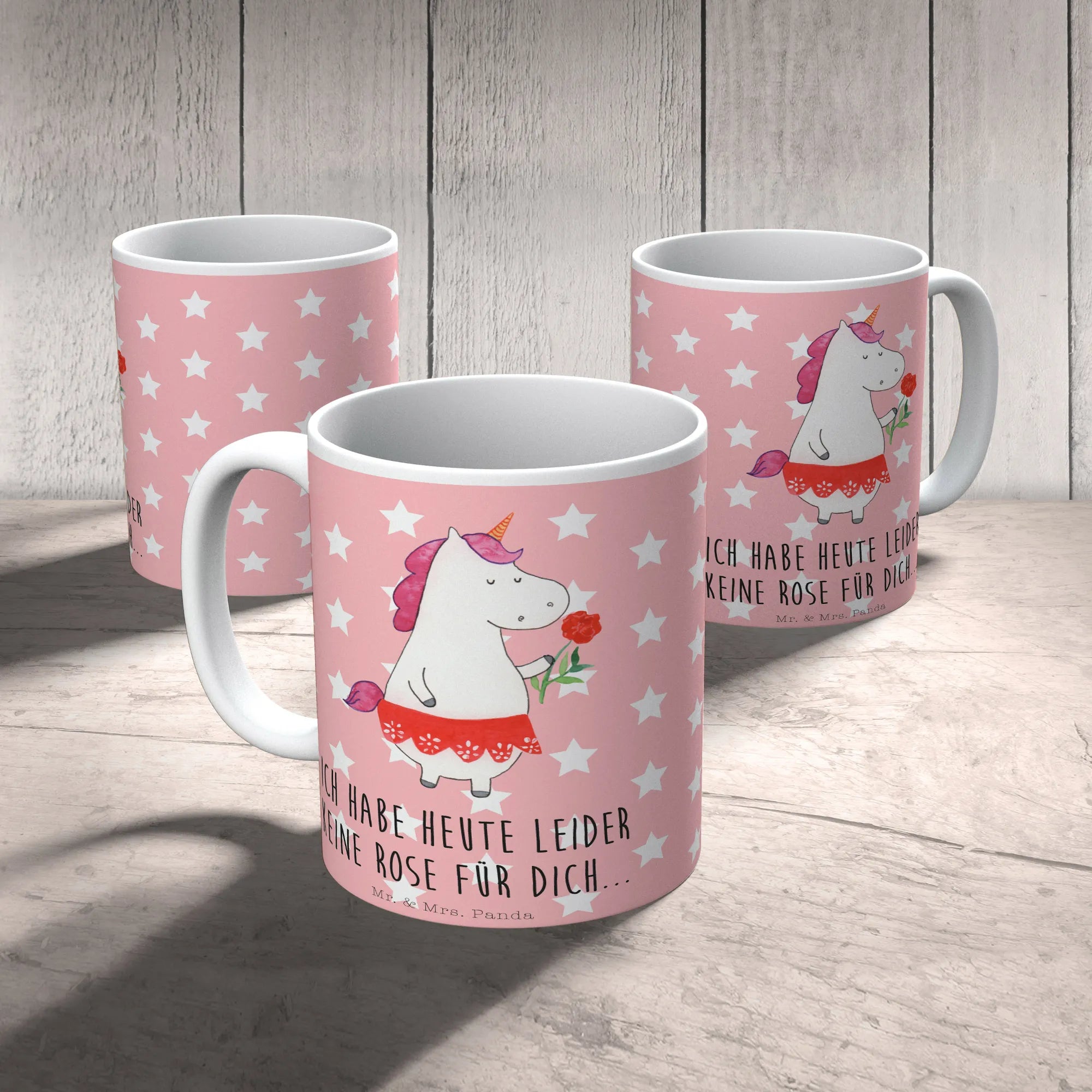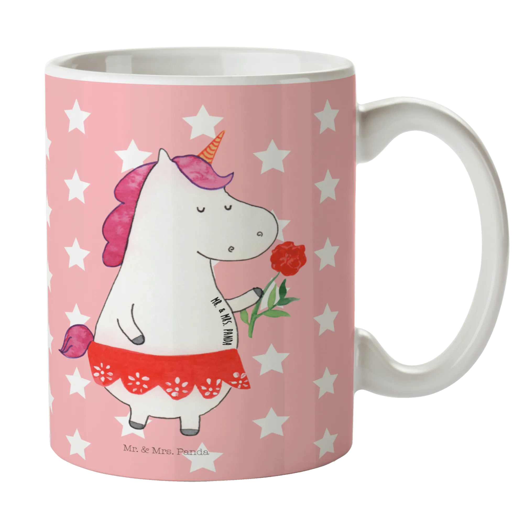 Die bezaubernde Tasse Einhorn Dame aus der Einhorn - Kollektion von Mr. & Mrs. Panda ist das perfekte Geschenk für alle Einhorn-Liebhaber:innen und feine Damen, die das Besondere lieben. Diese Tasse, hergestellt aus hochwertiger Keramik, vereint ein wundervolles Design mit einem charmanten Spruch: 'Ich habe heute leider keine Rose für dich.' Damit wird jeder Kaffee- oder Teegenuss zu einem magischen Erlebnis!