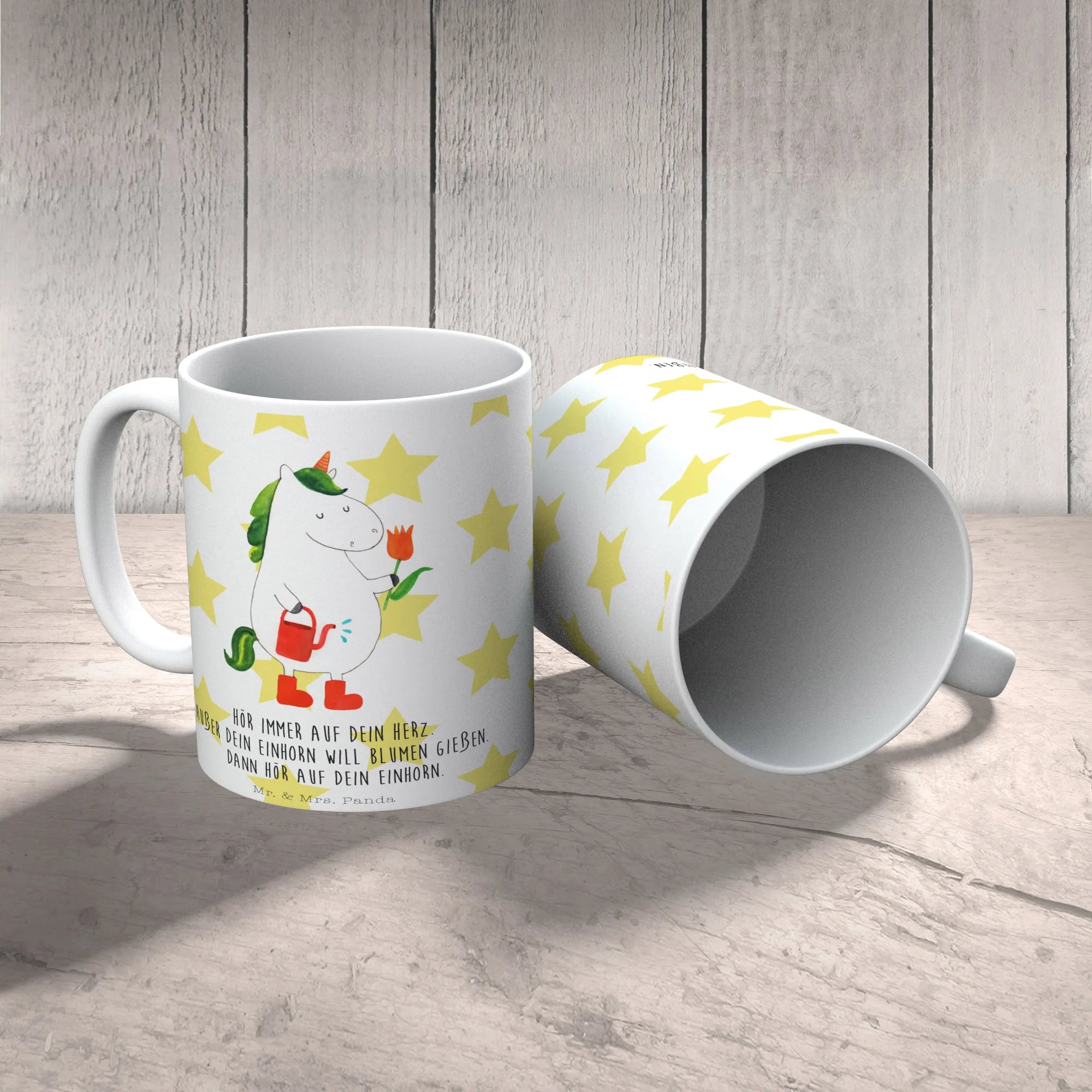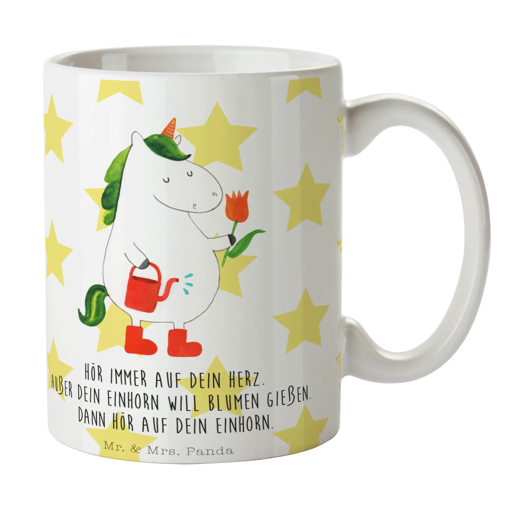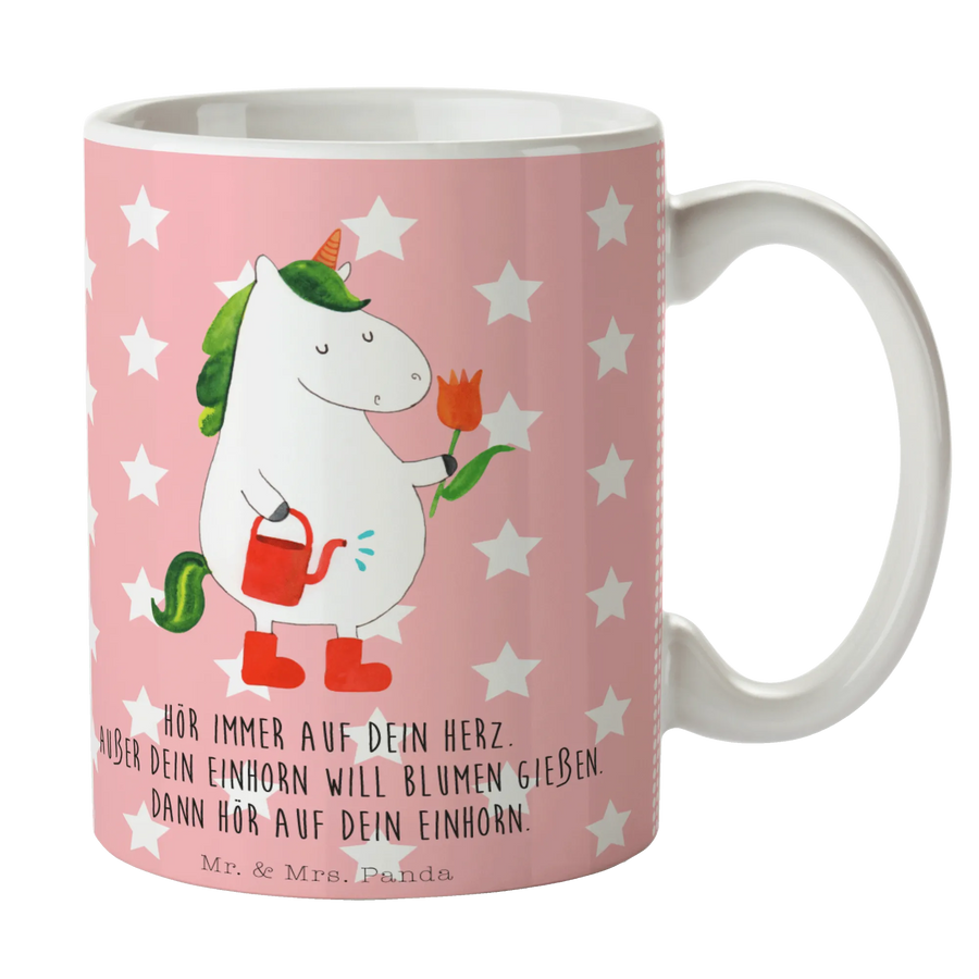 Suchst du ein Geschenk, das direkt ins Herz trifft? Unsere Einhorn Gärtner Tasse aus der Einhorn - Kollektion vereint zauberhaftes Design mit alltagstauglicher Qualität. Das handgezeichnete Motiv von Mrs. Panda zeigt ein niedliches Einhorn mit Gießkanne und Blumen – ein Bild voller Lebenslust und Freude. Der lustige und liebevolle Spruch „Hör immer auf dein Herz. Außer dein Einhorn will Blumen gießen. Dann hör auf dein Einhorn.“ macht die Tasse zum perfekten Begleiter für Frühstück, Büro oder gemütliche Teestunden.