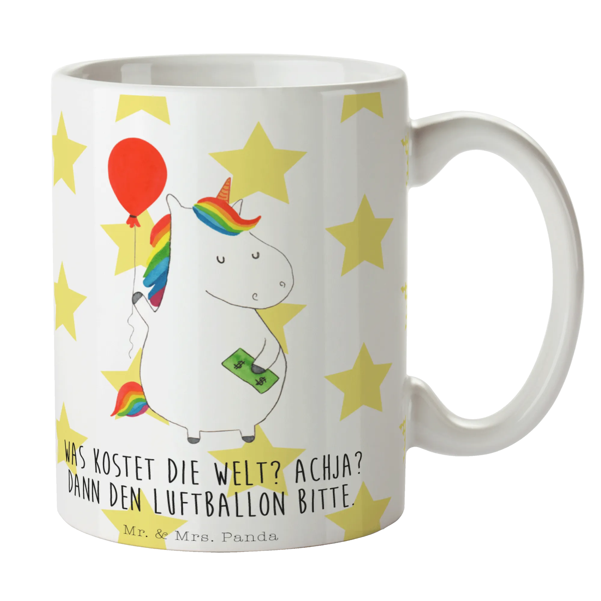 Die wunderschöne Kaffeetasse mit dem süßen Einhorn Luftballon Motiv aus der Einhorn-Kollektion von Mr. & Mrs. Panda ist das perfekte Geschenk für alle Einhorn-Liebhaber und Tee- sowie Kaffee-Enthusiasten! Sie besticht durch ihr bezauberndes Design und den dazugehörigen charmanten Slogan: "Was kostet die Welt? Achja? Dann den Luftballon, bitte." Diese handgezeichnete Keramiktasse hat eine robuste, glänzende Oberfläche und bietet Platz für bis zu 325 ml deines Lieblingsgetränks, sei es köstlicher Kaffee, aromatischer Tee oder ein entspannender Cappuccino.
