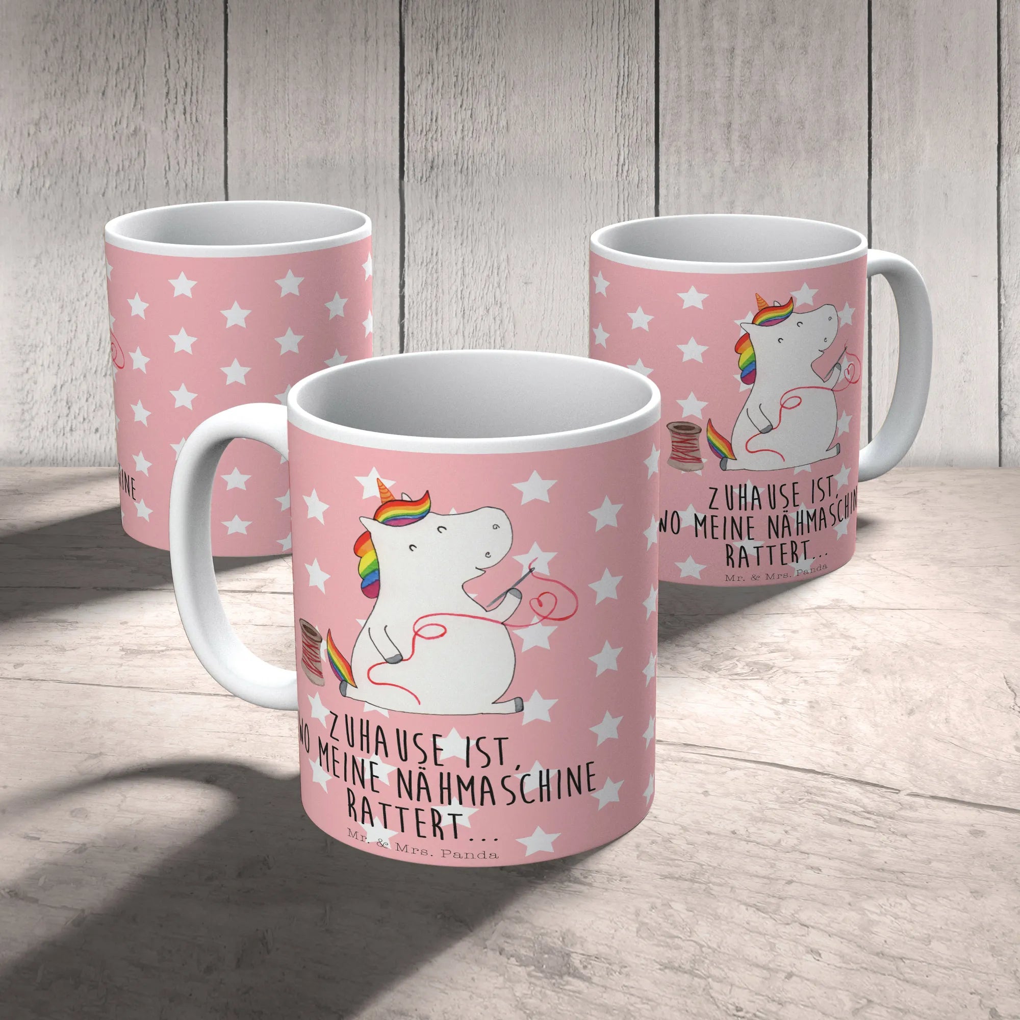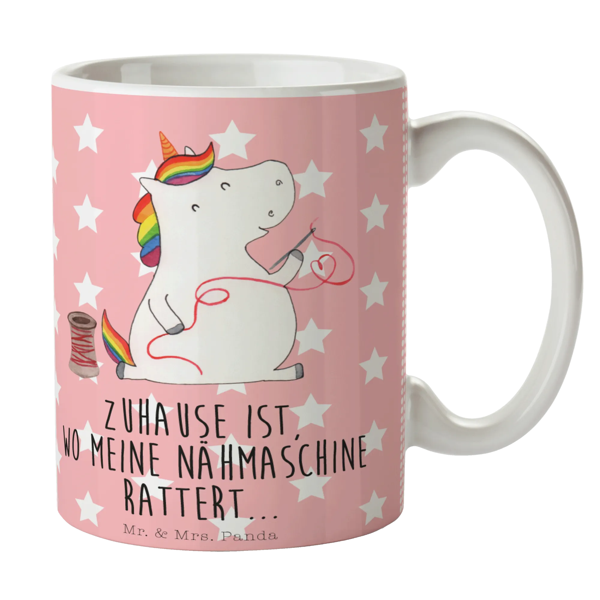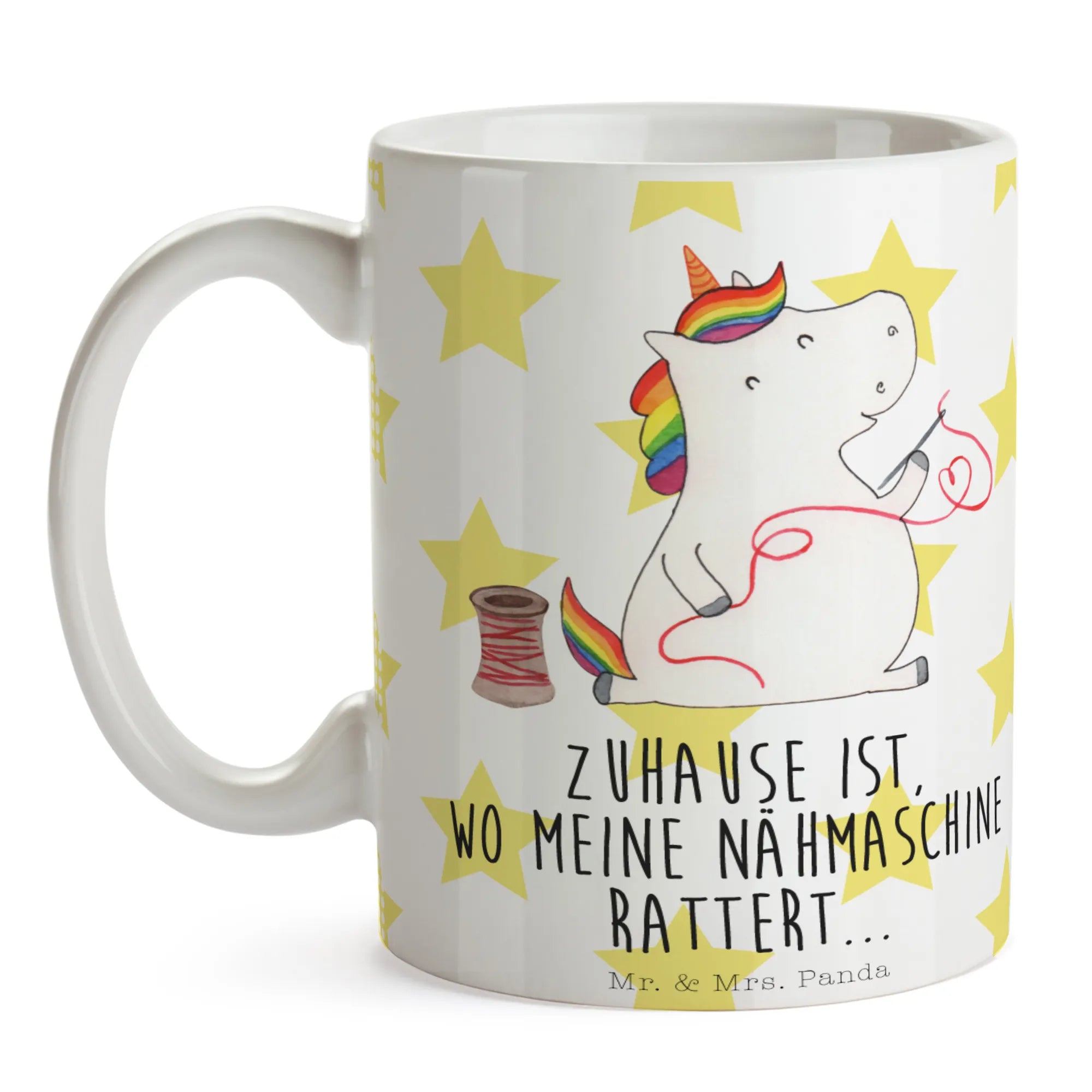 Diese charmante Keramiktasse, die mit dem liebevollen Spruch "Zuhause ist, wo meine Nähmaschine rattert." brilliert, ist nicht nur ein toller Blickfang, sondern auch ein Must-Have für alle Bastlerinnen und Einhorn-Liebhaber. Sie eignet sich ideal für die nächste Kaffeepause im Nähzimmer oder zur Teestunde mit Freundinnen und bringt ganz sicher ein Lächeln auf jedes Gesicht.