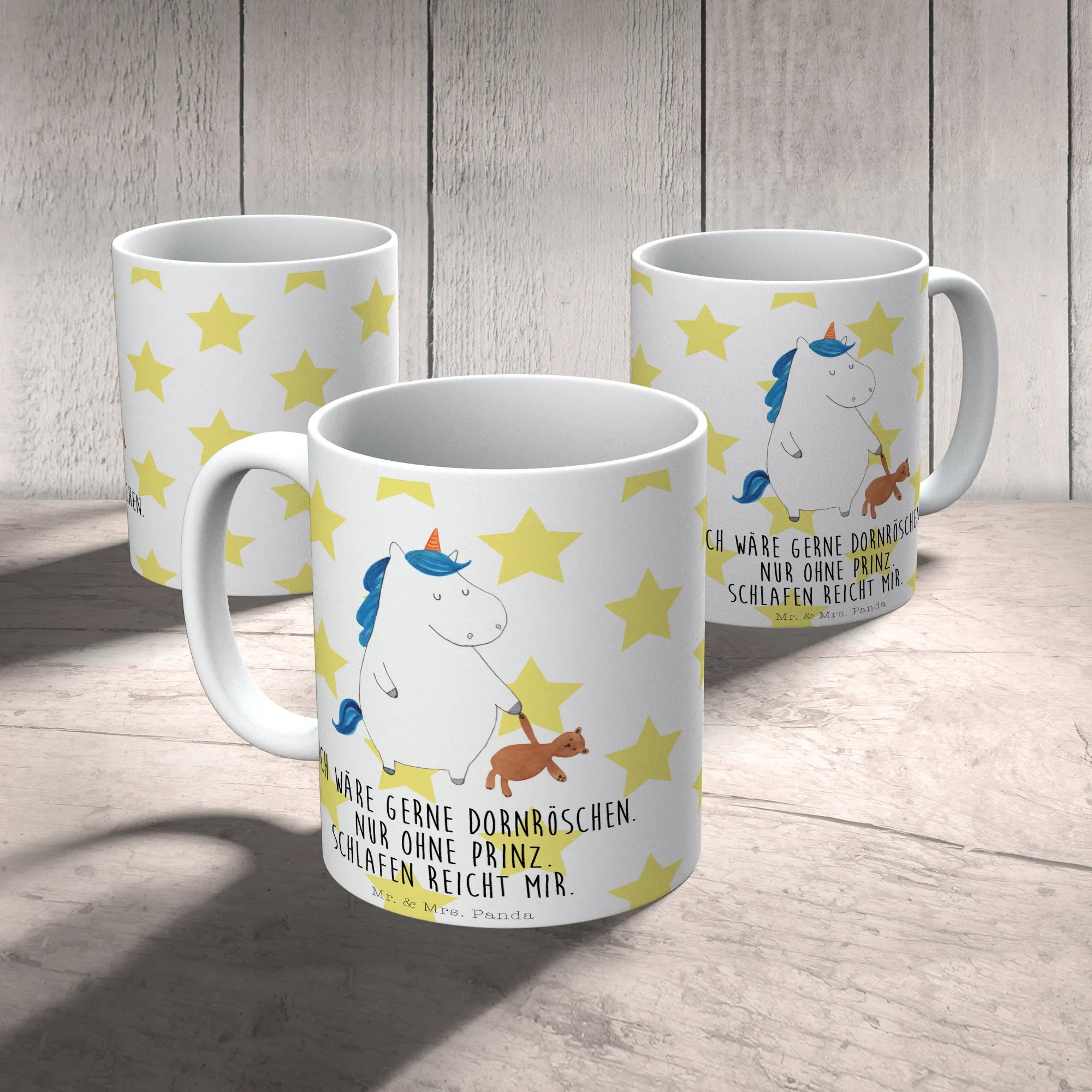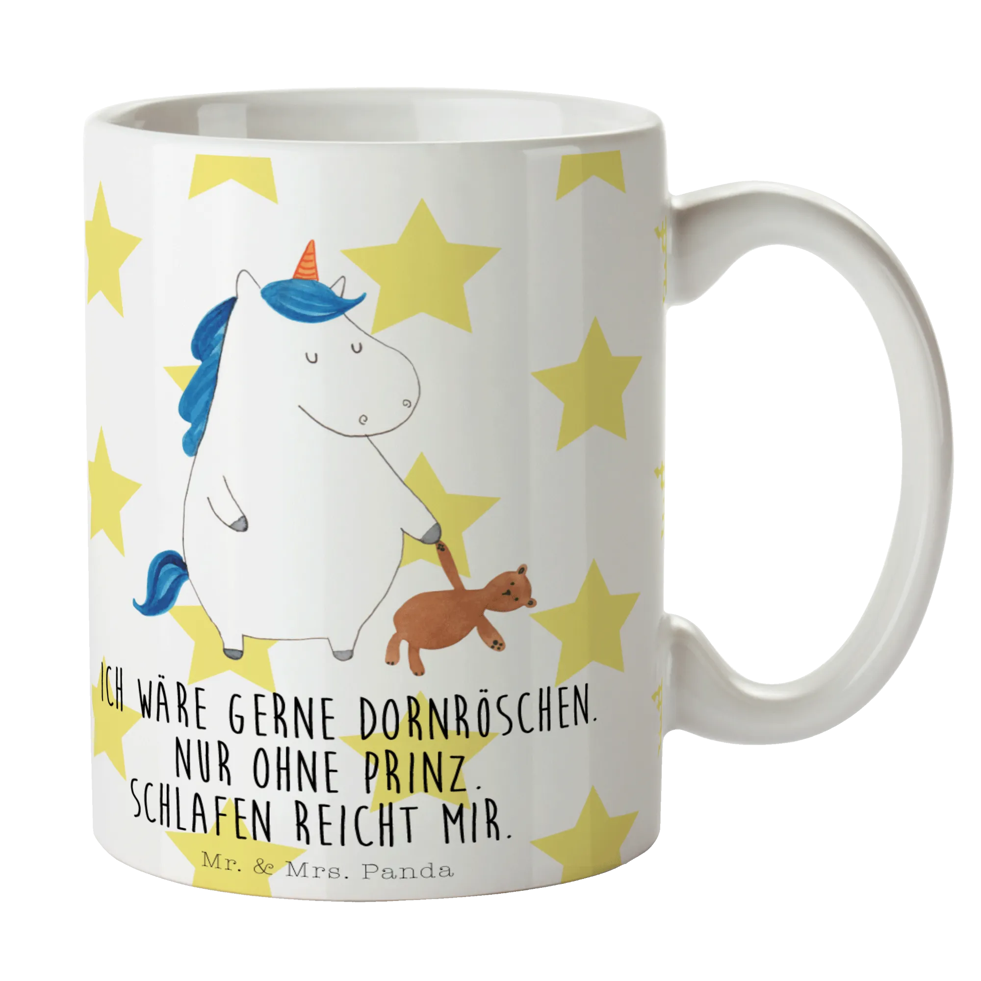 Wenn das Einhorn Teddy mit seinem Teddybären dich ansieht, spürst du sofort eine Wärme der Geborgenheit. Es vermittelt uns die Botschaft, wie wichtig es ist, friedliche Nächte und entspannte Momente zu genießen. Mit dem Motto "Ich wäre gerne Dornröschen. Nur ohne Prinz. Schlafen reicht mir." ermutigt es uns, die Vorteile des Singlelebens zu schätzen und die Zeit für uns selbst zu nutzen. Wer braucht schon einen Prinzen, wenn man mit seinem besten Freund, dem Teddybären, in den Schlaf sinken kann? Während du in die Traumwelt eintauchst, lasse dich von der zauberhaften Kombination aus sanften Farben und liebevollem Design entführen. Lass das Einhorn Teddy für dich stehen und genieße die kleinen Freuden des Lebens. In diesen ruhigen Nächten erwünscht dir das Einhorn die Freiheit, deiner Fantasie freien Lauf zu lassen und neue Geschichten zu träumen.
