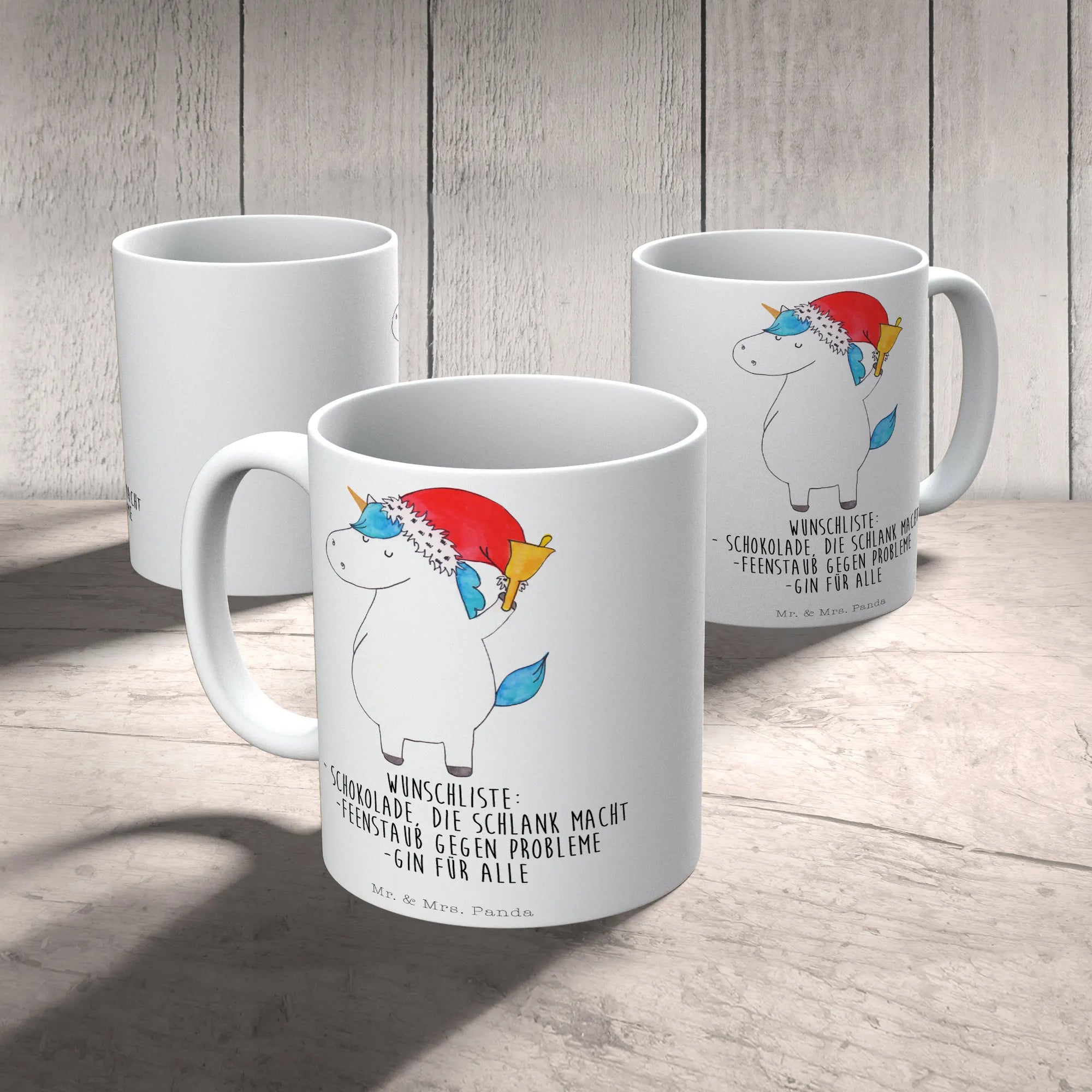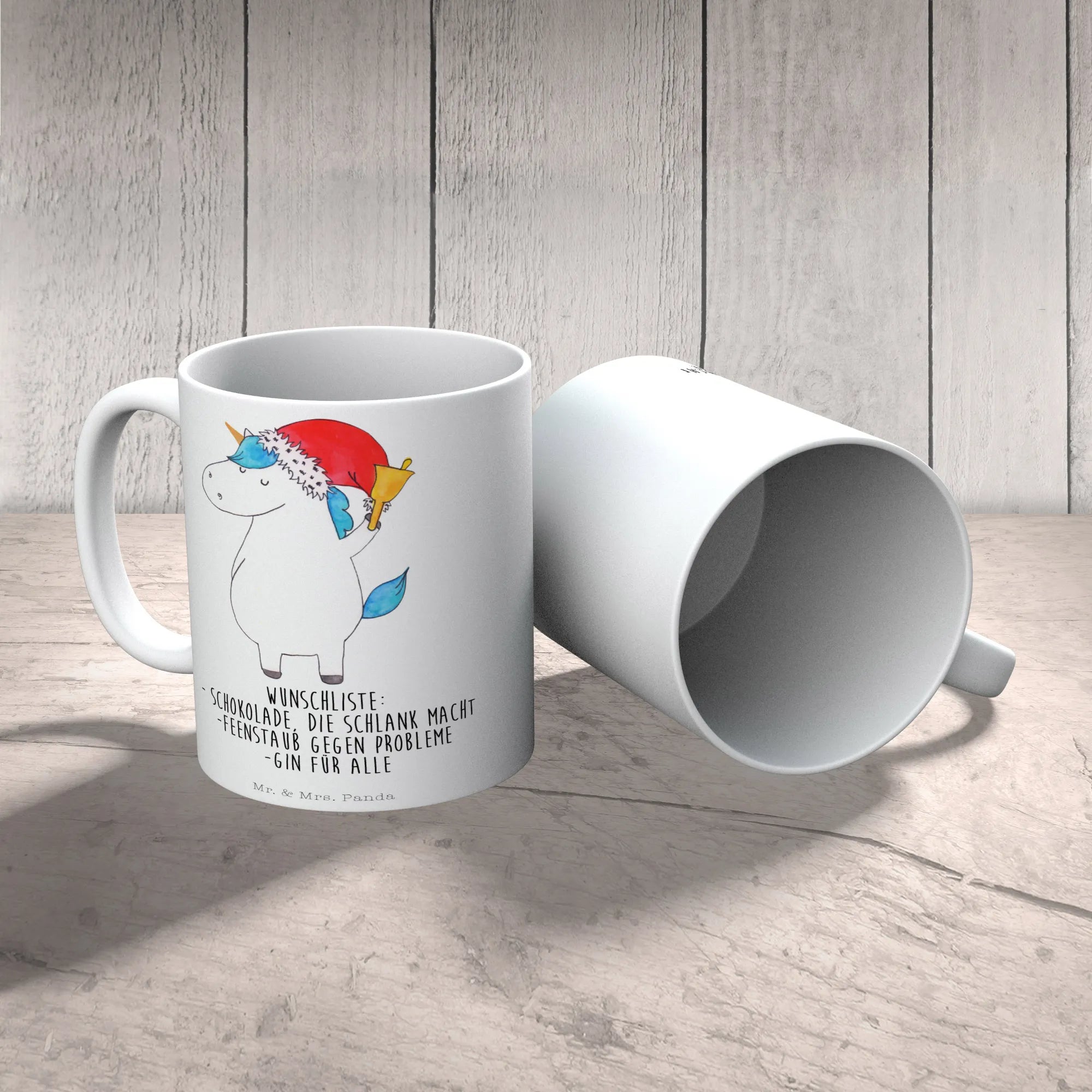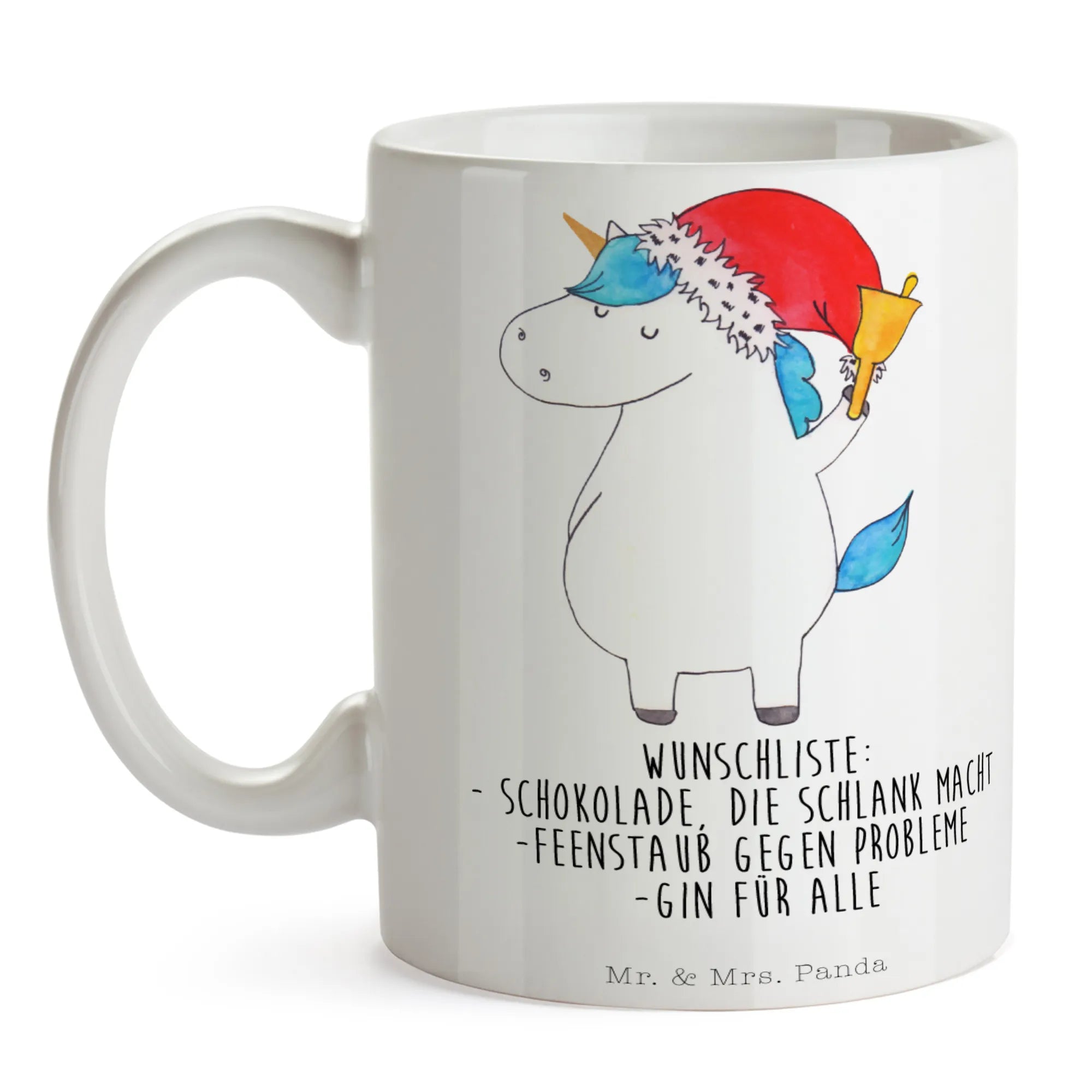 Suchst du das perfekte Weihnachtsgeschenk für Einhorn-Fans? Unsere Mr. & Mrs. Panda Tasse „Einhorn Weihnachtsmann“ aus der Einhorn - Kollektion vereint Humor, Charme und Alltagstauglichkeit. Ein bezauberndes Einhorn hat sich als Weihnachtsmann verkleidet, bimmelt mit einer Glocke und präsentiert die Wunschliste: Schokolade, die schlank macht – Feenstaub gegen Probleme – Gin für alle. Ein frecher Spruch, der garantiert für Gesprächsstoff sorgt.