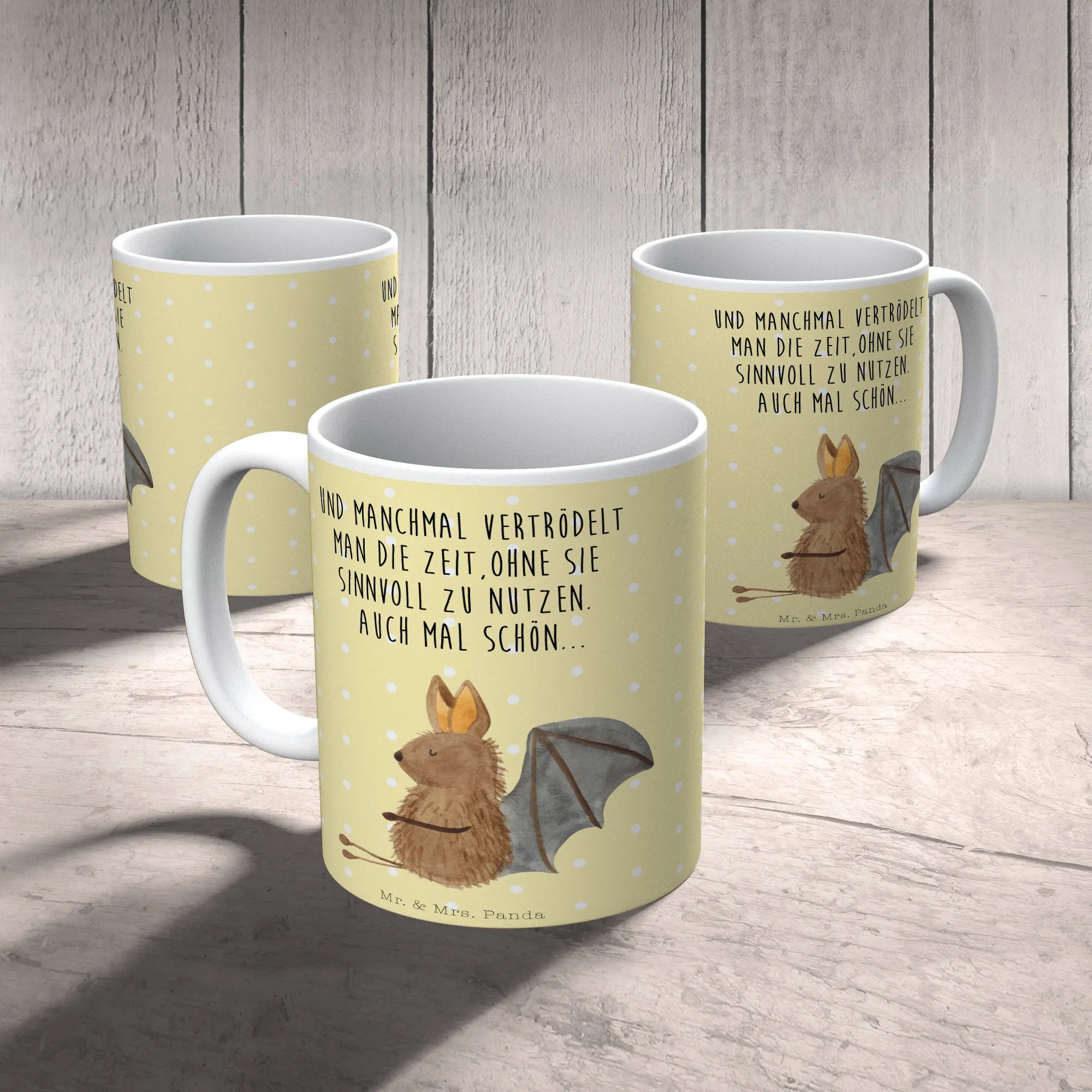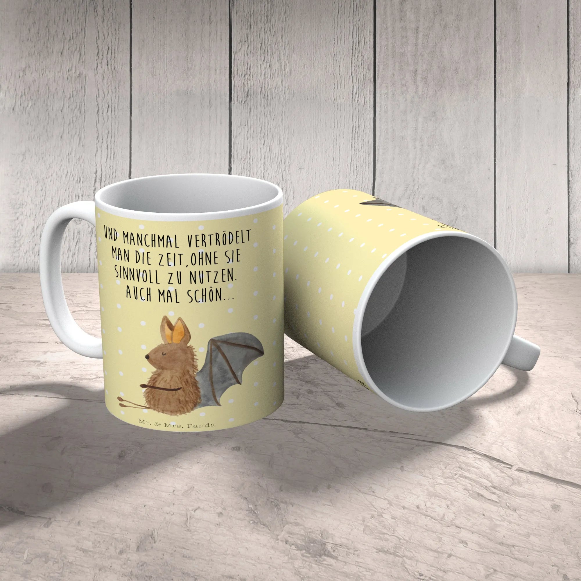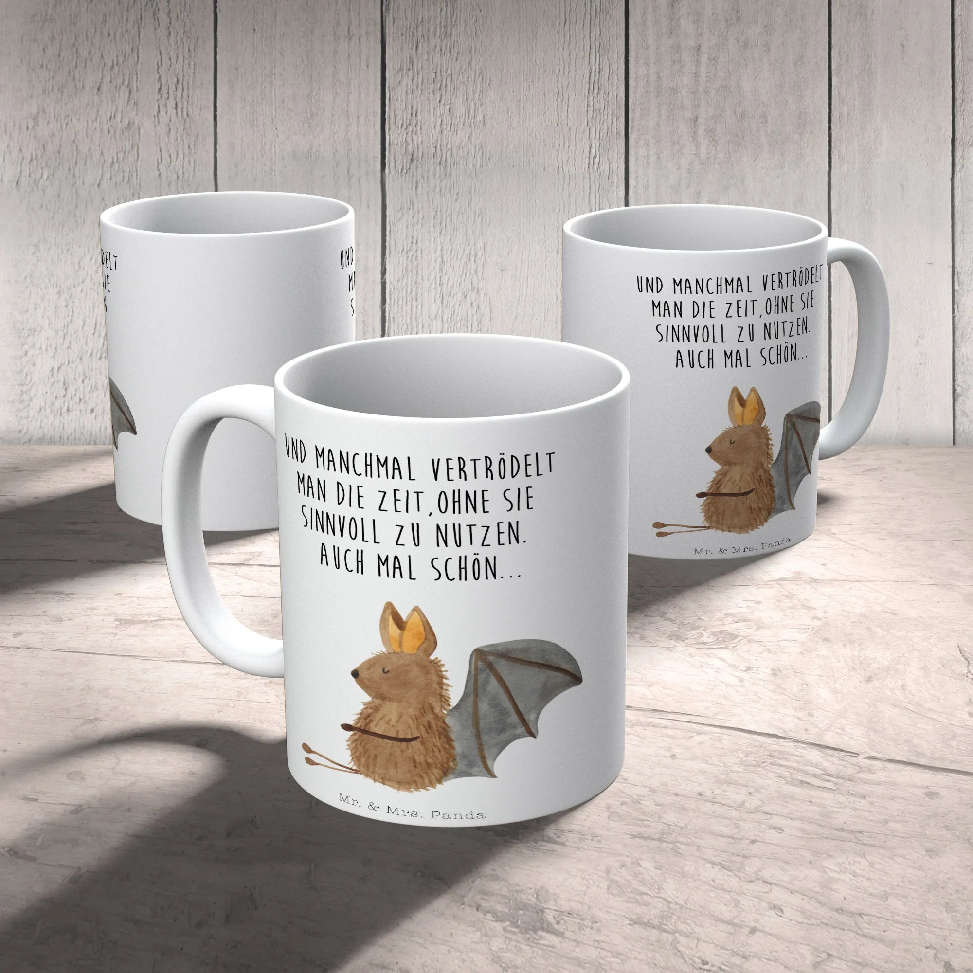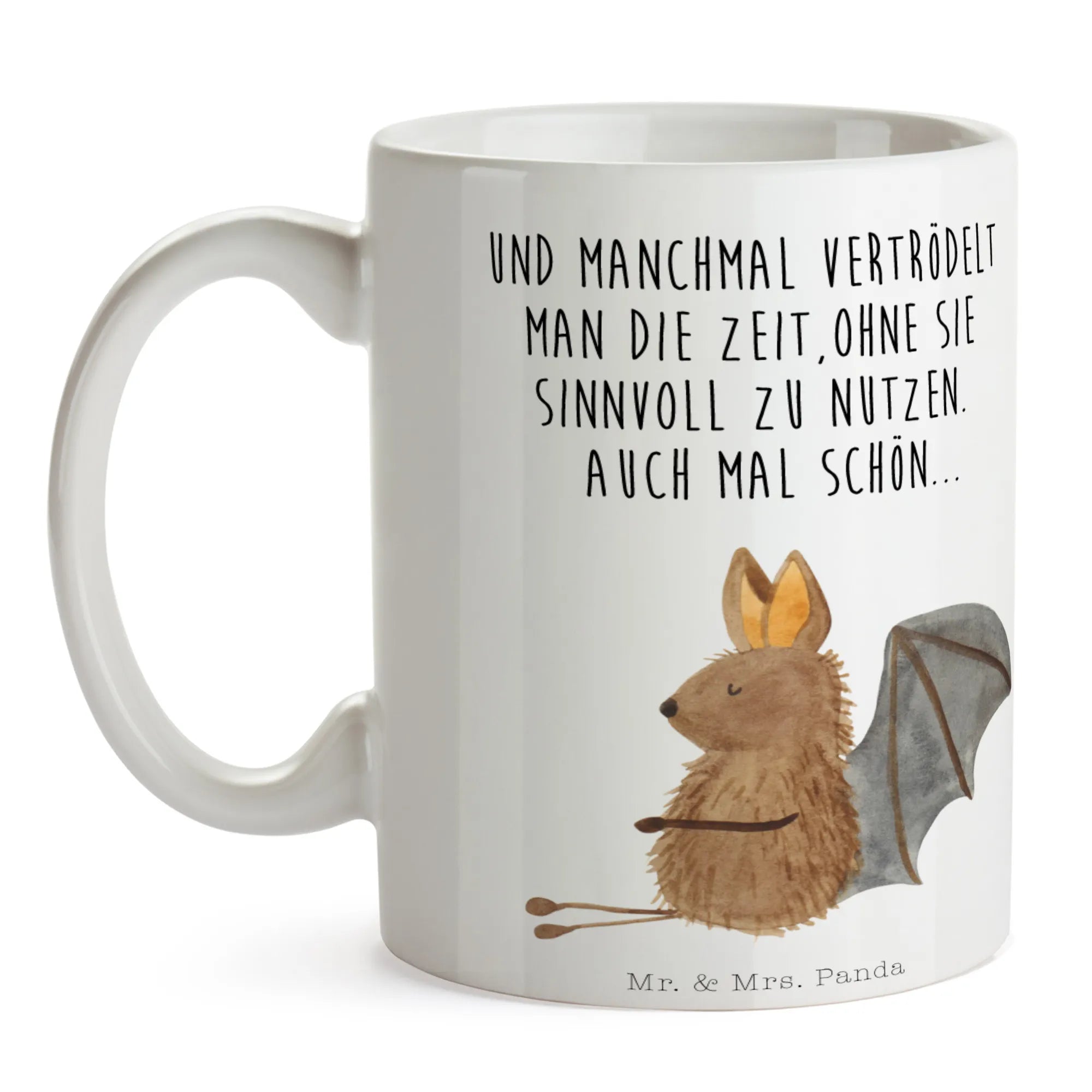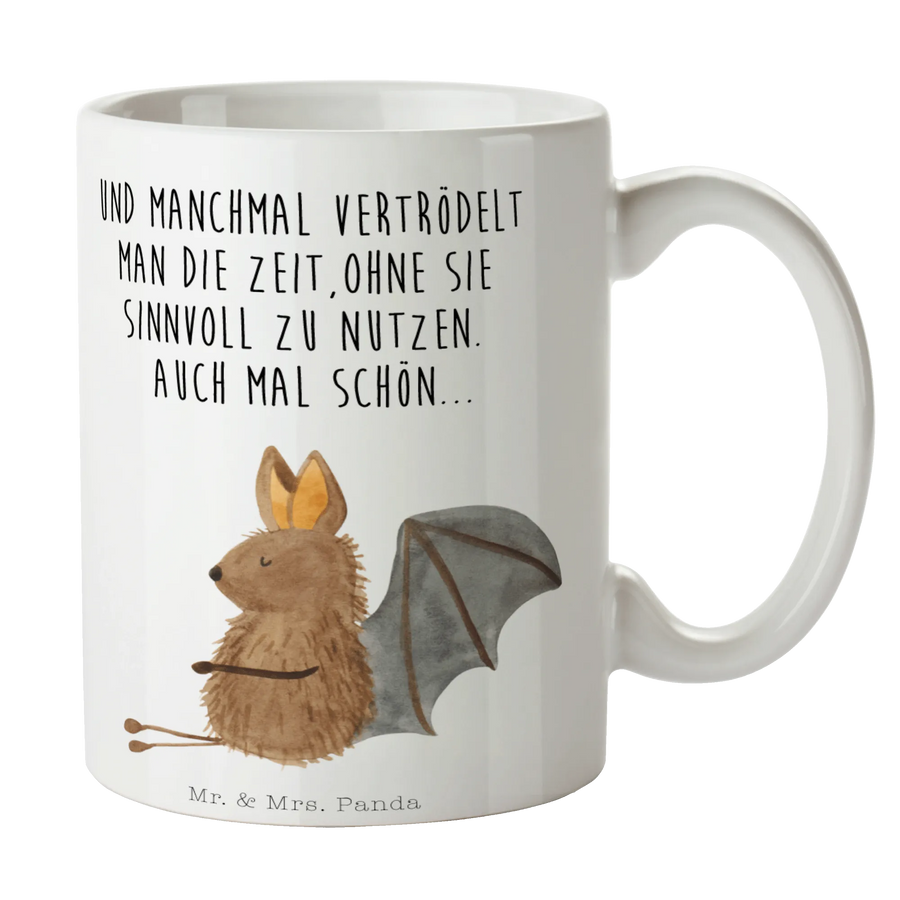 Die süße Fledermaus lächelt dich an und verbreitet Lebensfreude, ganz nach dem Motto: "Und manchmal vertrödelt man die Zeit, ohne sie sinnvoll zu nutzen. Auch mal schön...". Hol Dir dieses kleine Stück Freude nach Hause und genieße Deine Lieblingsgetränke in der charmantesten Tasse der Welt!