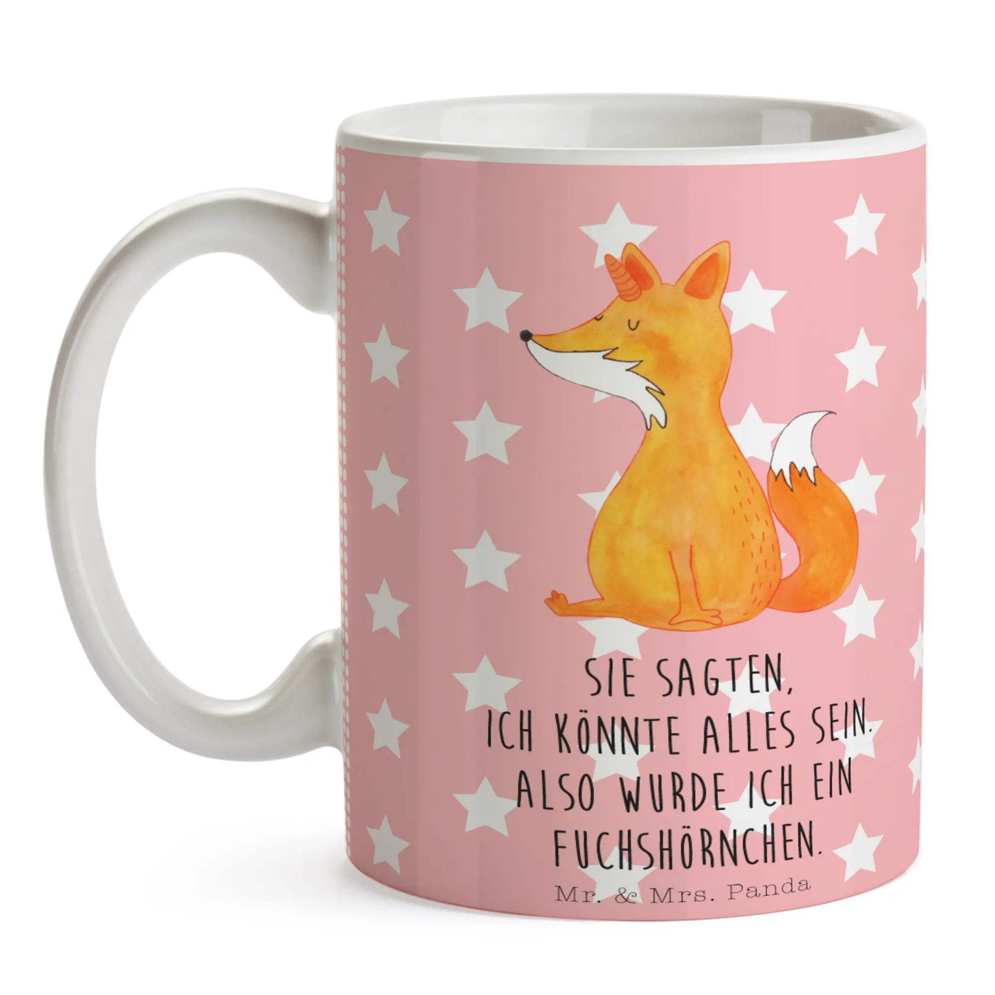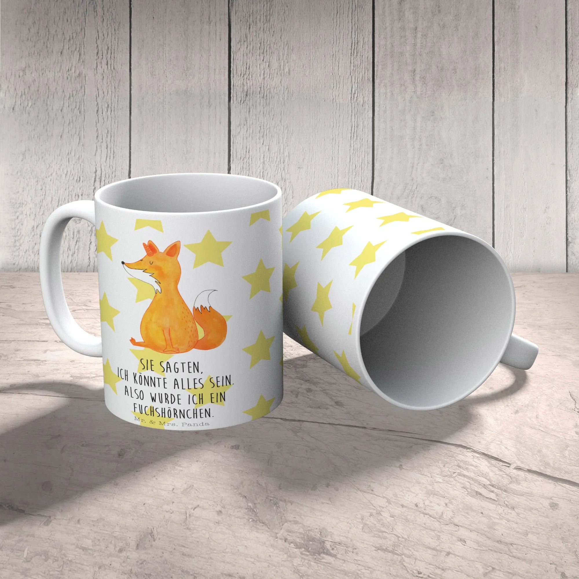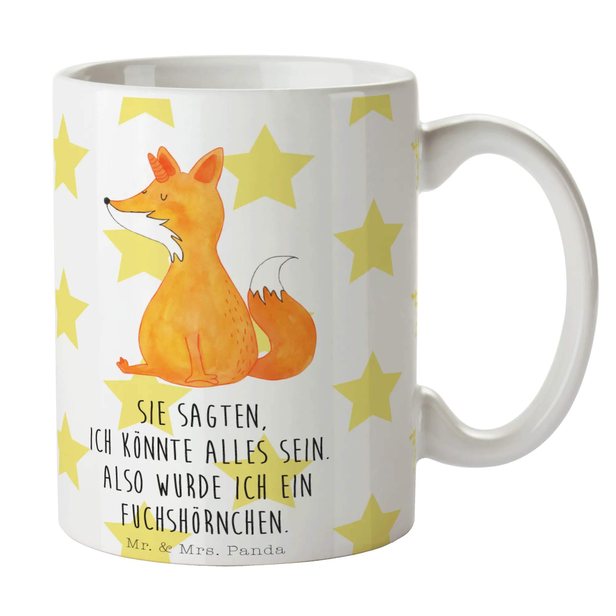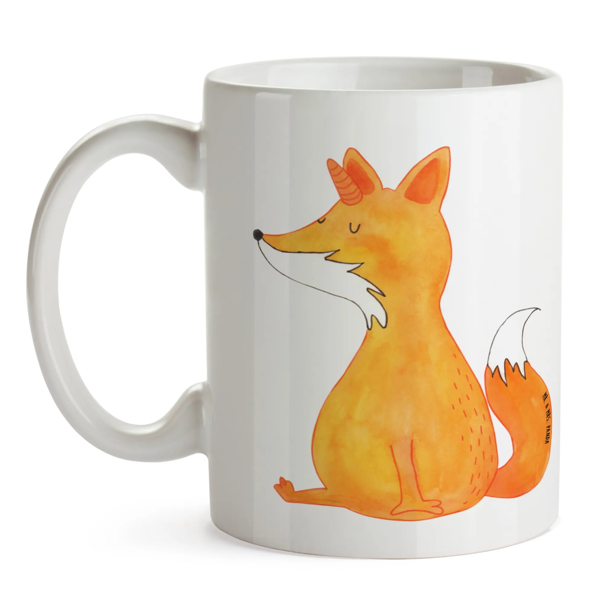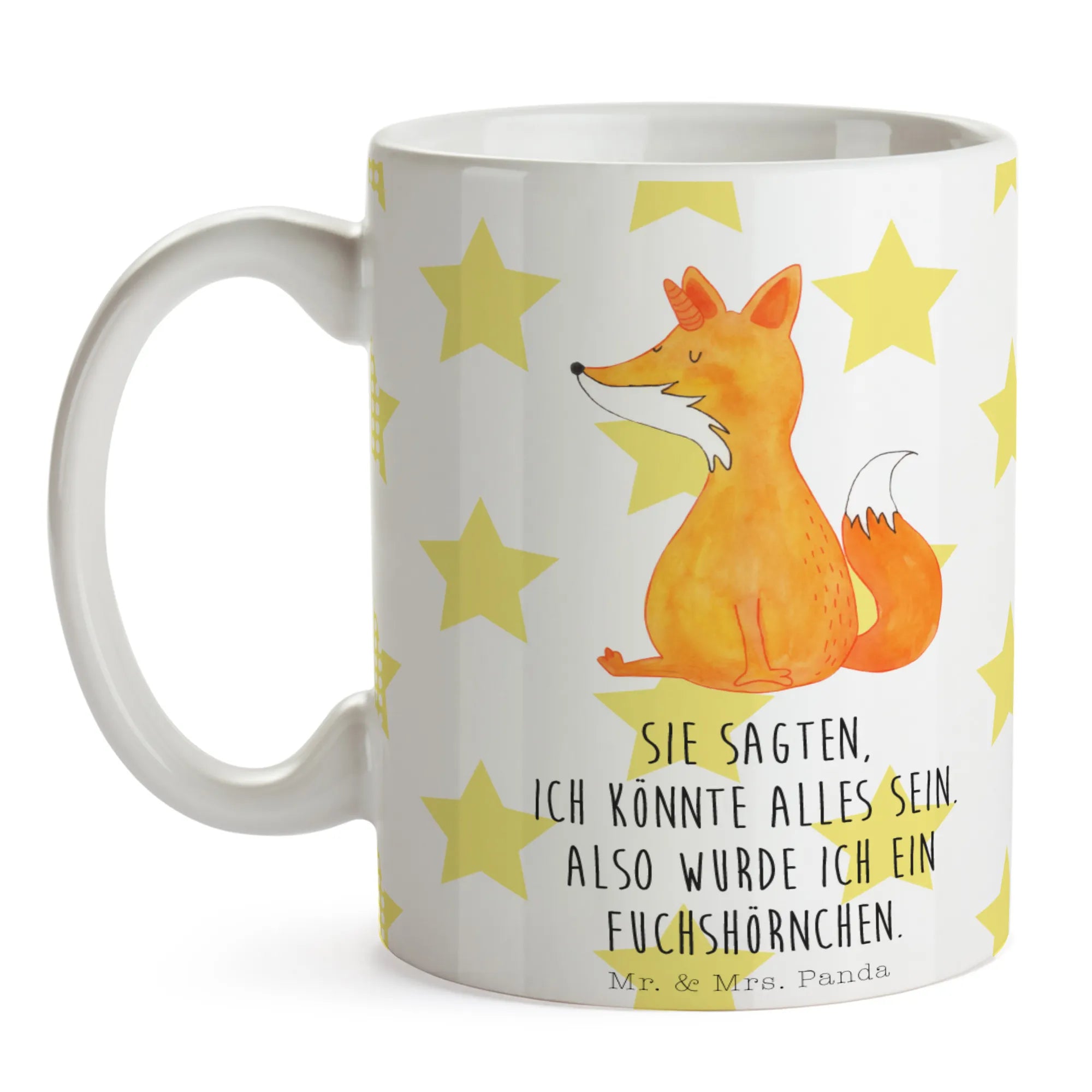 Egal ob für Dich selbst oder als liebevolles Geschenk – die Fuchshörnchen Tasse aus der bezaubernden Einhorn - Kollektion von Mr. & Mrs. Panda ist ein wahres Schmuckstück für jeden Einhornliebhaber! Stell Dir vor, Du nimmst einen großen Schluck von Deinem Lieblingsgetränk aus einer besonders glänzenden Keramiktasse, die mit dem einzigartigen Motiv eines orange-gelben Fuchs mit Einhornhorn bedruckt ist. Diese originelle Tasse ist nicht nur ein praktisches Küchenutensil, sondern bringt auch ein Lächeln auf Dein Gesicht und zieht die Blicke aller an. Der Spruch 'Sie sagten, ich könnte alles sein. Also wurde ich ein Fuchshörnchen.' fasst die zauberhafte, phantasievolle Welt perfekt zusammen, die alle Liebhaber von Einhörnern und Füchsen begeistert.