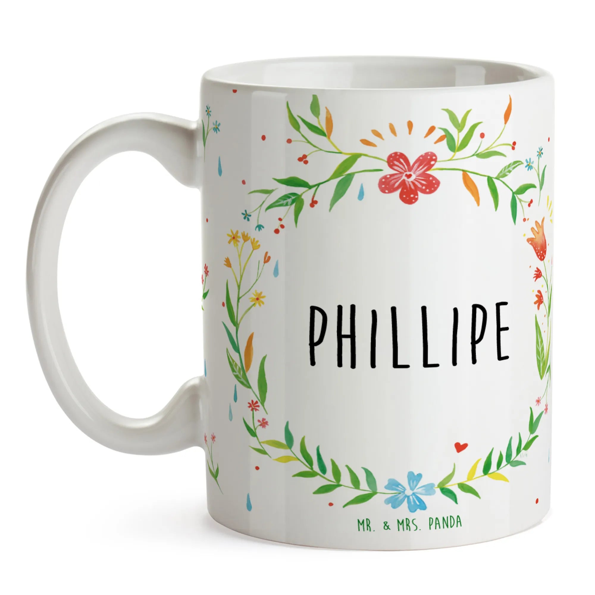 Mr. & Mrs. Panda Tasse "Phillipe" – ein liebevoll gestaltetes Geschenk aus der forenames‑Kollektion. Der Name „Phillipe“ erscheint als klarer Spruch, umkränzt von einer zarten, floralen Blumenranke. Diese Kombination macht die Tasse zu einem persönlichen Lieblingsstück, das morgens Freude schenkt und im Büroalltag für gute Laune sorgt.