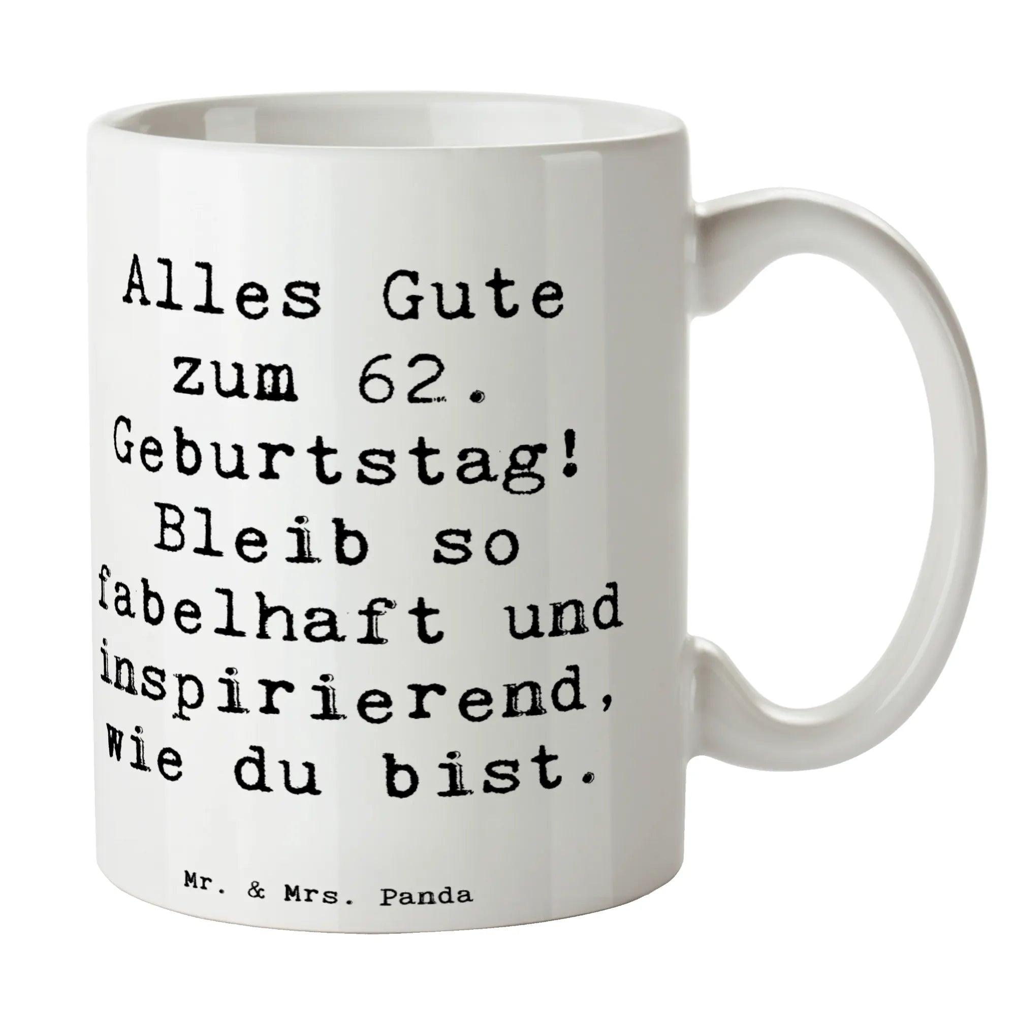 Die wunderschöne Keramiktasse zum 62. Geburtstag von Mr. & Mrs. Panda ist das perfekte Geschenk für alle, die einen ganz besonderen Tag feiern möchten. Mit dem liebevollen Slogan "Alles Gute zum 62. Geburtstag! Bleib so fabelhaft und inspirierend, wie du bist." bringt diese Tasse Freude und Wärme in den Alltag. Sie eignet sich optimal als Geburtstagsgeschenk für deine Eltern, Großeltern oder Freunde, die ihr 62. Lebensjahr feiern.