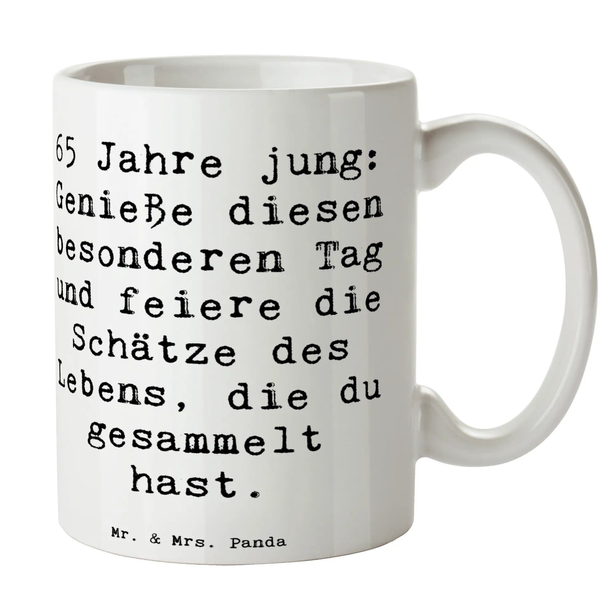 Diese liebevoll designte Tasse von Mr. & Mrs. Panda trägt den fröhlichen Spruch: „65 Jahre jung: Genieße diesen besonderen Tag und feiere die Schätze des Lebens, die du gesammelt hast.“ Sie ist das perfekte Geschenk für alle, die ihren 65. Geburtstag mit einem Lächeln und vielen Erinnerungen begehen möchten.
