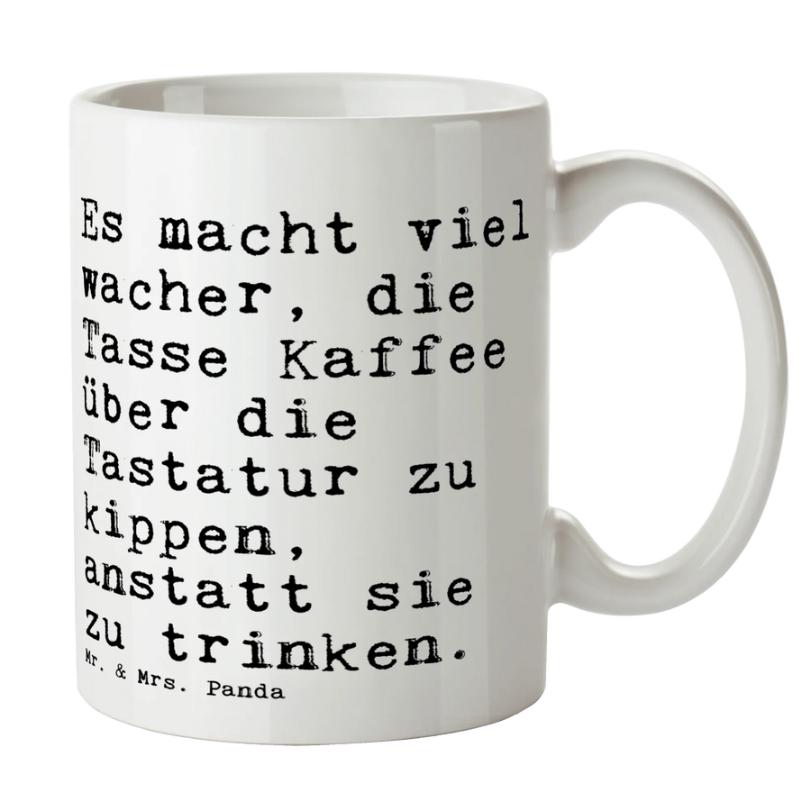 Die perfekte Tasse für all jene, die ihren Kaffee am Arbeitsplatz lieben! Diese wunderschöne spülmaschinenfeste Keramiktasse von Mr. & Mrs. Panda begeistert mit ihrem spritzigen Spruch: "Es macht viel wacher, die Tasse Kaffee über die Tastatur zu kippen, anstatt sie zu trinken." Ein humorvoller Begleiter für jeden Büroalltag, der deinem Kollegen oder deiner Kollegin ein Lächeln ins Gesicht zaubern wird.