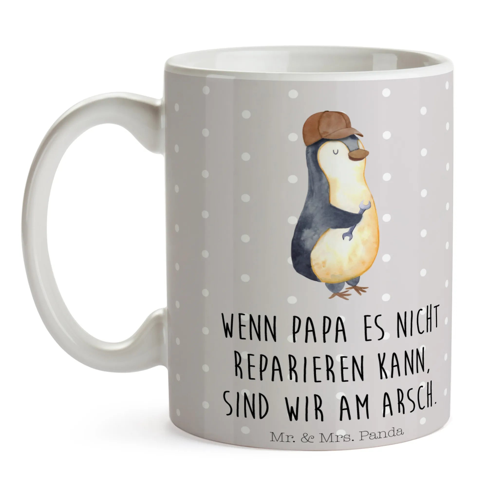 Die Tasse "Wenn Papa es nicht reparieren kann, sind wir am Arsch" von Mr. & Mrs. Panda ist das perfekte Geschenk für alle Väter, die mit Handwerk und Humor glänzen. Diese wunderschöne Keramiktasse ist nicht nur funktional, sondern auch ein echter Hingucker. Mit ihrem charmanten Pinguin-Motiv, der in einer verspielten Pose mit einem Schraubenschlüssel posiert, bringt sie ein Lächeln auf jedes Gesicht.