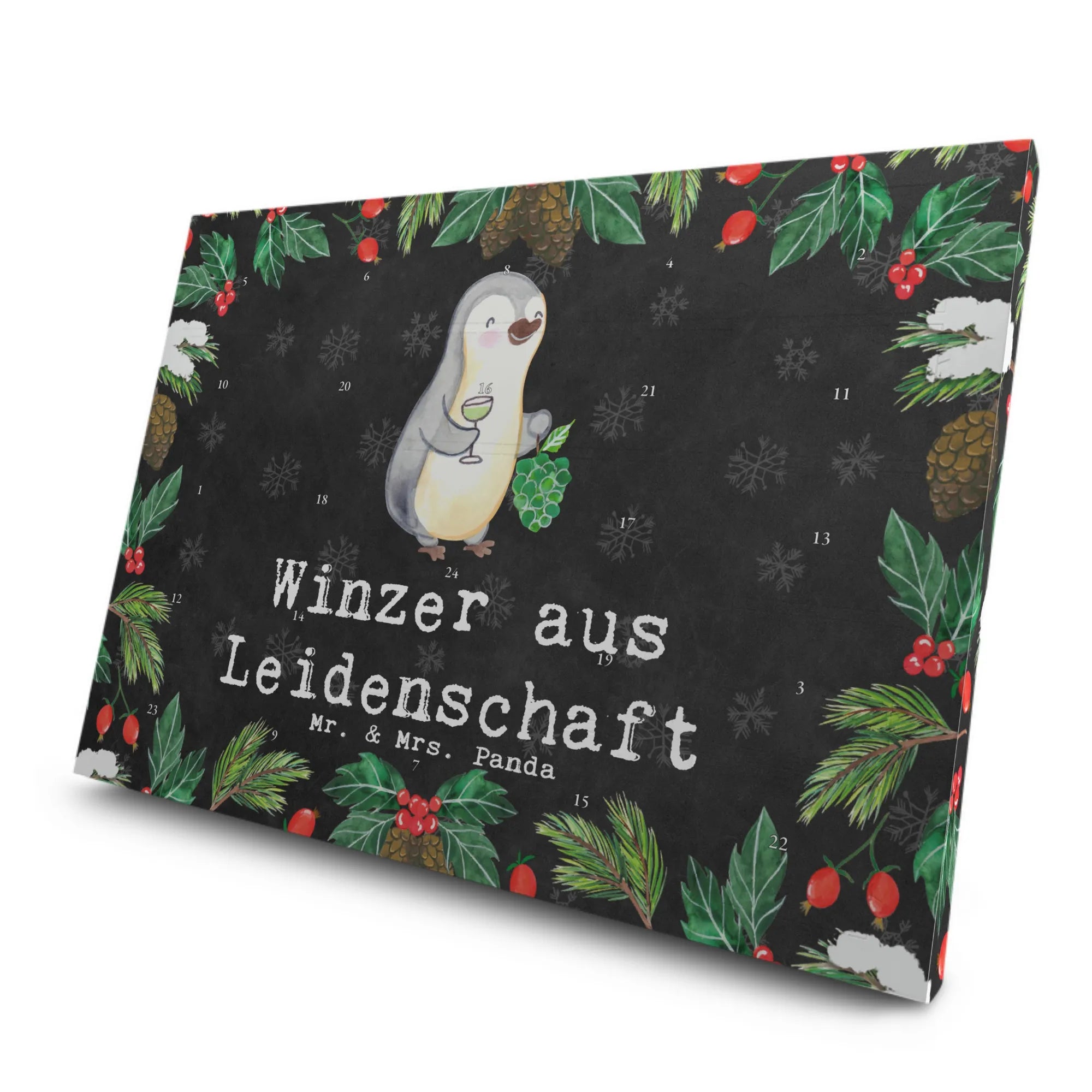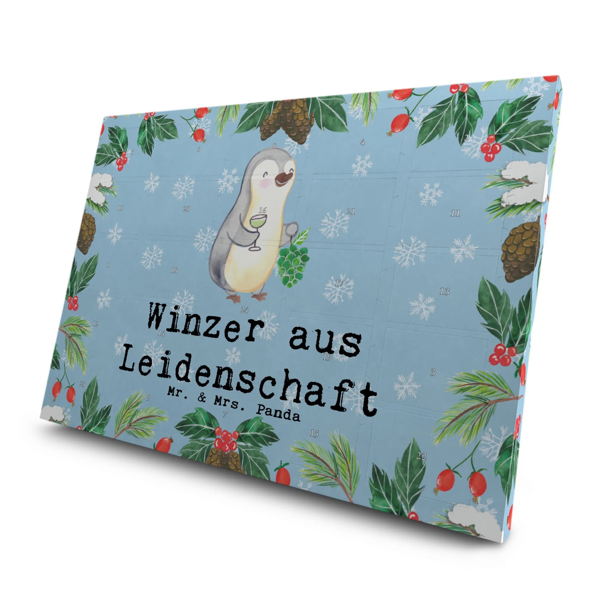 Der Tee Adventskalender "Winzer aus Leidenschaft" von Mr. & Mrs. Panda ist nicht nur ein wunderschönes, sondern auch ein durchdachtes Geschenk für alle Weinliebhaber und Genussmenschen. Mit seinem bezaubernden Motiv eines fröhlichen Pinguins, der Weintrauben in der Hand hält und ein Glas Wein anhebt, verleiht dieser Kalender jedem Adventstag einen Hauch von Freude und Eleganz.