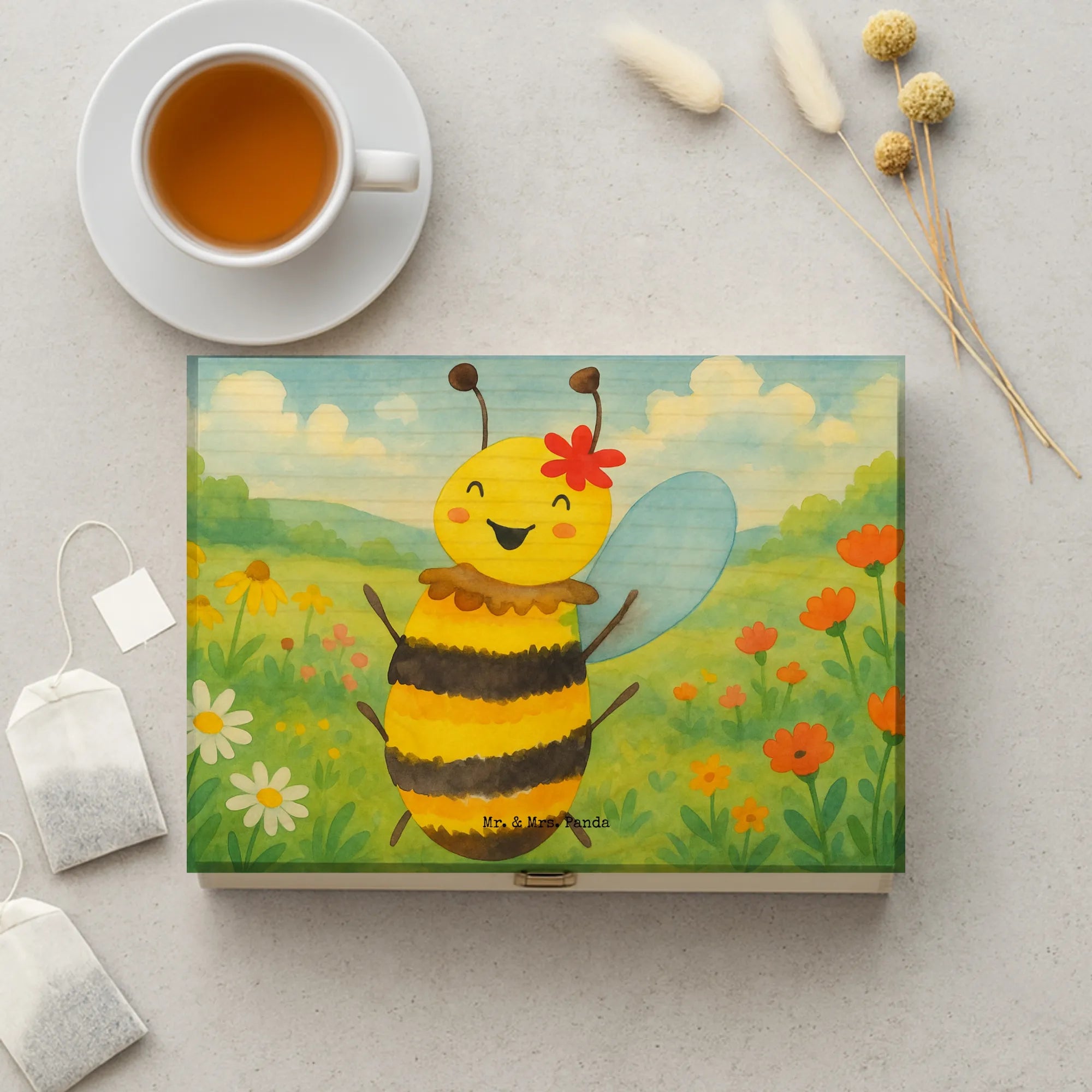 Unsere Holz-Teekiste von Mr. & Mrs. Panda kombiniert Funktionalität mit zauberhaftem Design. Bedruckt mit den wunderschönen Motiven von Mr. & Mrs. Panda verleiht sie deinem Zuhause eine persönliche Note, auch wenn sie nicht personalisierbar ist. Der Druck ist fasertief und wunderschön, gefertigt mit umweltfreundlicher & nachhaltiger Tinte. Dekorative Layouts und Vorlagen machen die Box zu einem tollen Blickfang. Material: 7 mm Birke-Schichtholz an den Kanten gezinkt, Farbe: Natur – robust und natürlich. Die Teebox hat einen sicheren Verschluss und Einschlag-Scharnieren (nicht abschließbar). Maße: 215 mm x 75 mm x 155 mm, Gewicht: 450 g – handlich und stabil zugleich. Innen ist die Box in sechs Fächer unterteilt, ideal als aufbewahrungsbox für teebeutel, tee kiste oder holzteekiste zur übersichtlichen Lagerung verschiedener Sorten. Ob du sie als box für tee, tee organizer box oder vorratsbox tee nutzt – diese Kiste bringt Stil und Ordnung. Ein schönes Geschenk für Freunde oder eine hübsche Ergänzung für dein eigenes Regal.