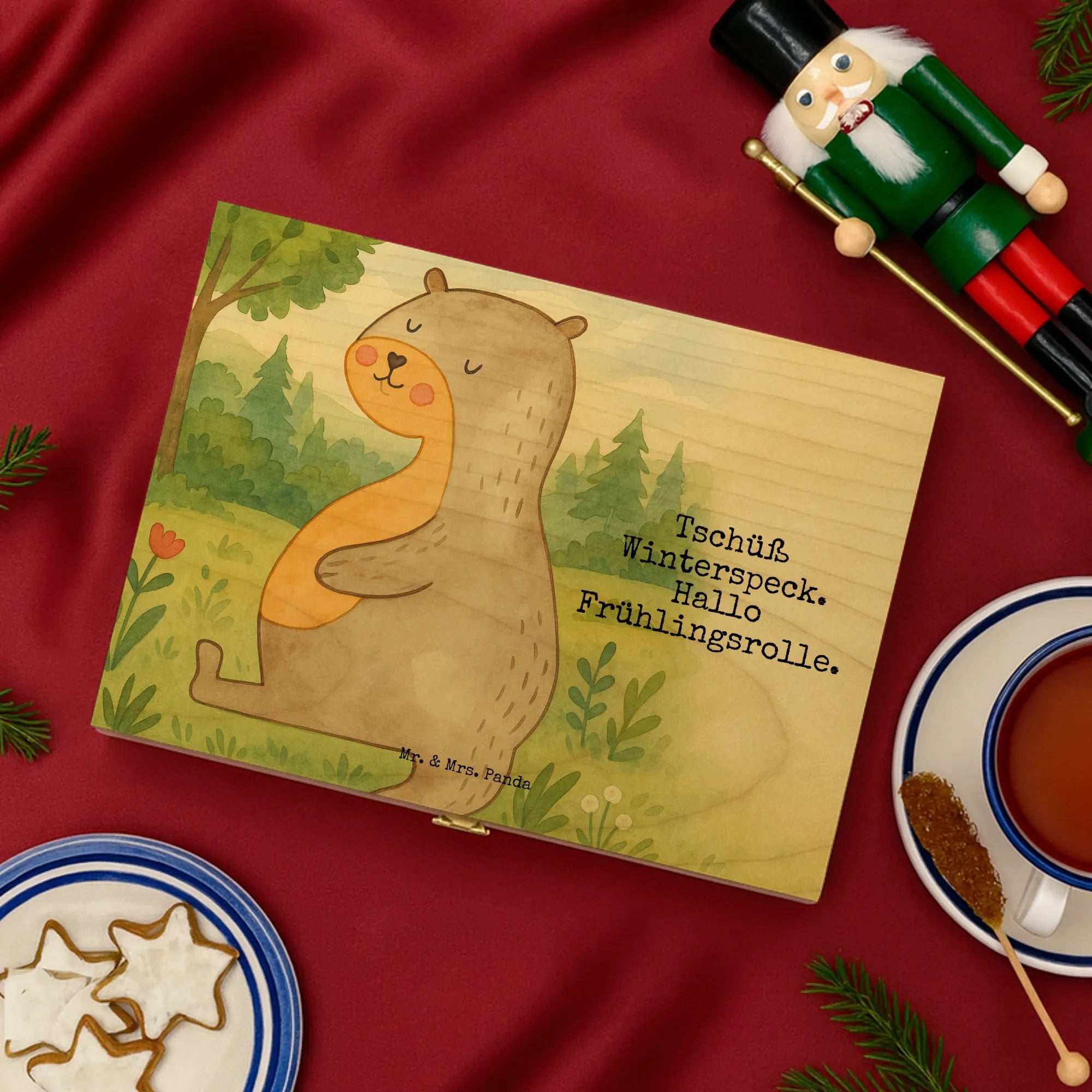 Suchst du eine hübsche und praktische Lösung für deine Teesammlung? Unsere Teekiste von Mr. & Mrs. Panda ist die Antwort. Bedruckt mit den wunderschönen Motiven von Mr. & Mrs. Panda bringt sie Freude in jede Teestunde. Die Box ist nicht personalisierbar, überzeugt aber durch fasertiefen wunderschönen Druck und umweltfreundliche & nachhaltige Tinte. Die dekorativen Layouts und Vorlagen machen das Öffnen zur Freude. Hergestellt aus 7 mm Birke-Schichtholz an den Kanten gezinkt, Farbe: Natur, wirkt die Box edel und gleichzeitig gemütlich. Der Verschluss und die Einschlag-Scharnieren (nicht abschließbar) halten den Inhalt sicher. Maße: 215 mm x 75 mm x 155 mm, Gewicht: 450 g – kompakt und stabil. Innen findest du sechs Fächer, perfekt für tee beutel halter, tee organizer oder teebeutel aufbewahrungsbox. Sortiere deine Lieblingstees nach Geschmack oder Anlass und hab immer alles griffbereit. Ob als Geschenk oder fürs eigene Regal – diese Aufbewahrungsbox für Teebeutel ist praktisch, dekorativ und nachhaltig produziert. Entdecke Ordnung mit Stil.