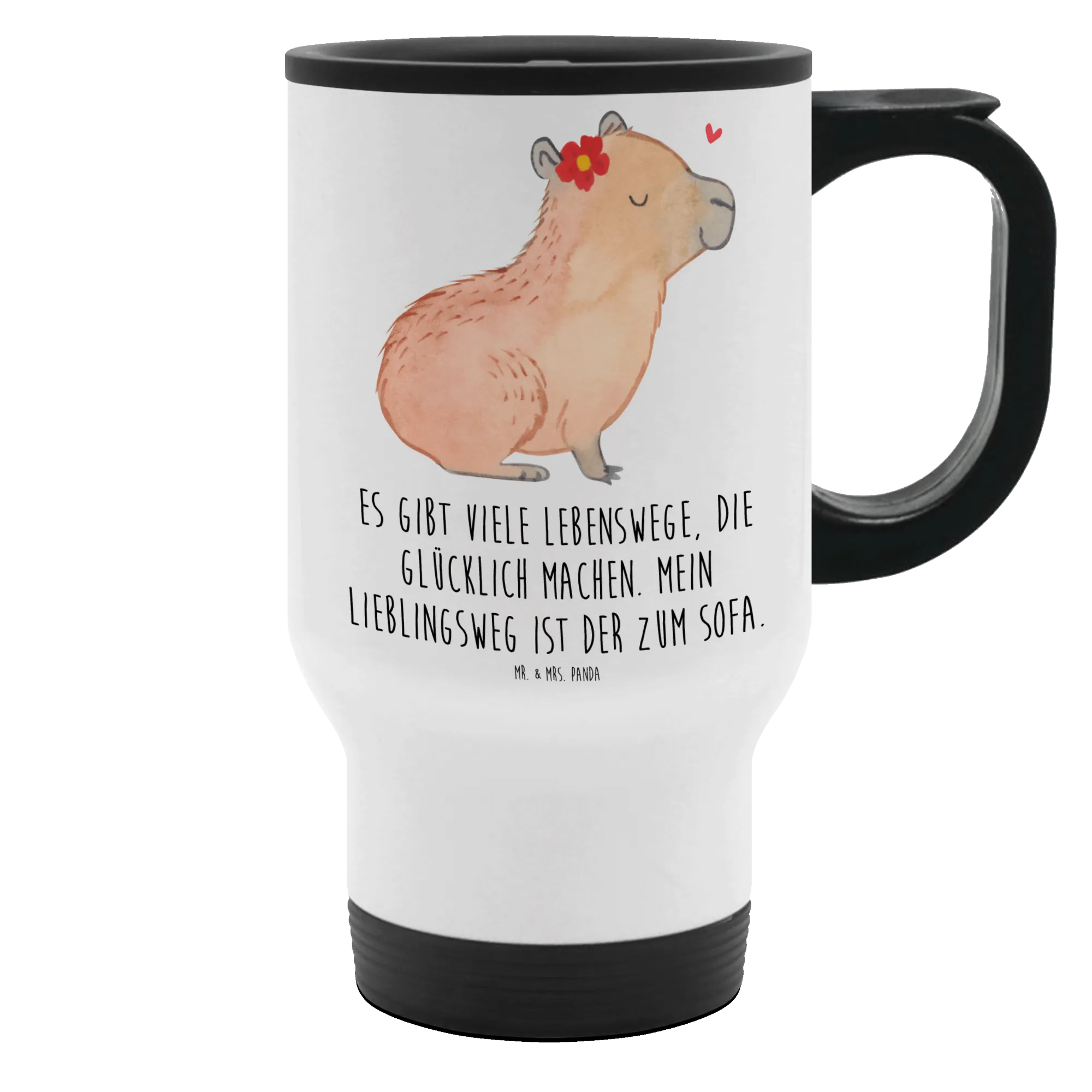 Willkommen in der zauberhaften Welt von Mr. & Mrs. Panda, wo ein kleines Capybara mit geschlossenen Augen und einem liebevollen Lächeln auf dich wartet. Auf diesem entzückenden Motiv trägt das Capybara eine rote Blume mit gelber Mitte auf dem Kopf, die ihm einen besonders verspielten Ausdruck verleiht. Ein schwebendes Herz über dem Capybara unterstreicht die herzliche Atmosphäre und lässt das Ganze noch zauberhafter wirken. Die warmen und sanften Farben der Illustration schenken ein Gefühl von Ruhe und Zufriedenheit. Der Spruch 'Es gibt viele Lebenswege, die glücklich machen. Mein Lieblingsweg ist der zum Sofa.' bringt die Gelassenheit und Freude, die dieses Motiv ausstrahlt, auf den Punkt, und lädt dich ein, dich dem Capybara anzuschließen und die einfachen, glücklichen Momente zu genießen.