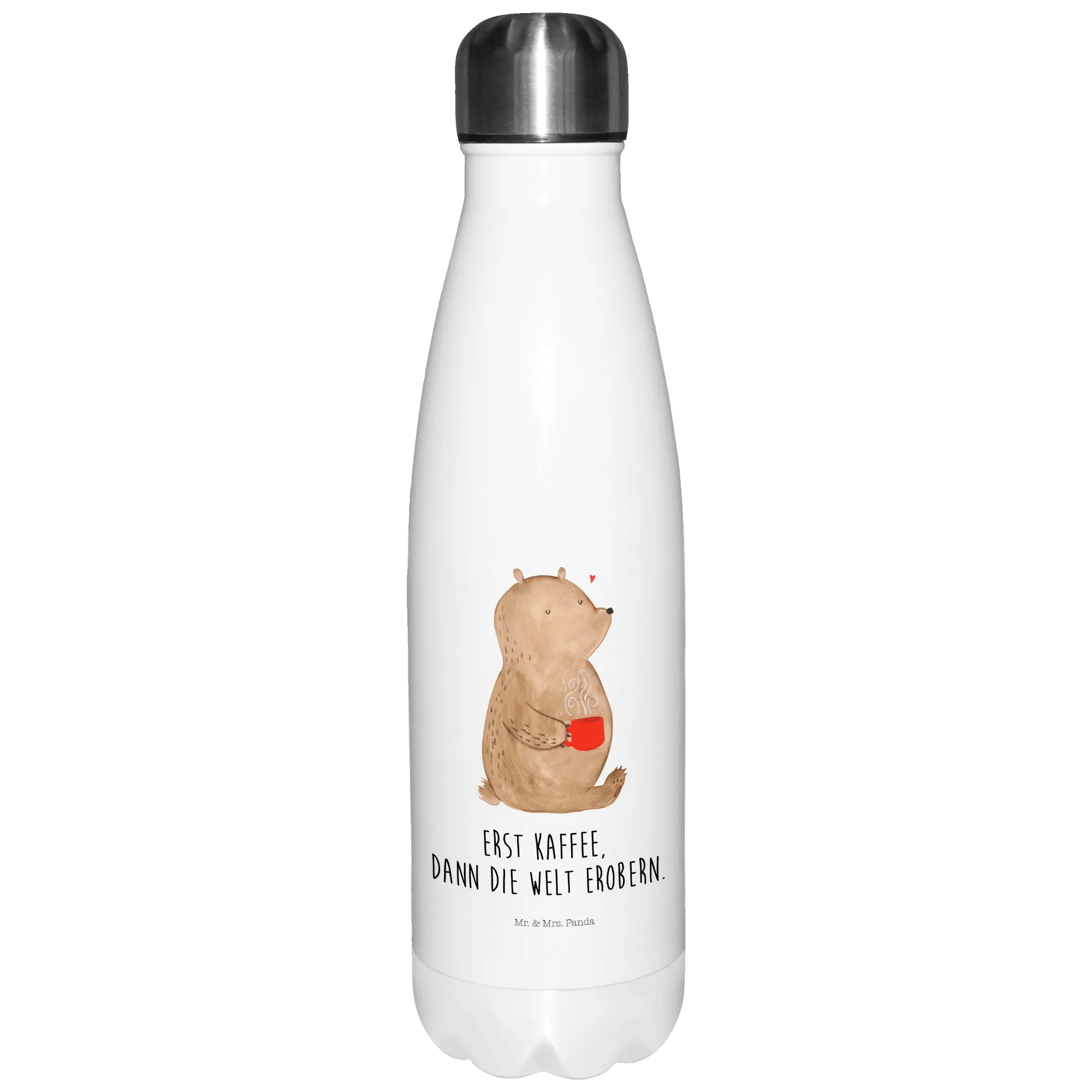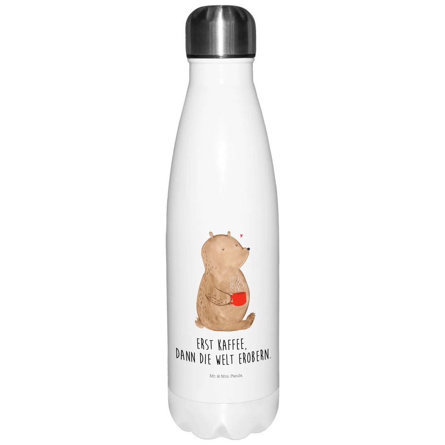 Egal ob beim Wandern, im Büro oder während deiner Morgenroutine - die Thermosflasche begleitet dich überall hin und sorgt dafür, dass du immer mit deinem Lieblingsgetränk versorgt bist. Der praktische Schraubverschluss macht das Trinken unterwegs besonders einfach. Der freundliche Bär auf der Flasche erinnert dich jeden Tag daran: 'Erst Kaffee, dann die Welt erobern!'